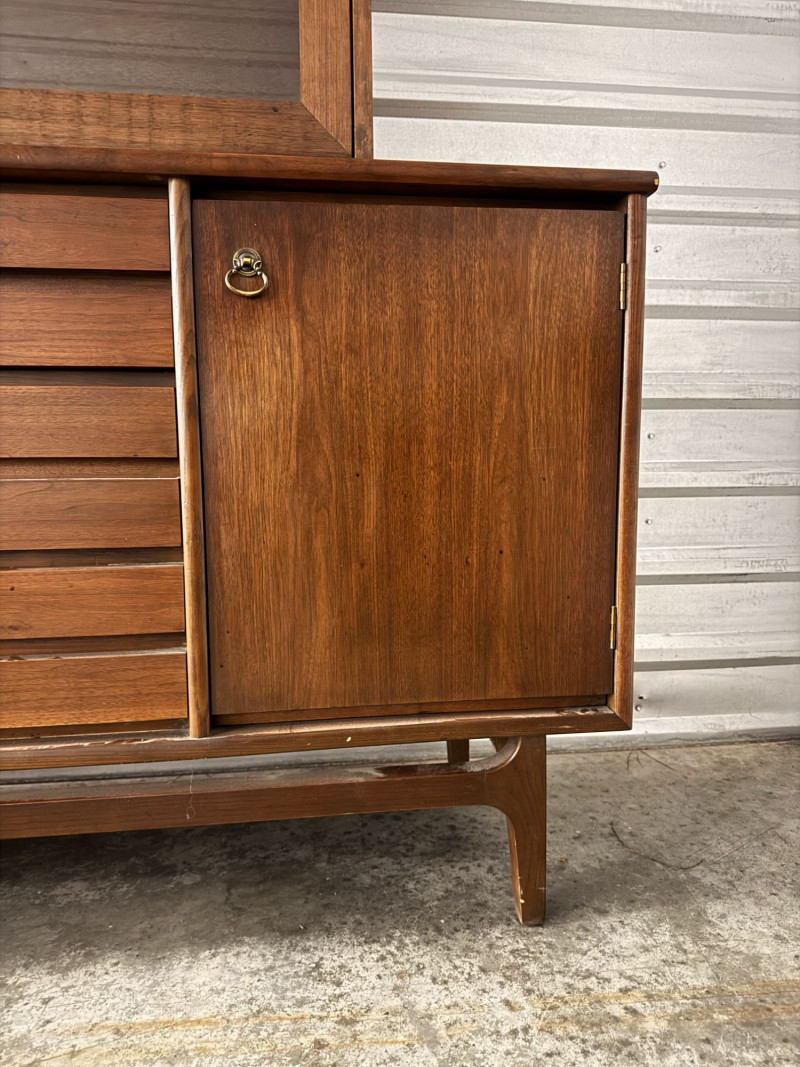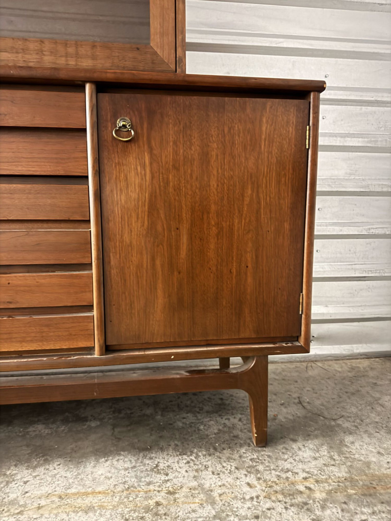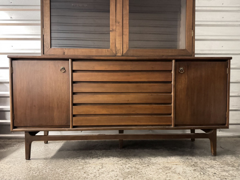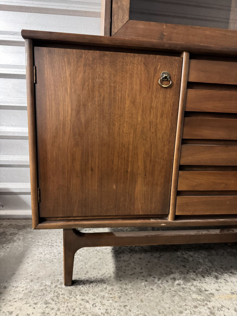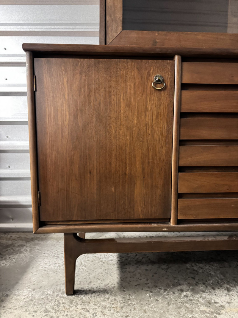 Vintage Mid Century Modern Stanley Credenza Glass Display Hutch - 2pc