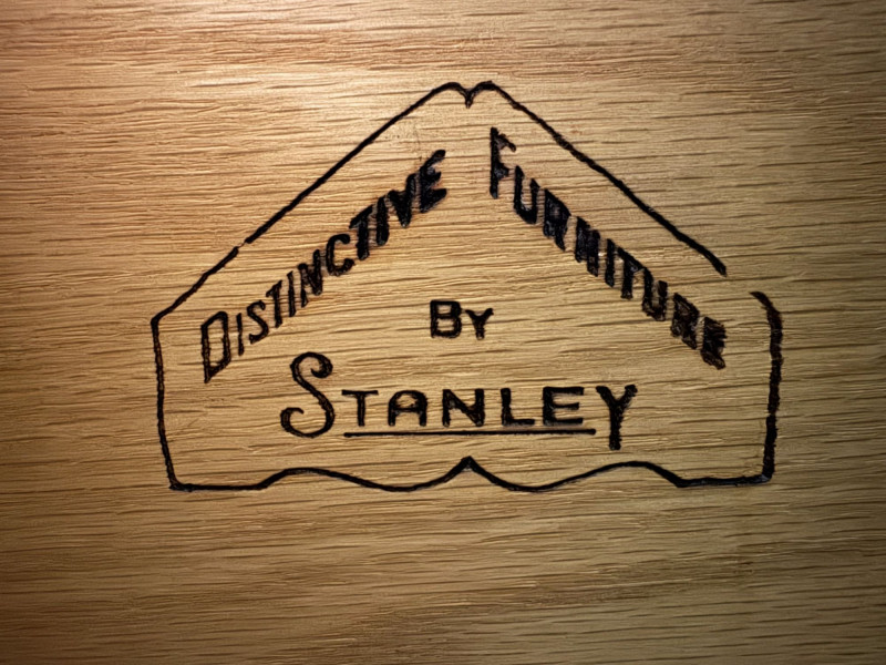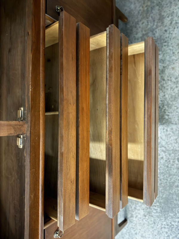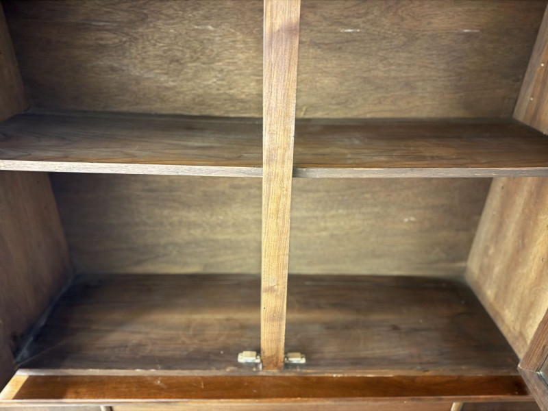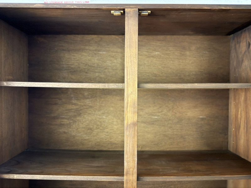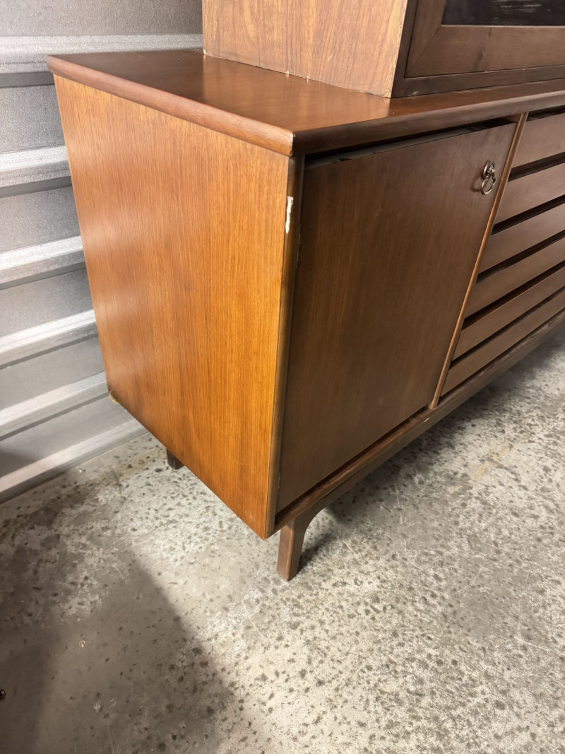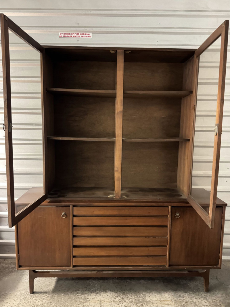Vintage Mid Century Modern Stanley Credenza Glass Display Hutch - 2pc