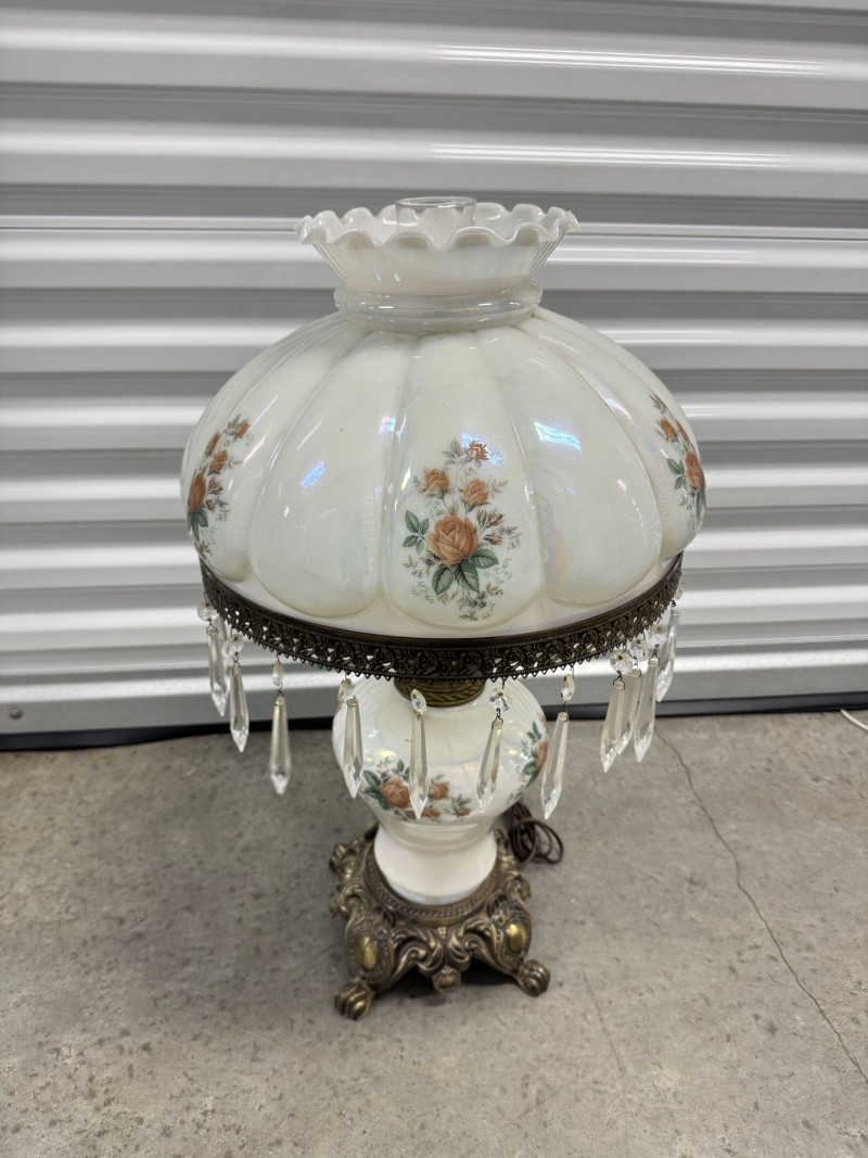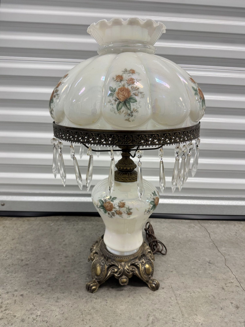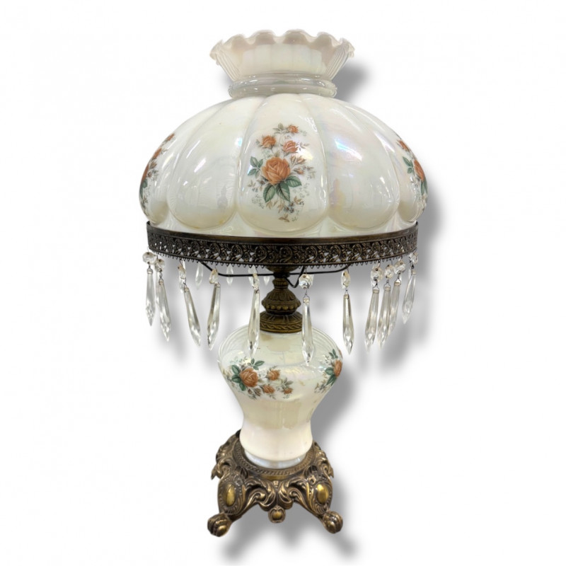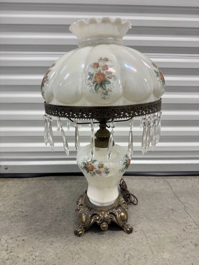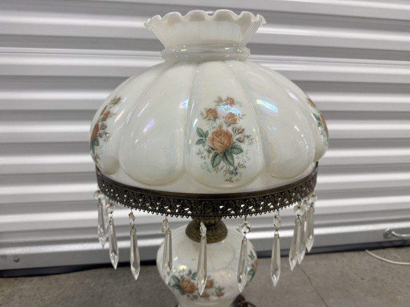 Victorian Style Parlor Lamp - Milk Glass Floral Shade & Crystal Prisms.