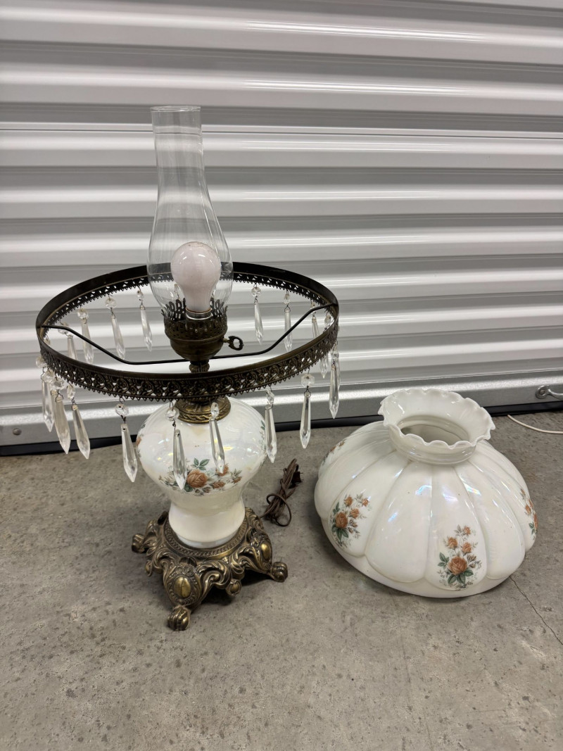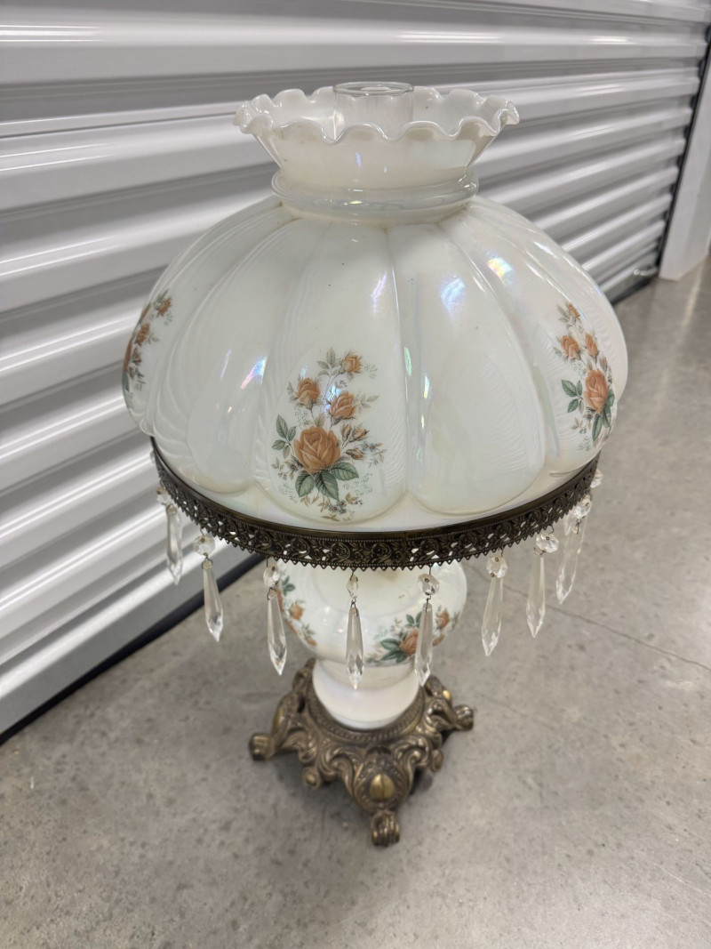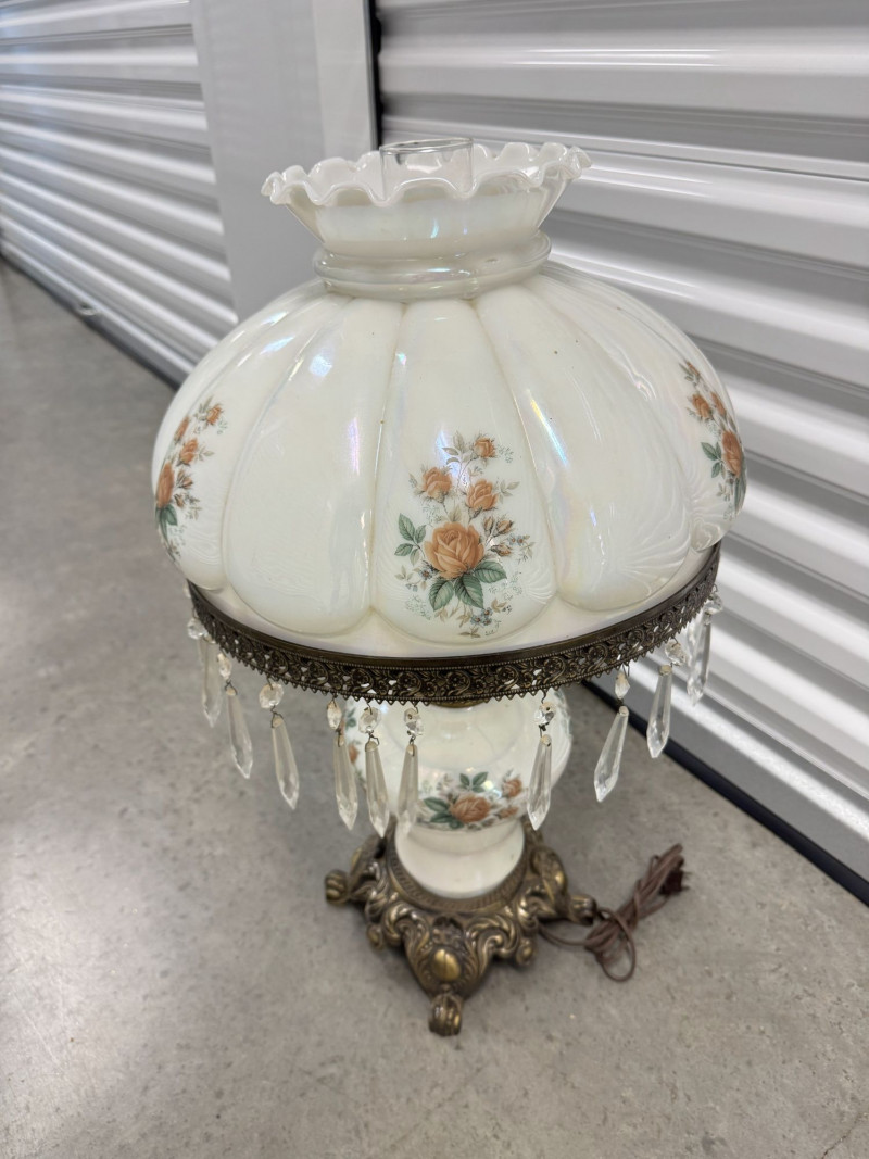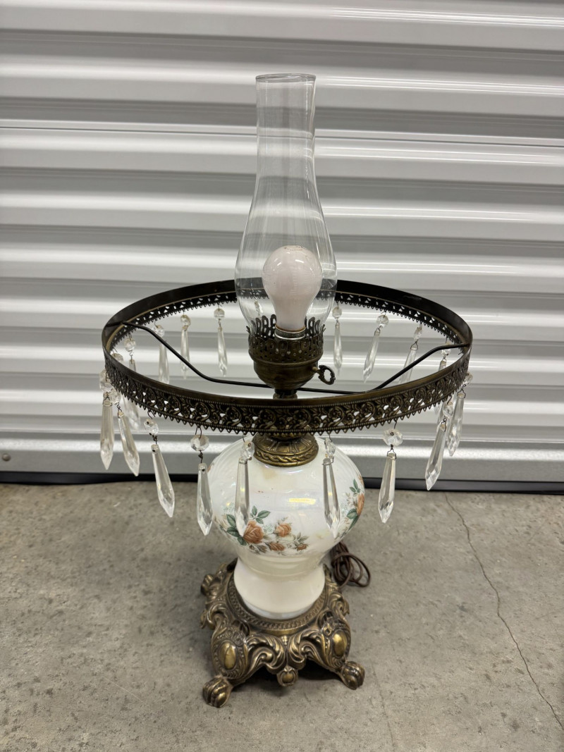 Victorian Style Parlor Lamp - Milk Glass Floral Shade & Crystal Prisms.