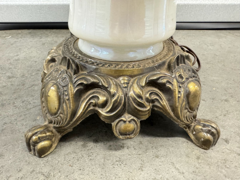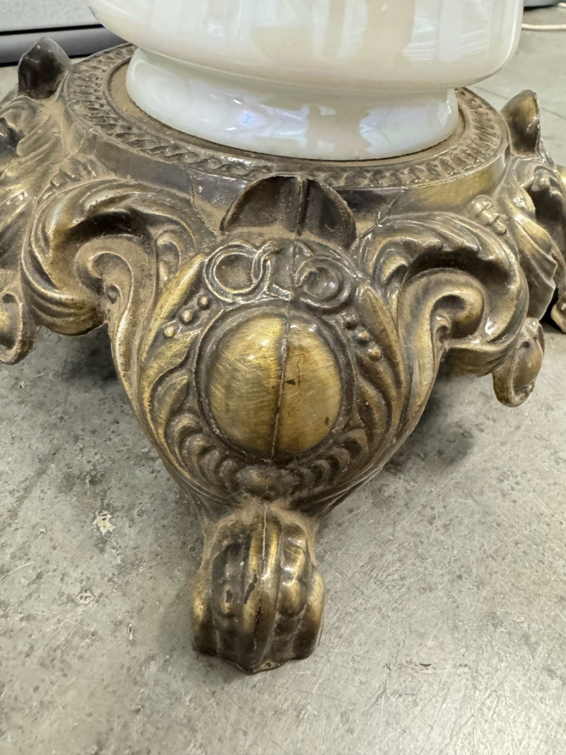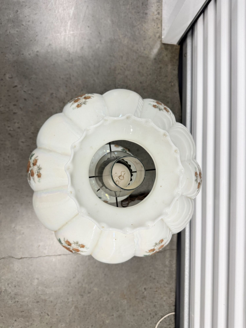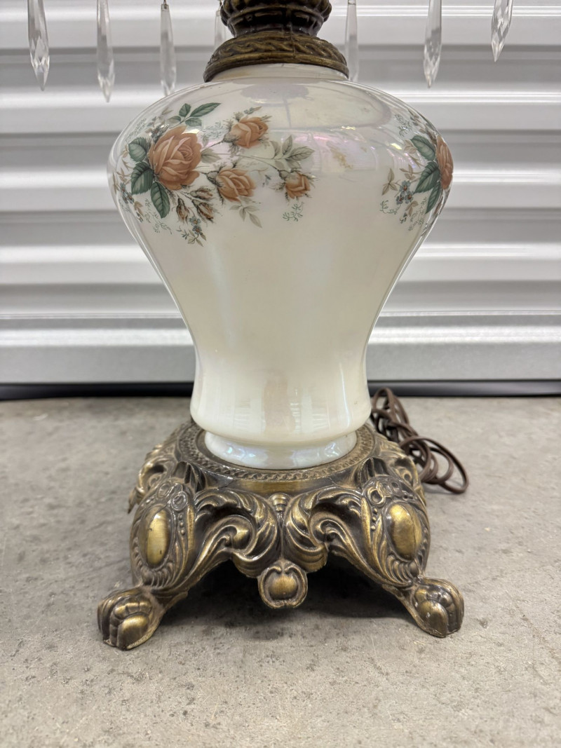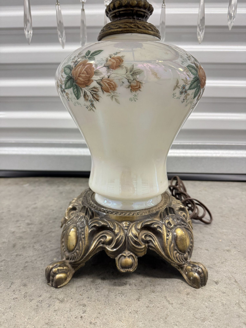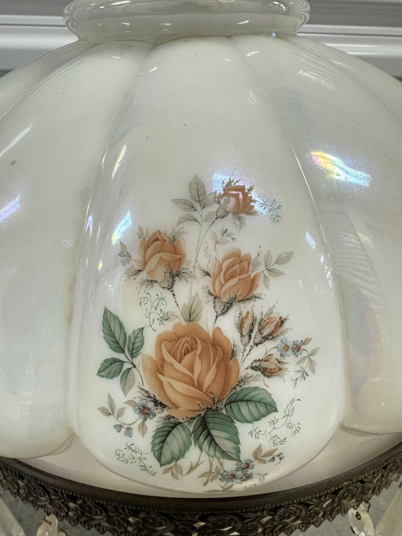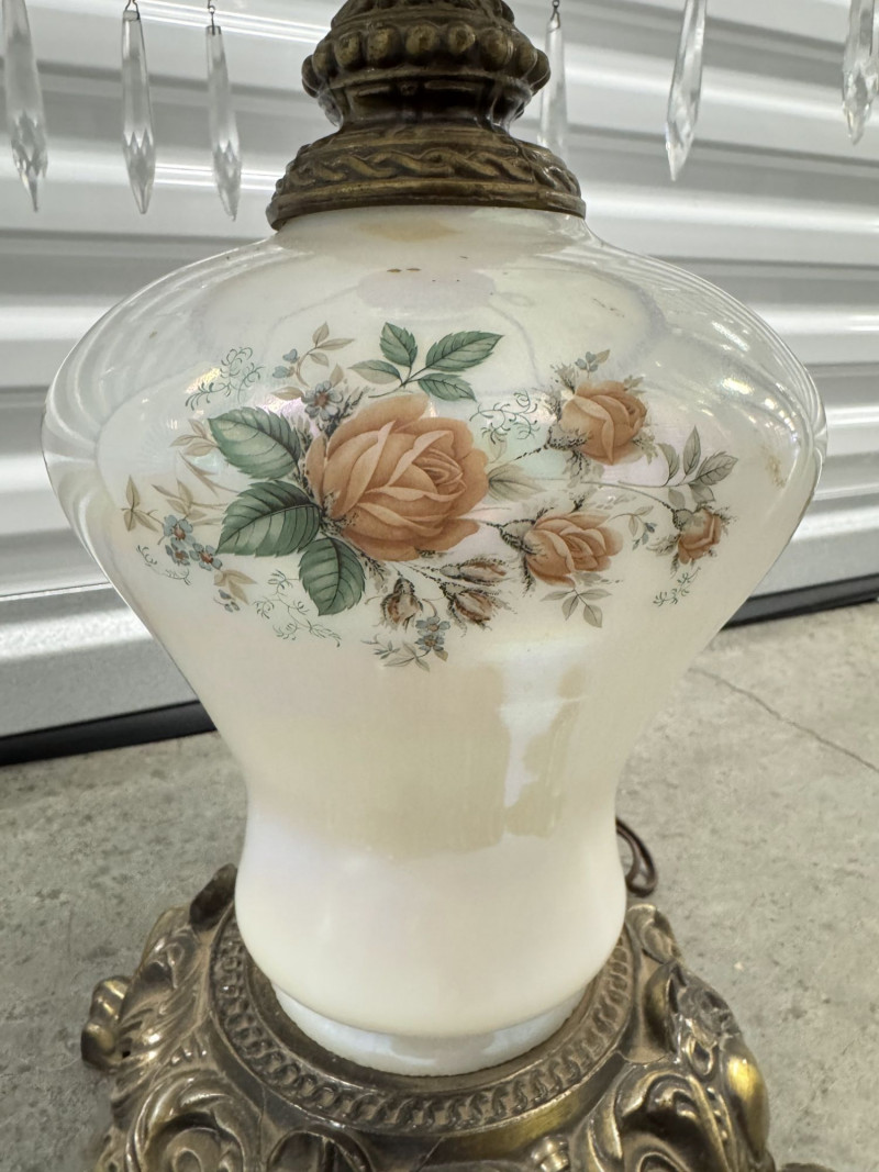 Lot # 60 - Victorian Style Parlor Lamp - Milk Glass Floral Shade & Crystal Prisms