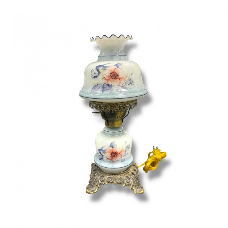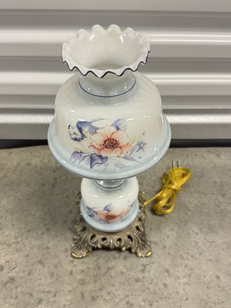 Victorian Style Hurricane Lamp - Blue Floral Ruffled Glass Shade.