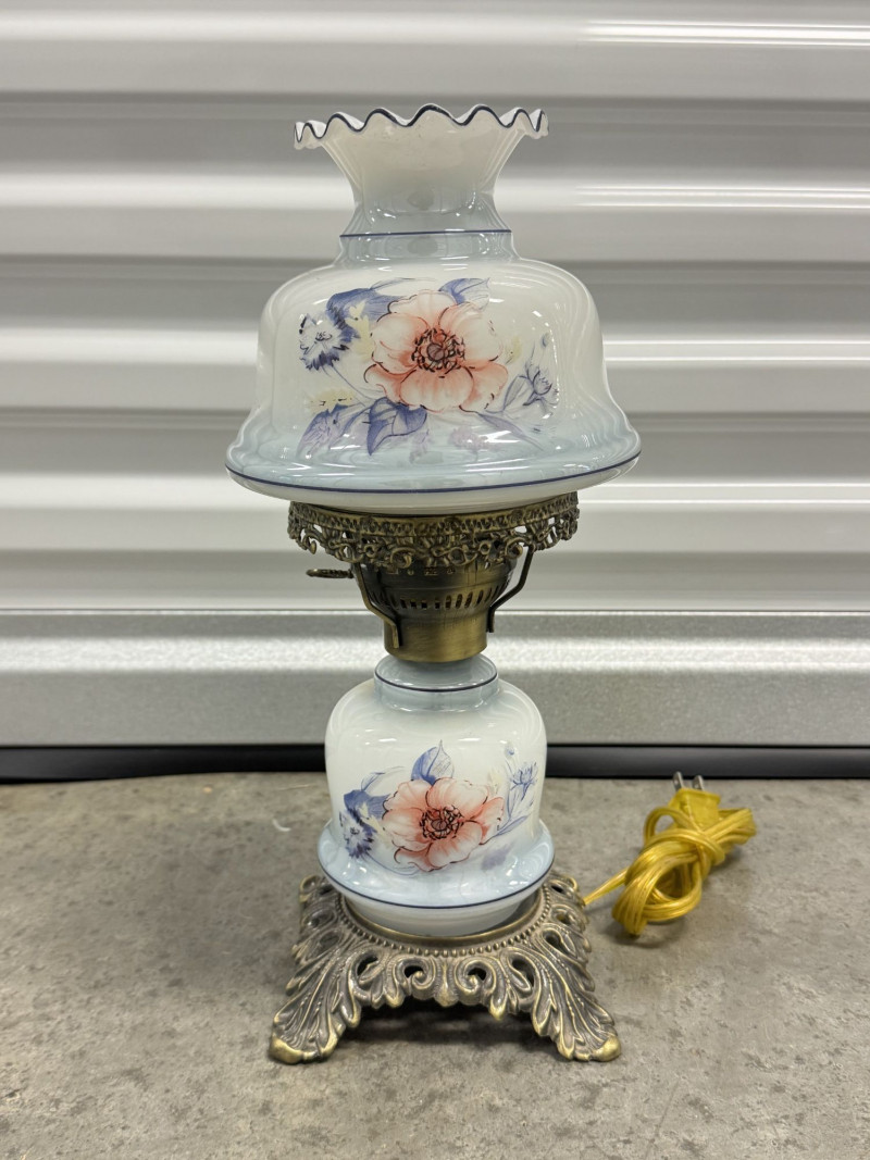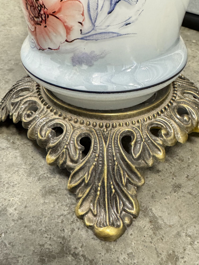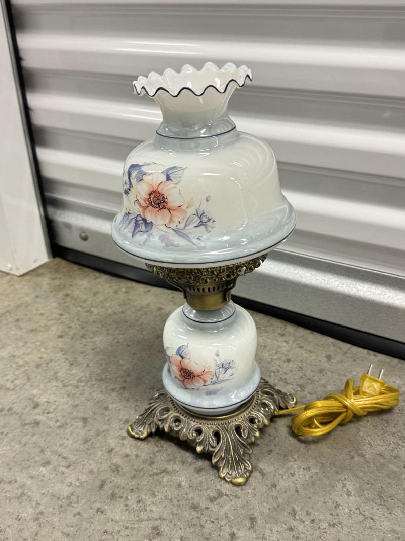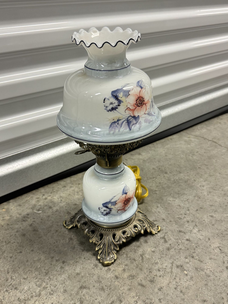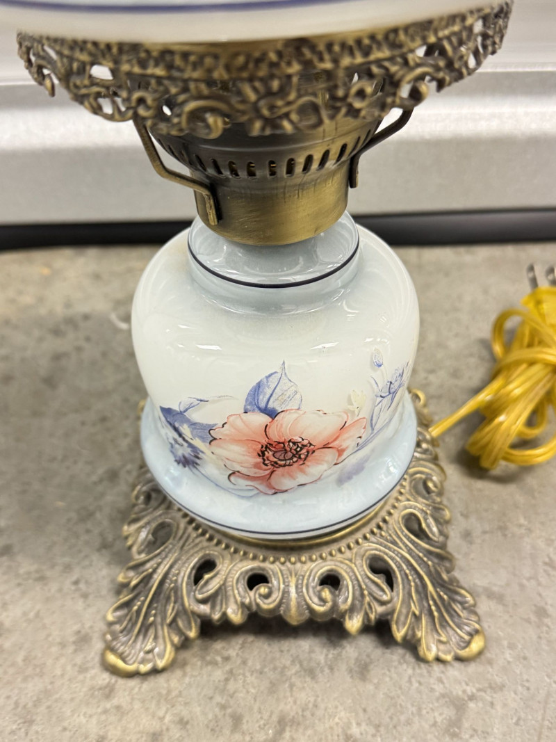 Lot # 76 - Victorian Style Hurricane Lamp - Blue Floral Ruffled Glass Shade