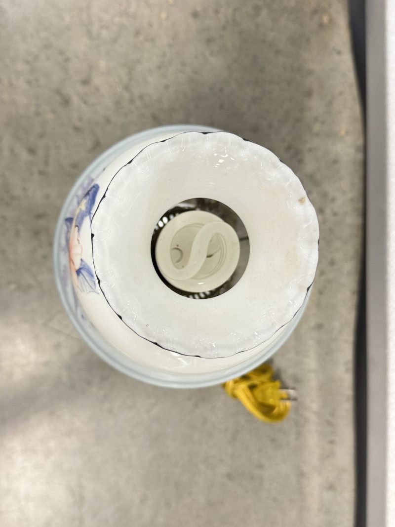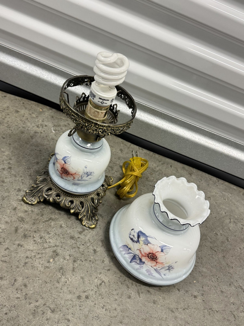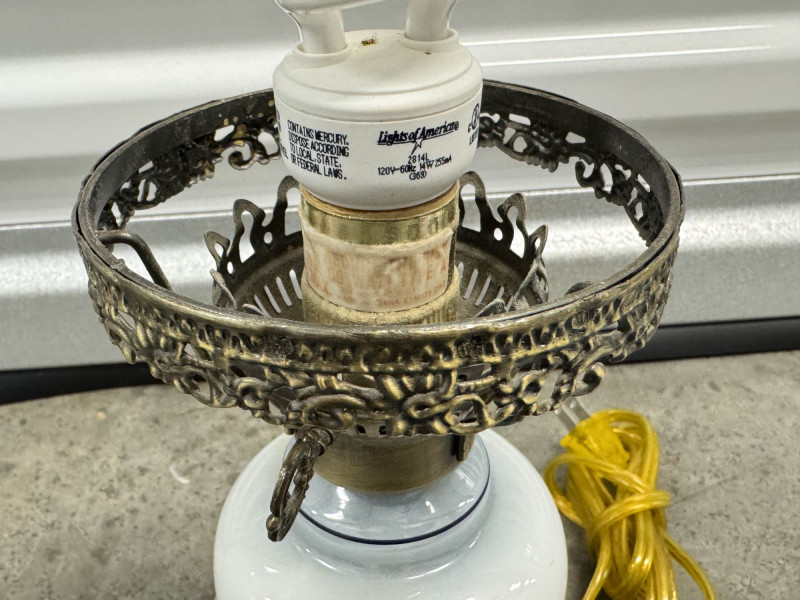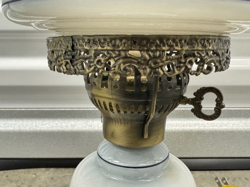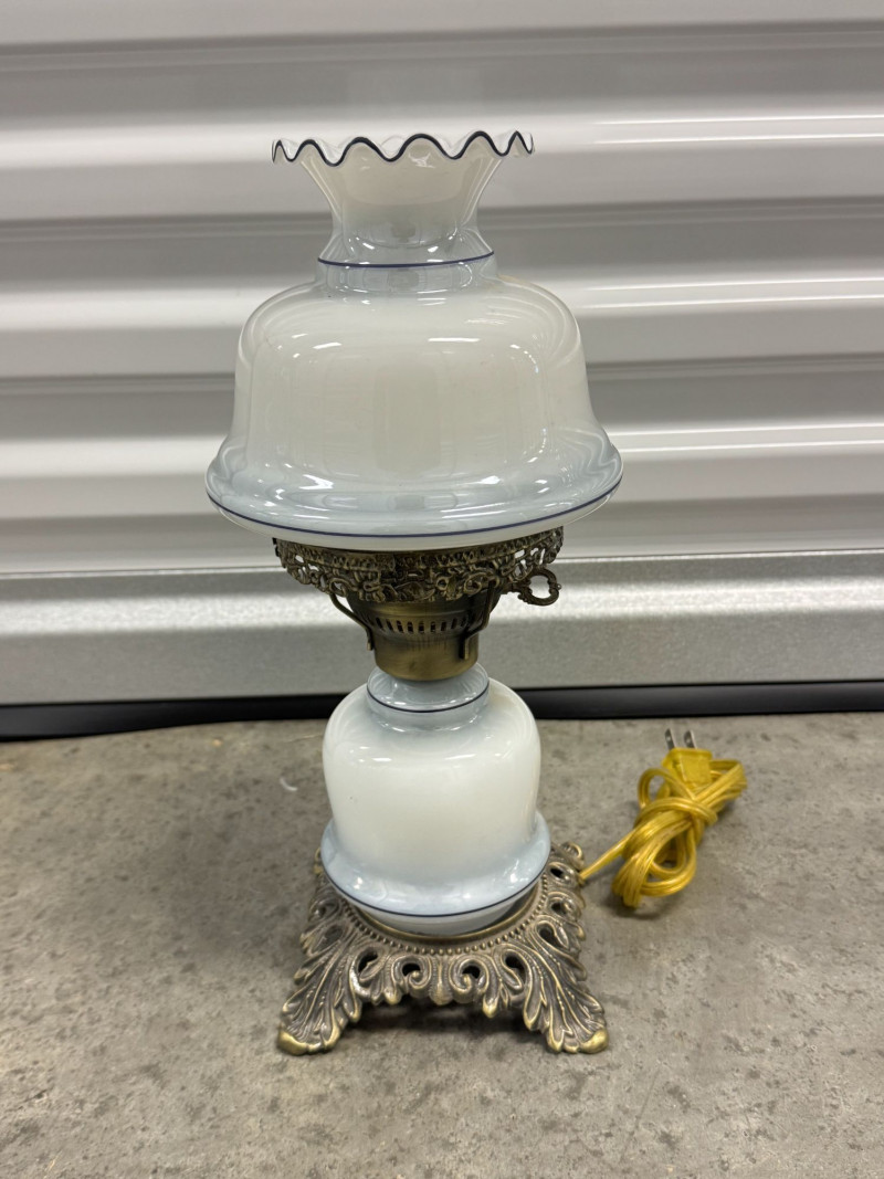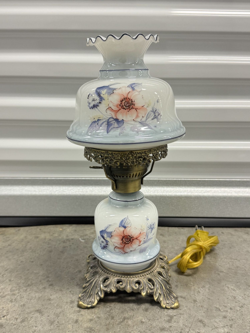Lot # 76 - Victorian Style Hurricane Lamp - Blue Floral Ruffled Glass Shade