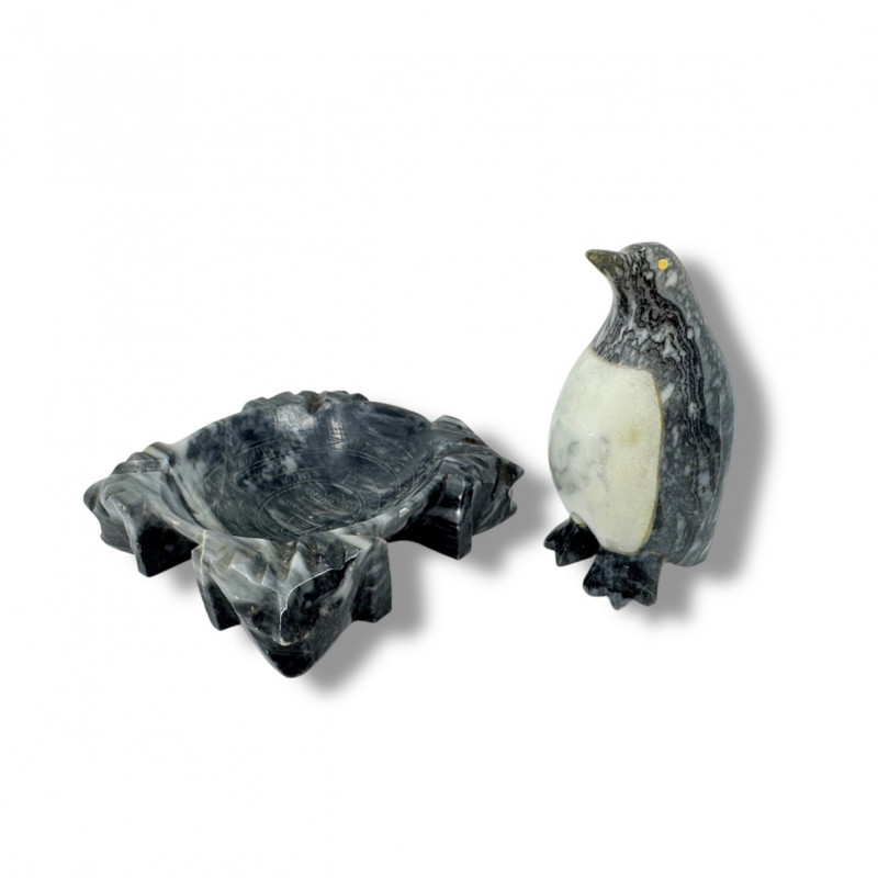 Grey Stone Aztec Style Ashtray w/ Matching Penguin Figurine.