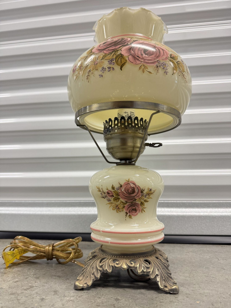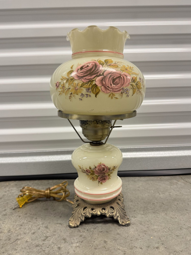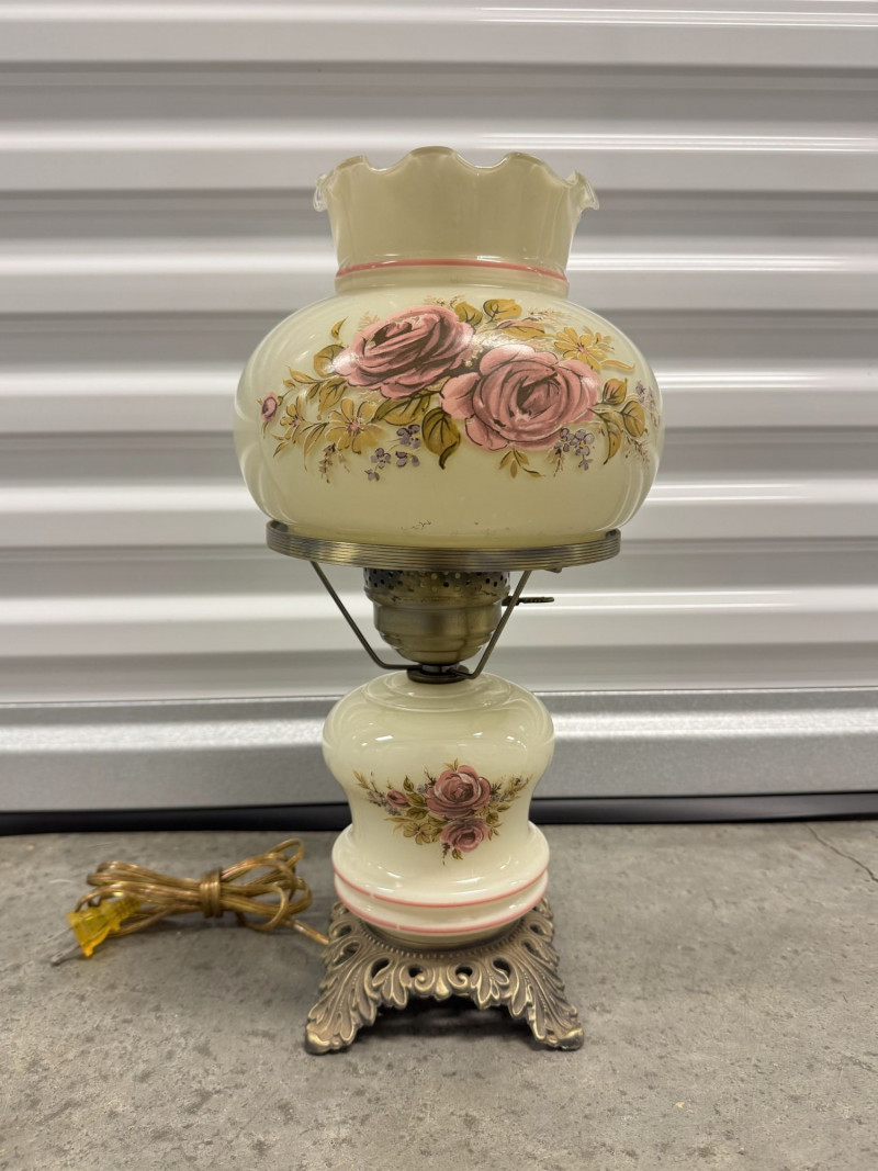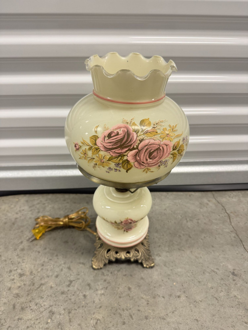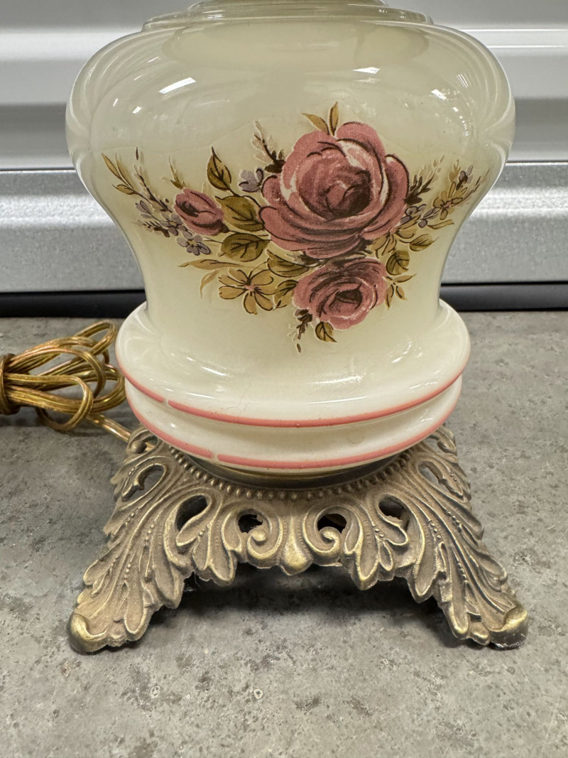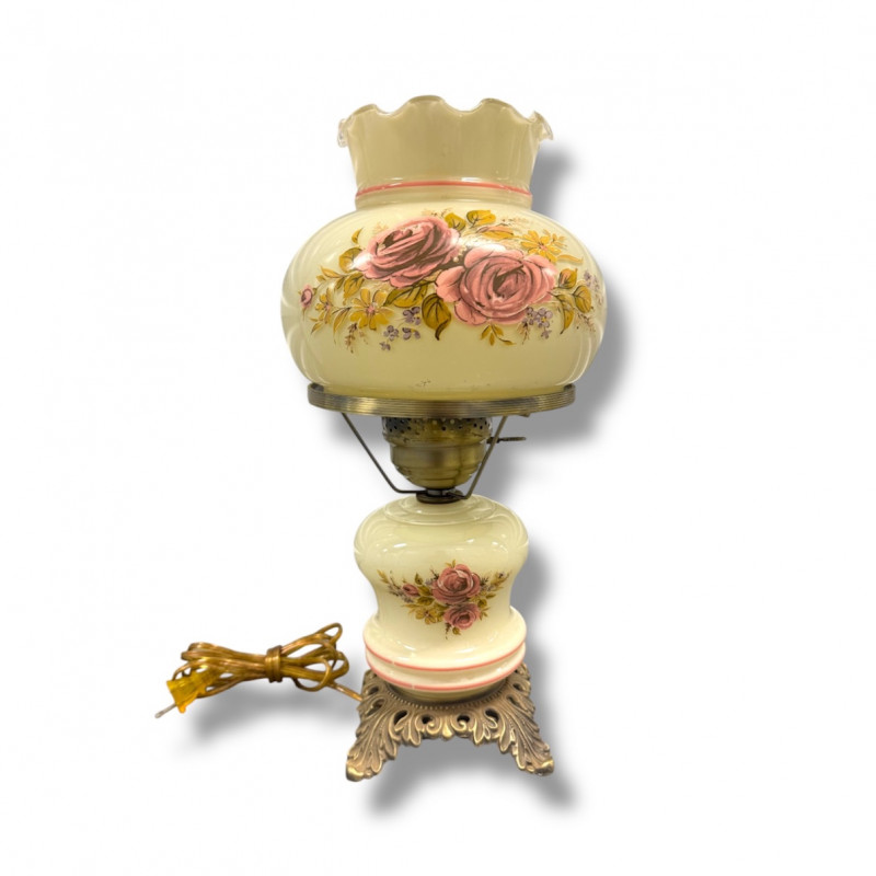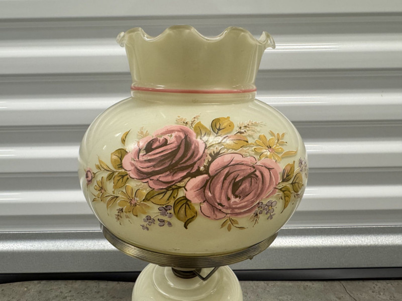 Victorian Style Hurricane Lamp - Pink Rose w/ Ruffled Glass Shade.