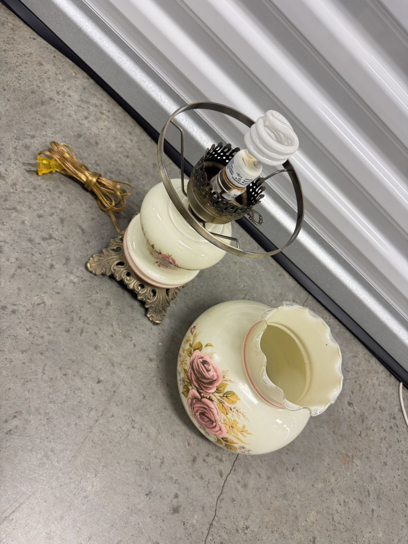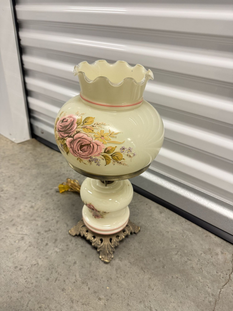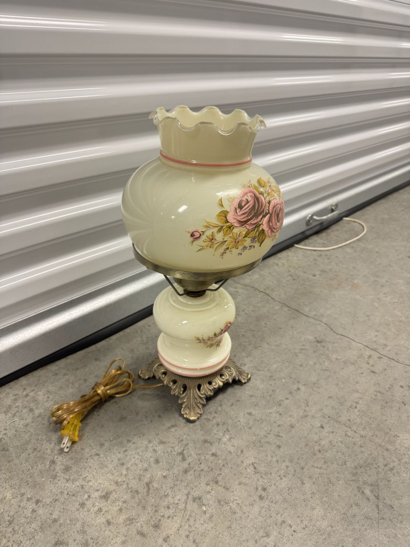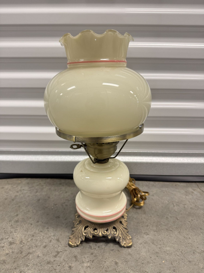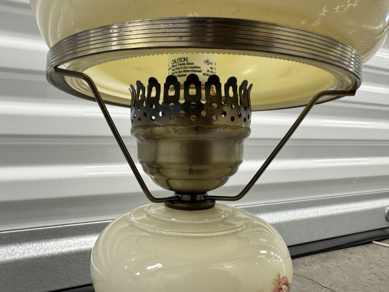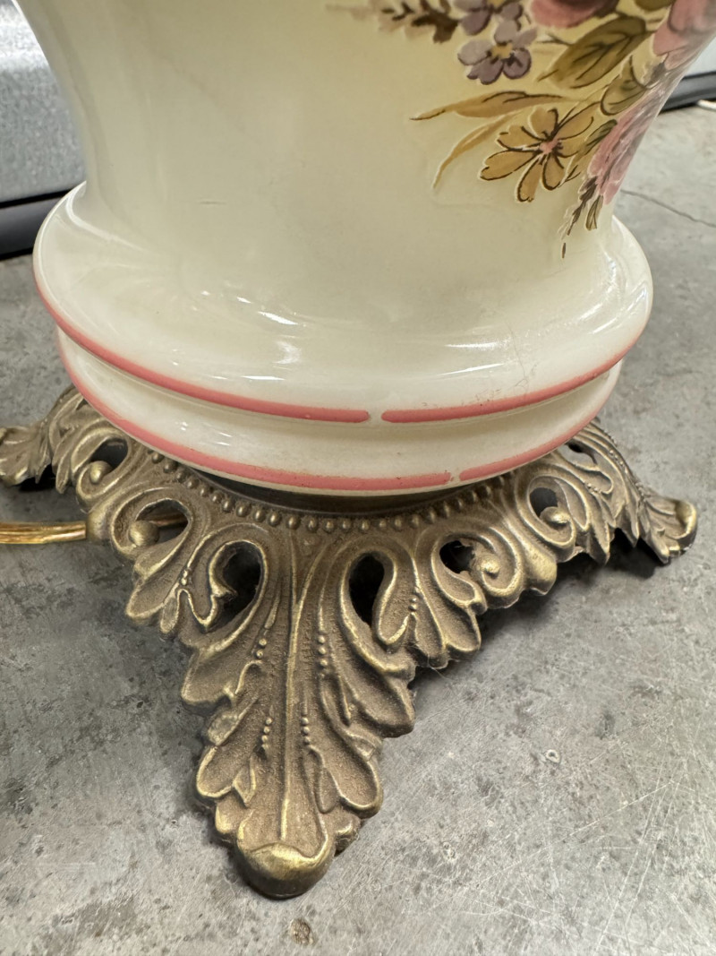 Lot # 82 - Victorian Style Hurricane Lamp - Pink Rose w/ Ruffled Glass Shade
