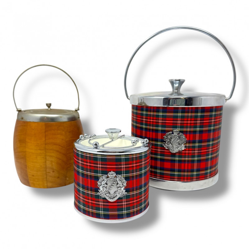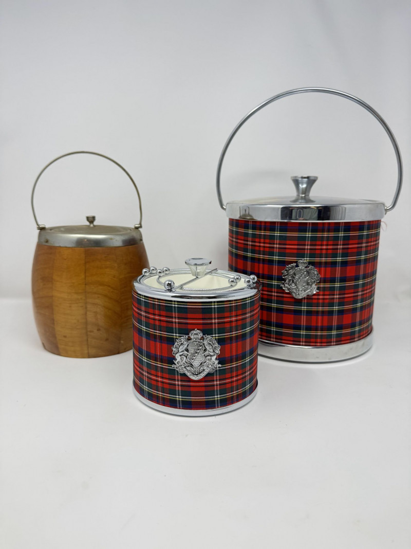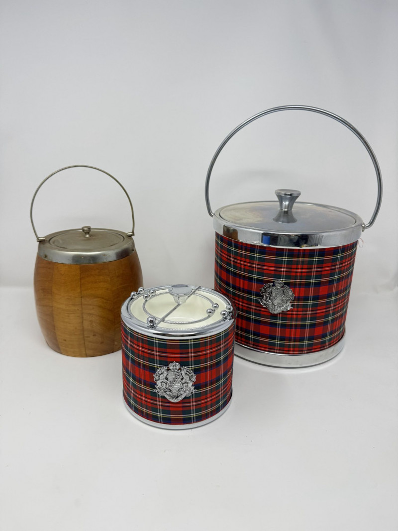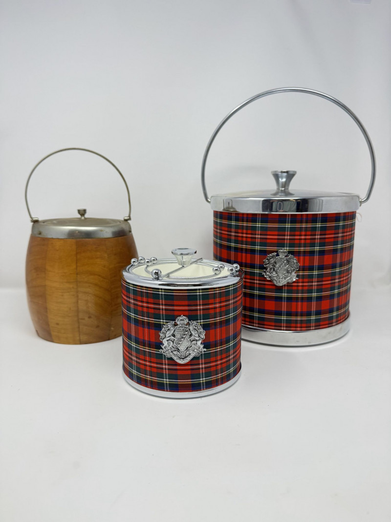 Lot # 121 - Vintage Ice Buckets – Tartan Plaid & Wood Barrel Style, Set of 3