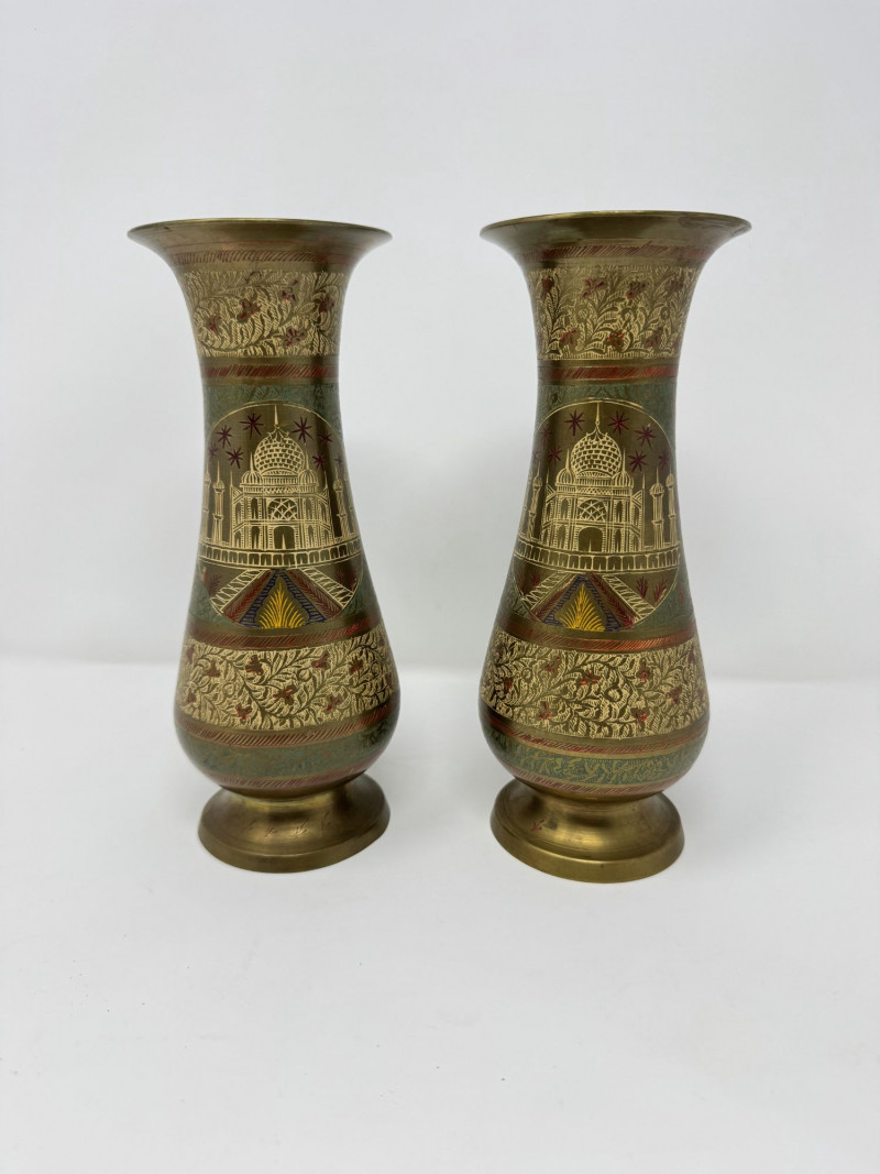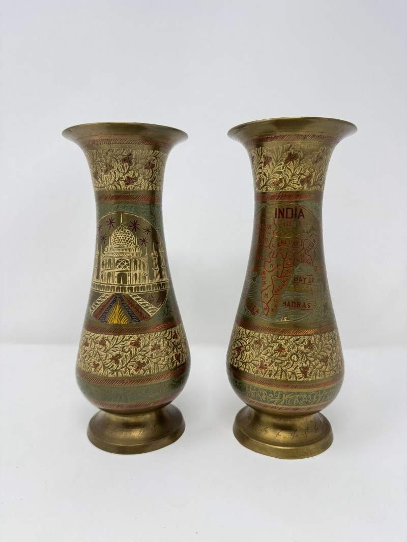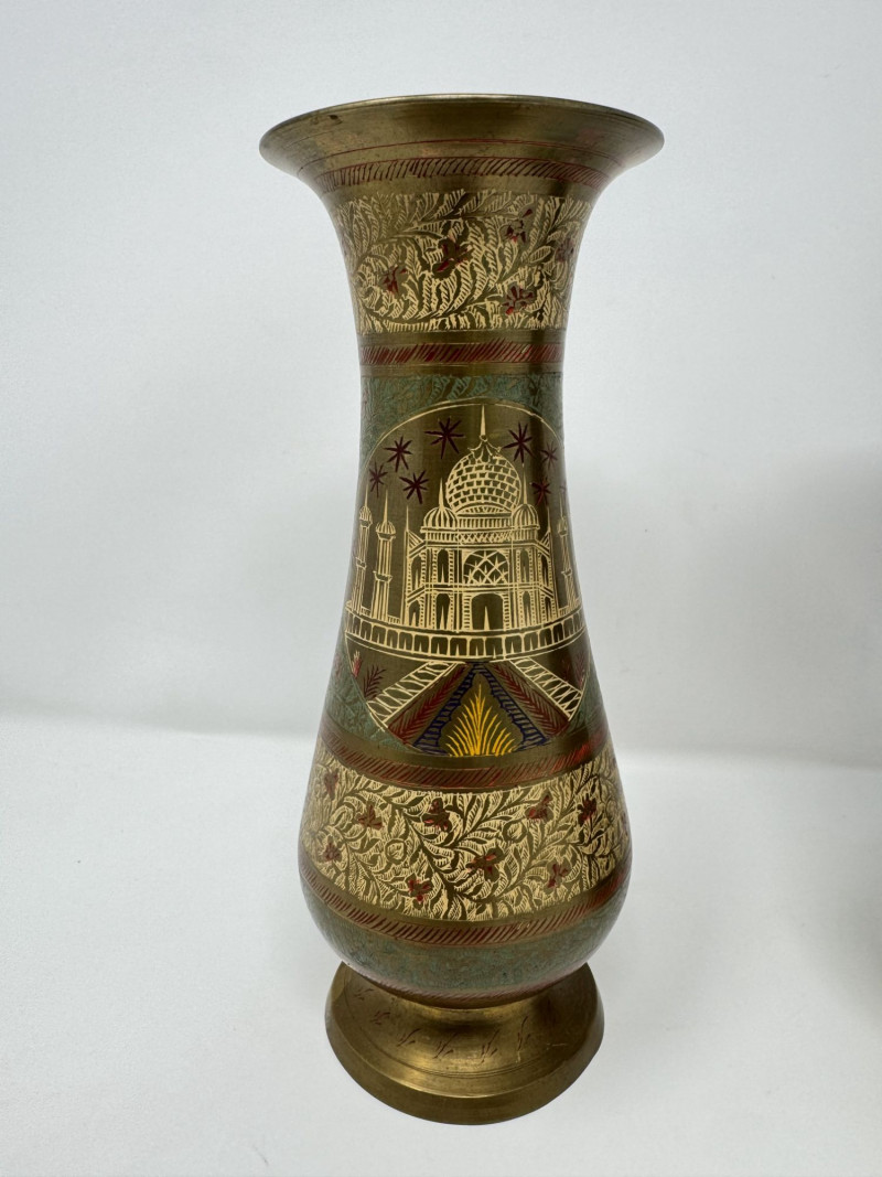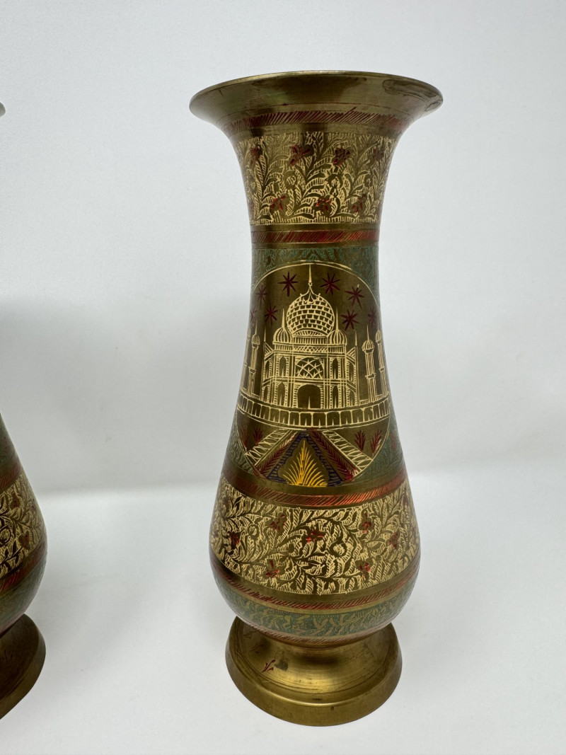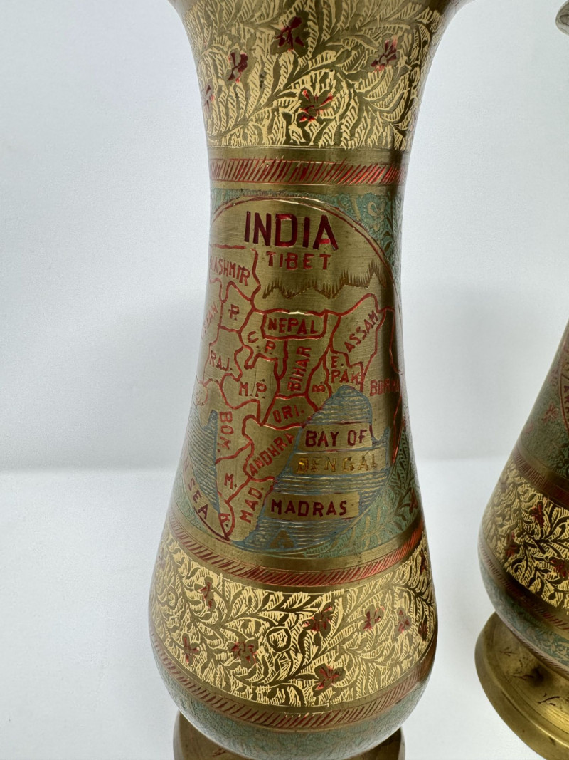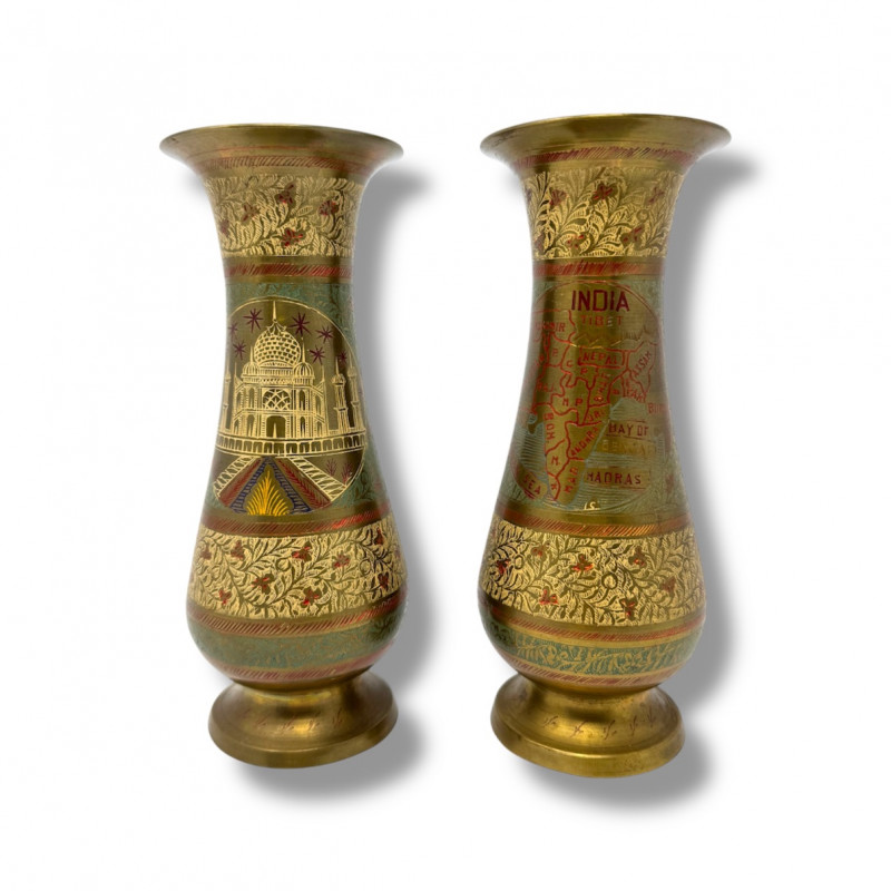 Antique Indian Brass Vases w/ Taj Mahal & Map Engraved Design.