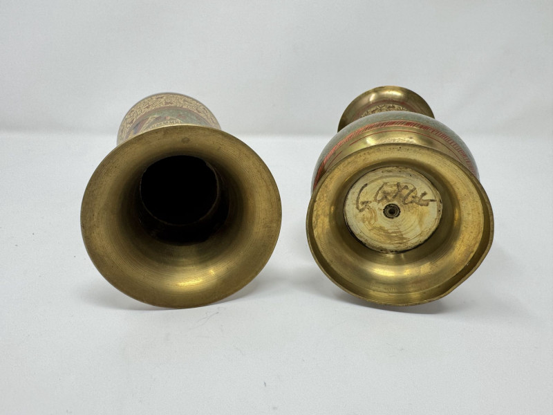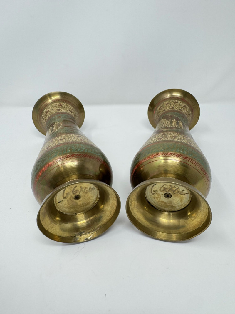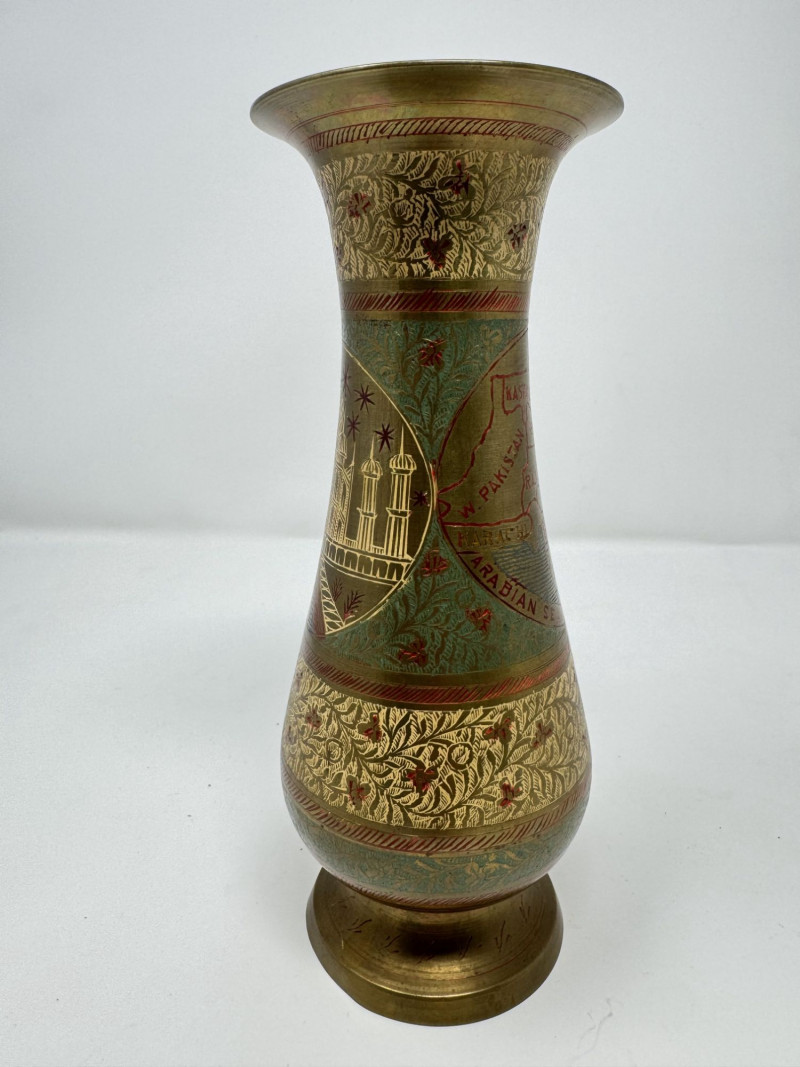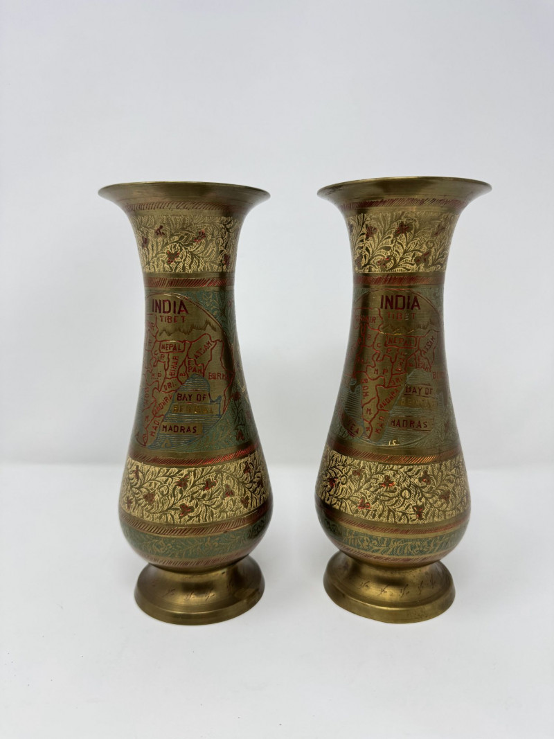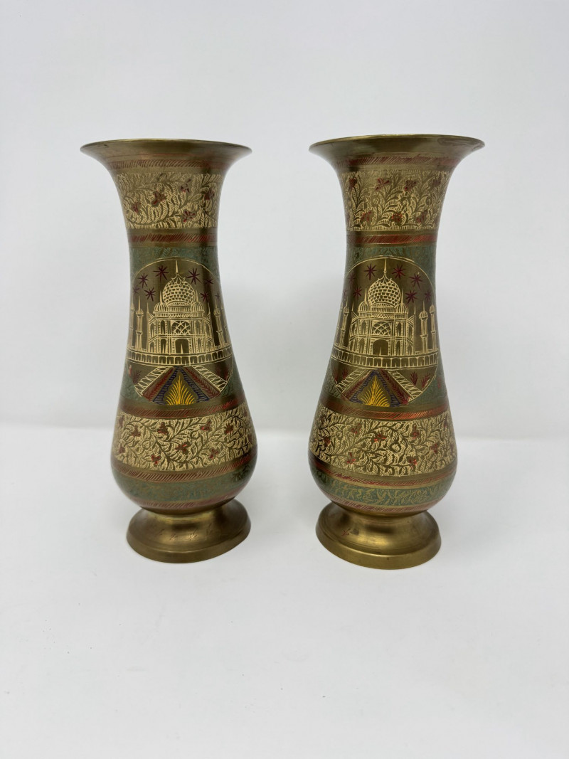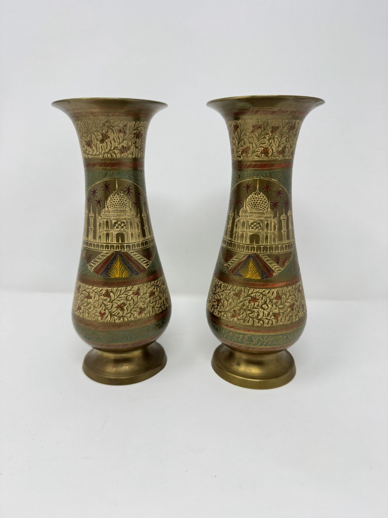 Antique Indian Brass Vases w/ Taj Mahal & Map Engraved Design.