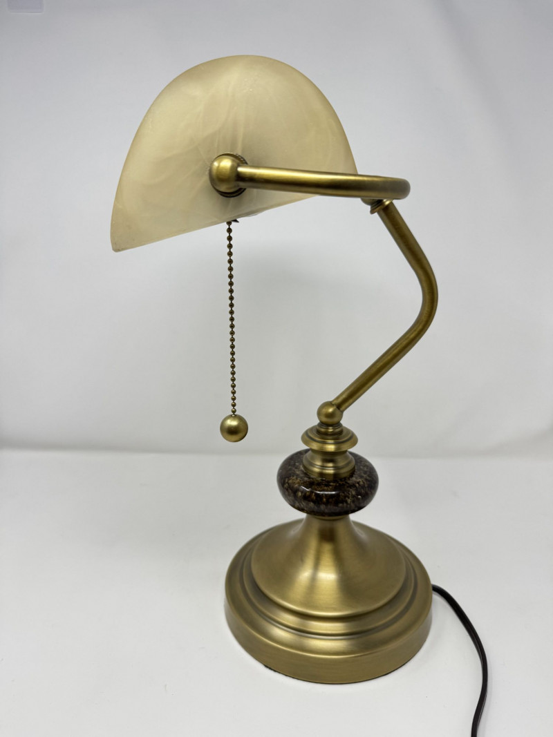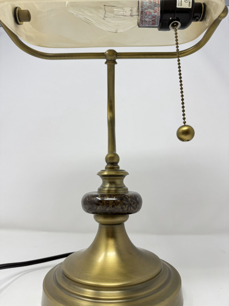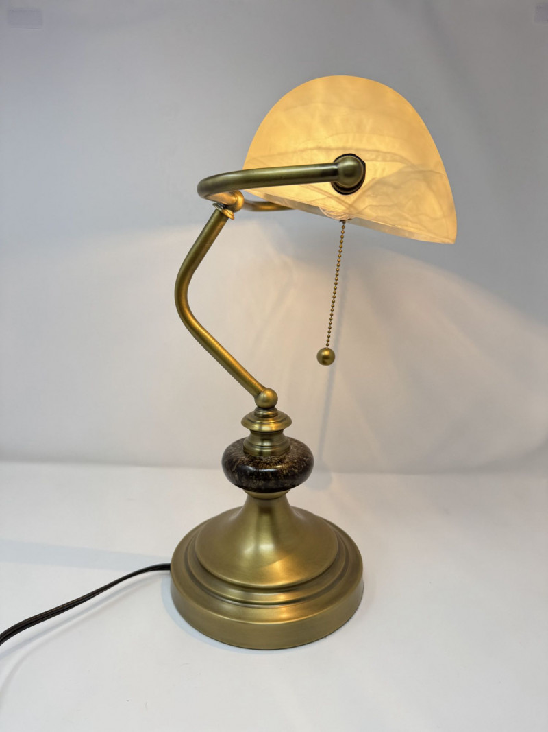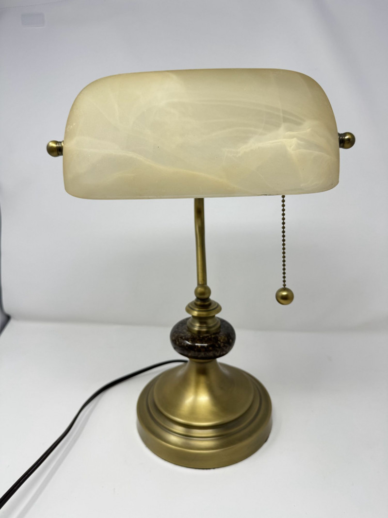 Brass Desk Lamp w/ Alabaster Style Shade & Pull Chain.