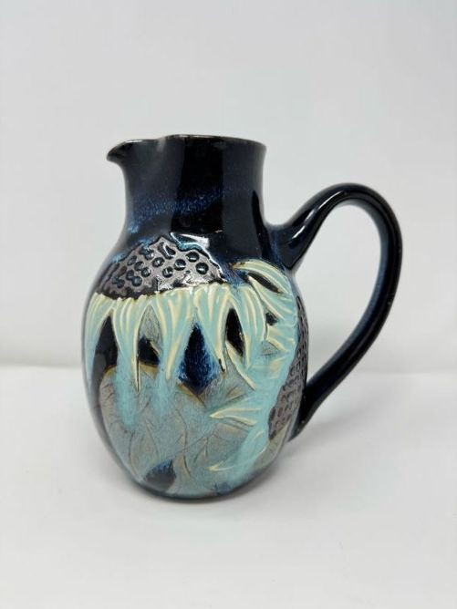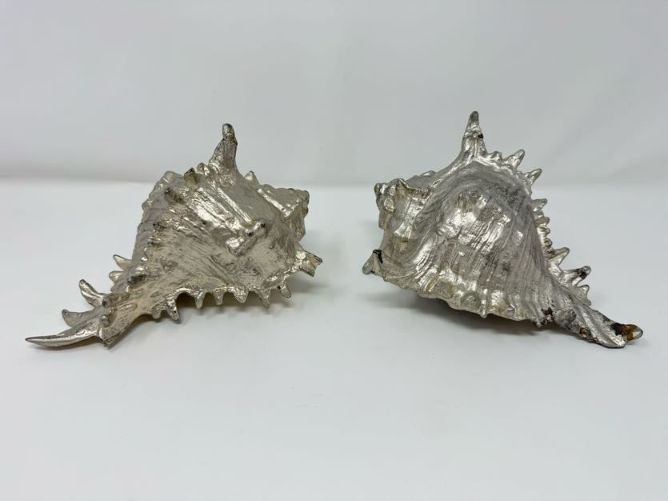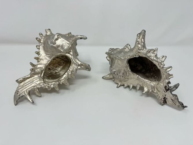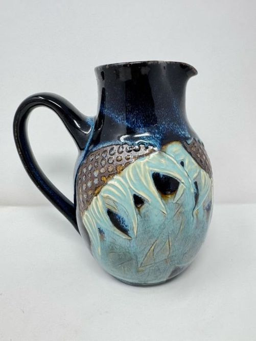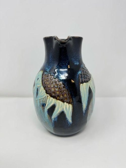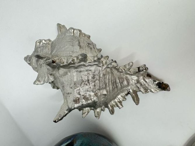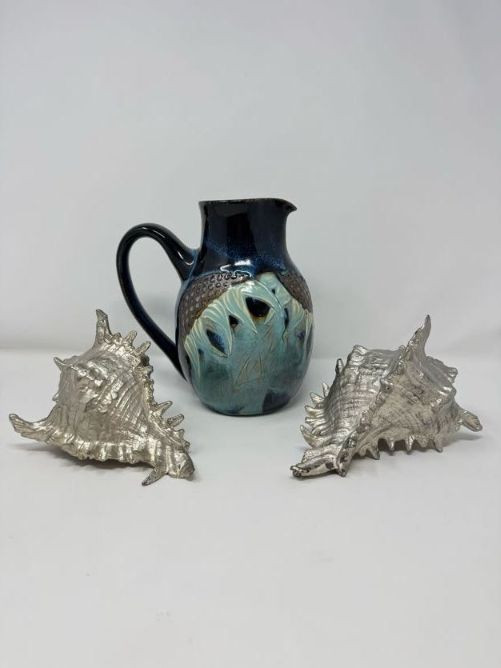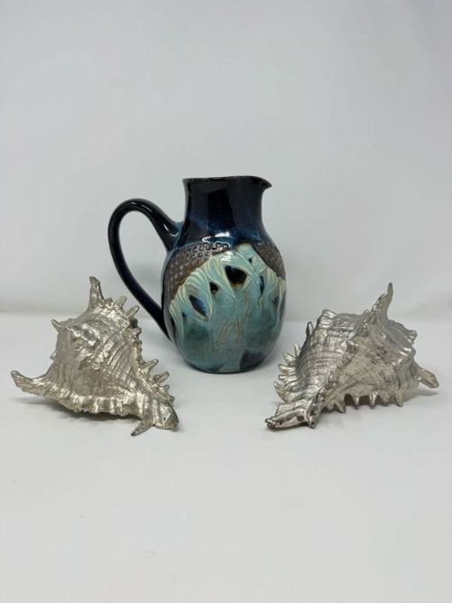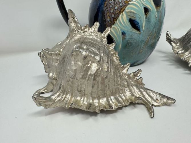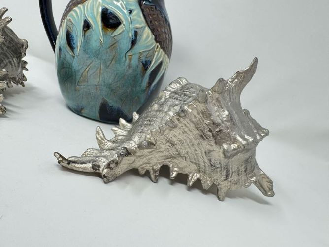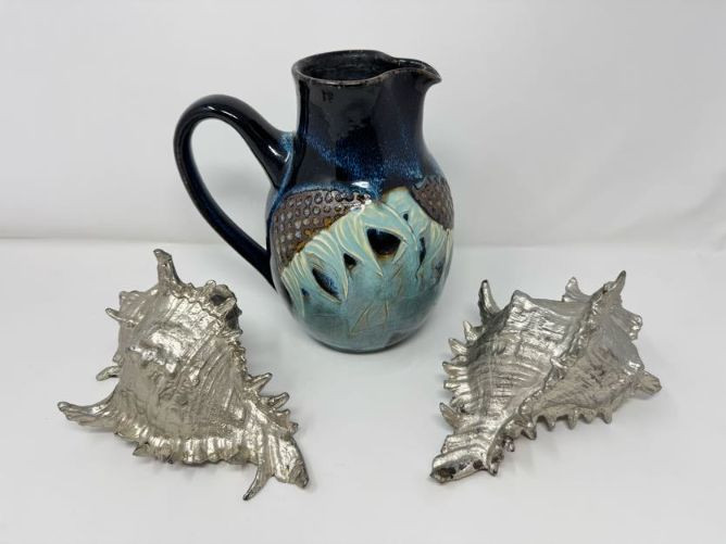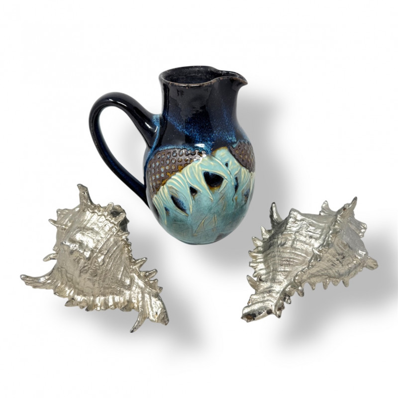 Studio Pottery Pitcher Vase & Decorative Conch Shell Sculptures.