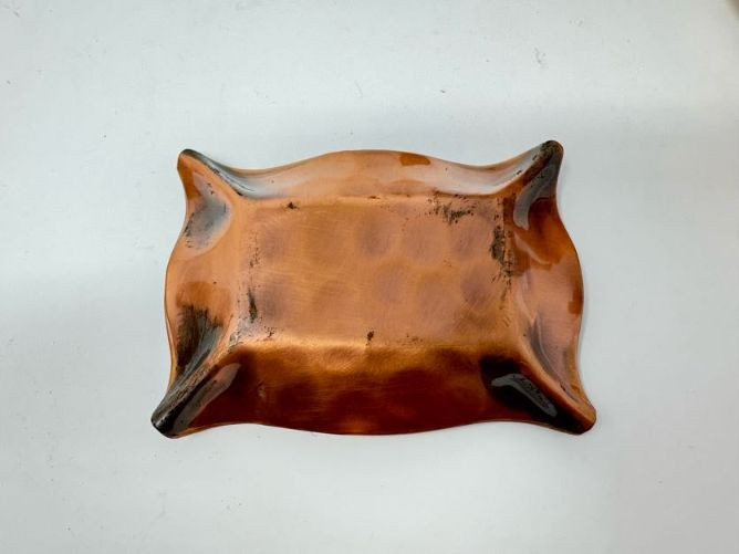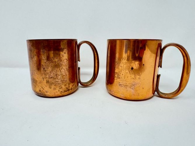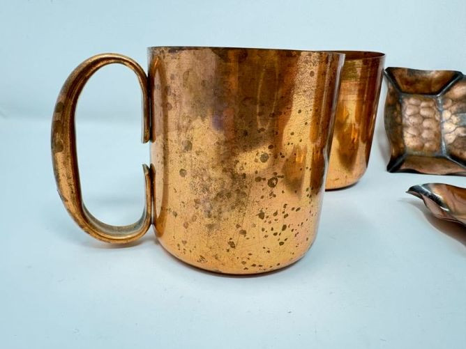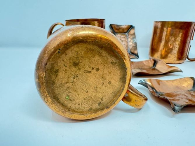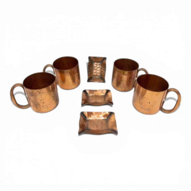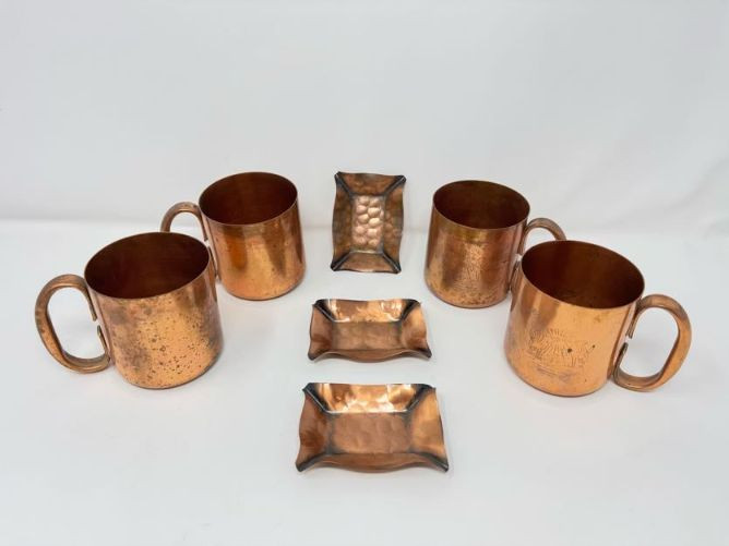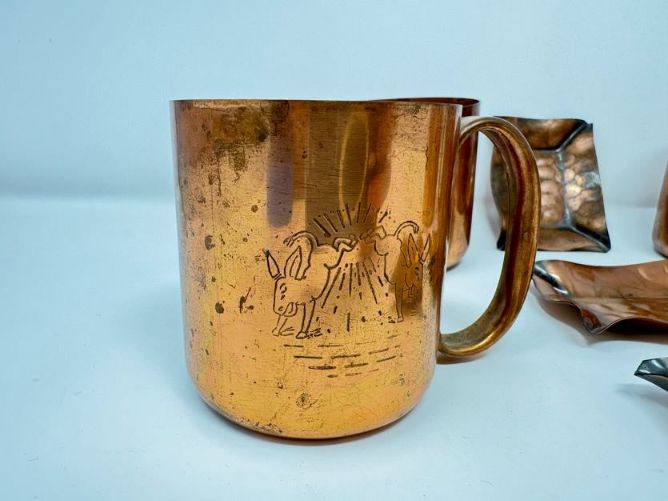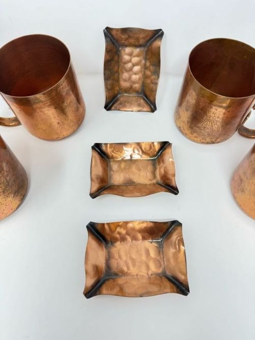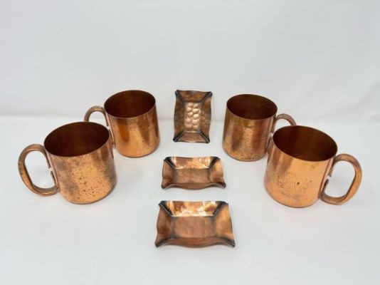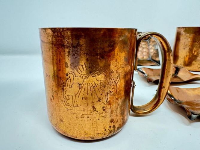 Copper Mugs w/ Etched Donkey + Hammered Copper Ashtrays.