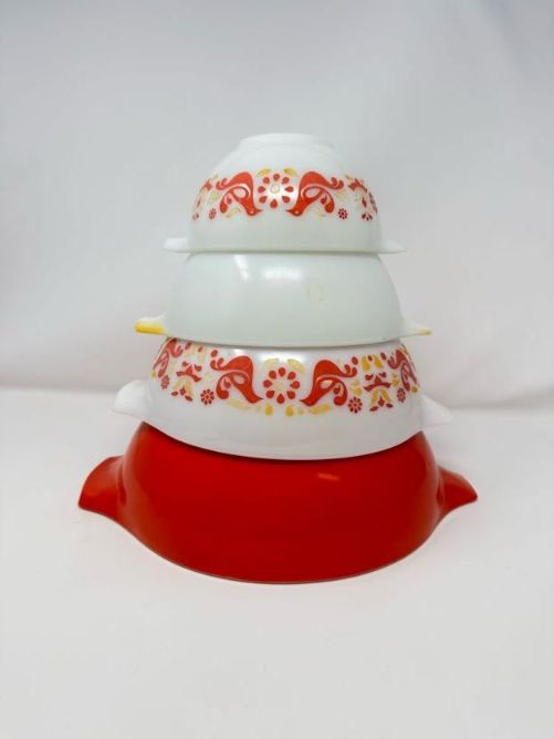 Set of 4 Pyrex Mixing Bowls - Friendship Pattern, Milk Glass, & Red.