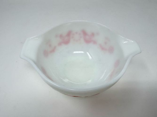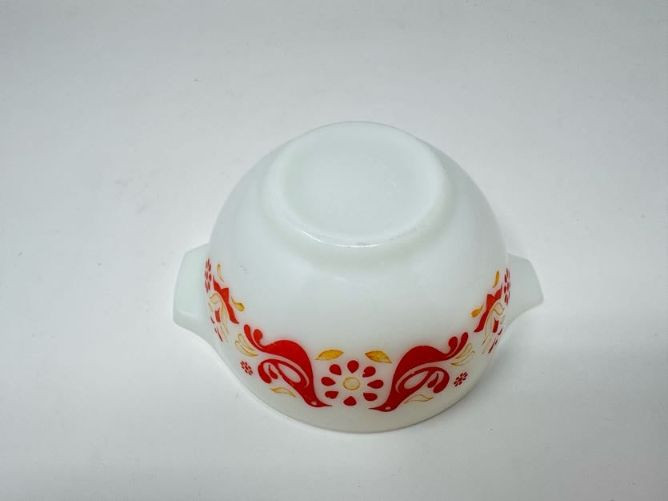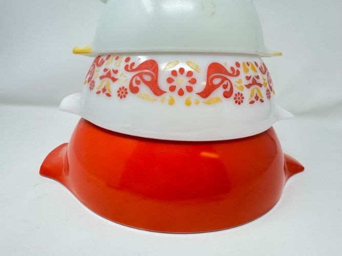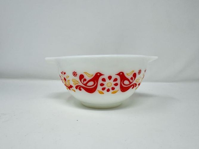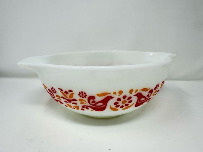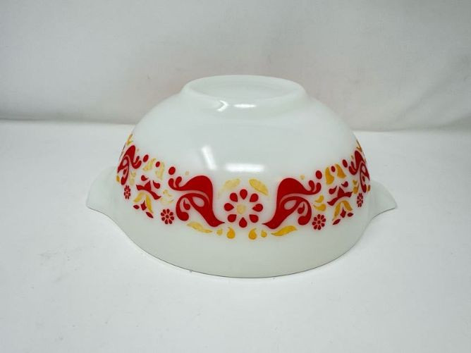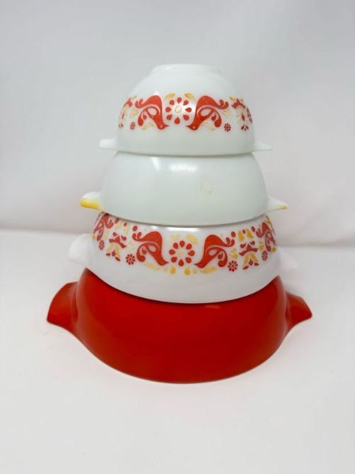 Lot # 161 - Set of 4 Pyrex Mixing Bowls - Friendship Pattern, Milk Glass, & Red