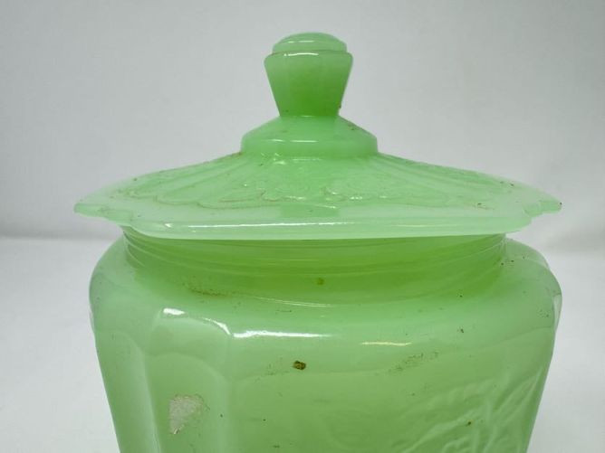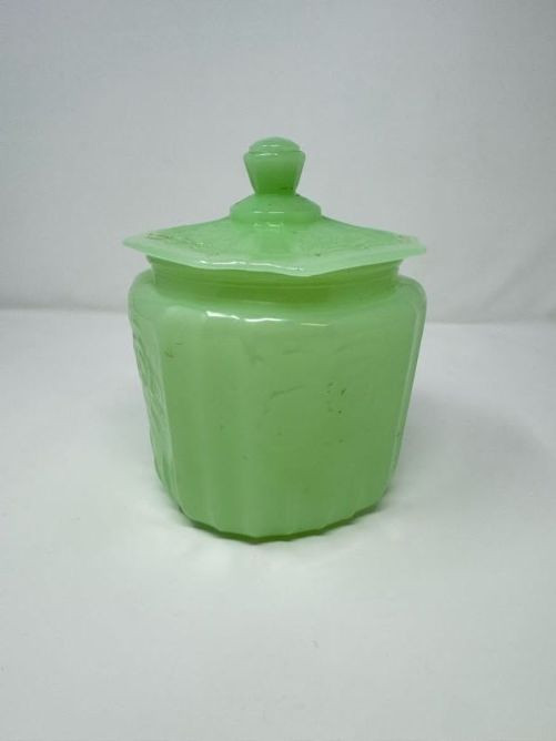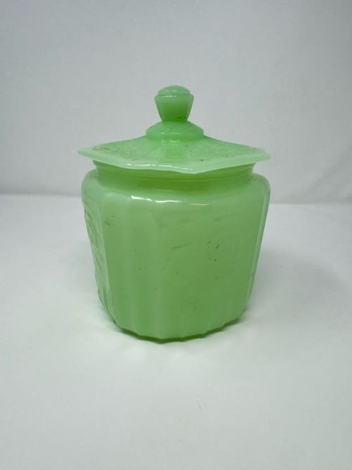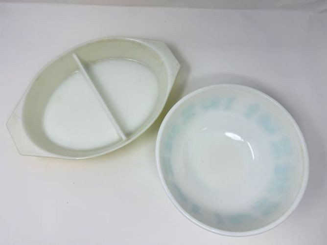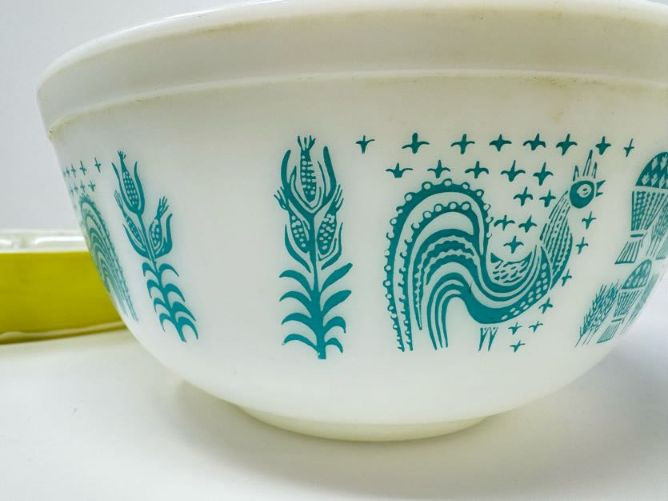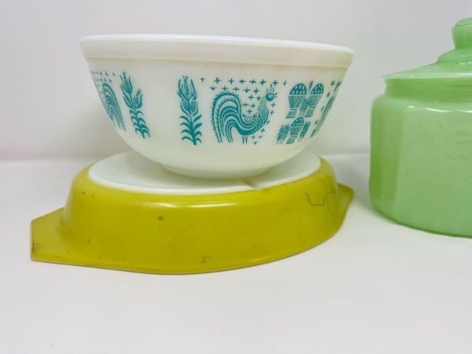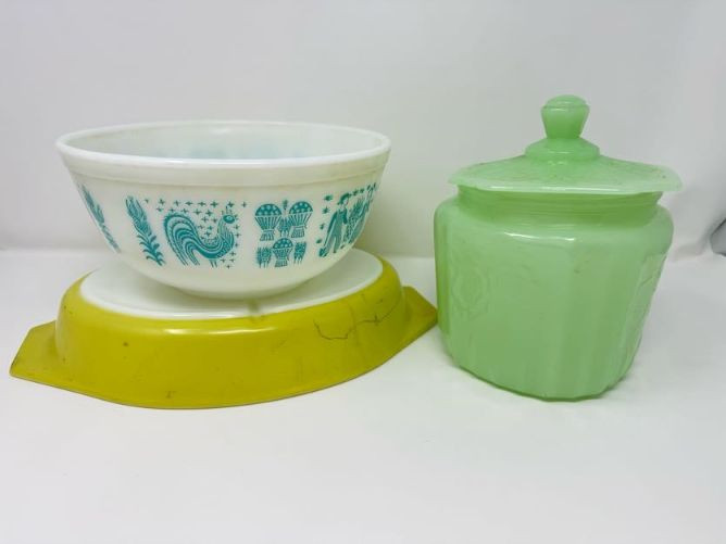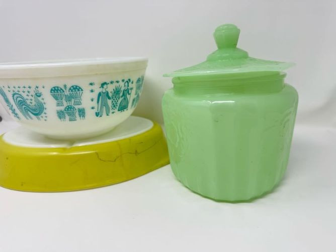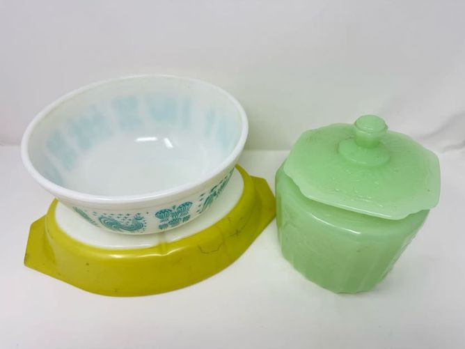 Vintage Pyrex Butterprint Bowl, Lime Pyrex Dish & Jadeite Jar