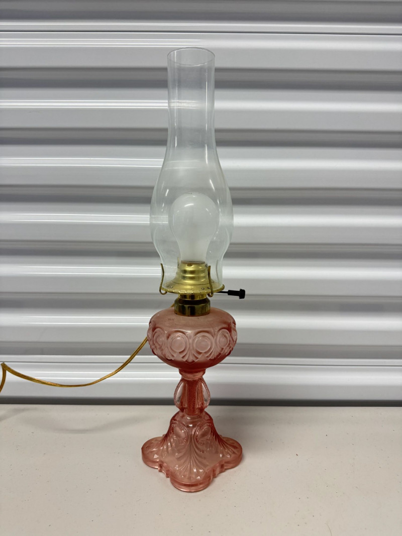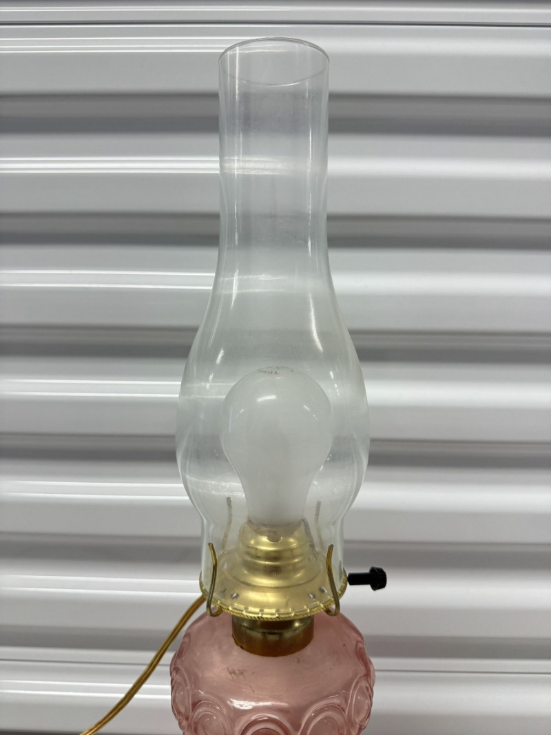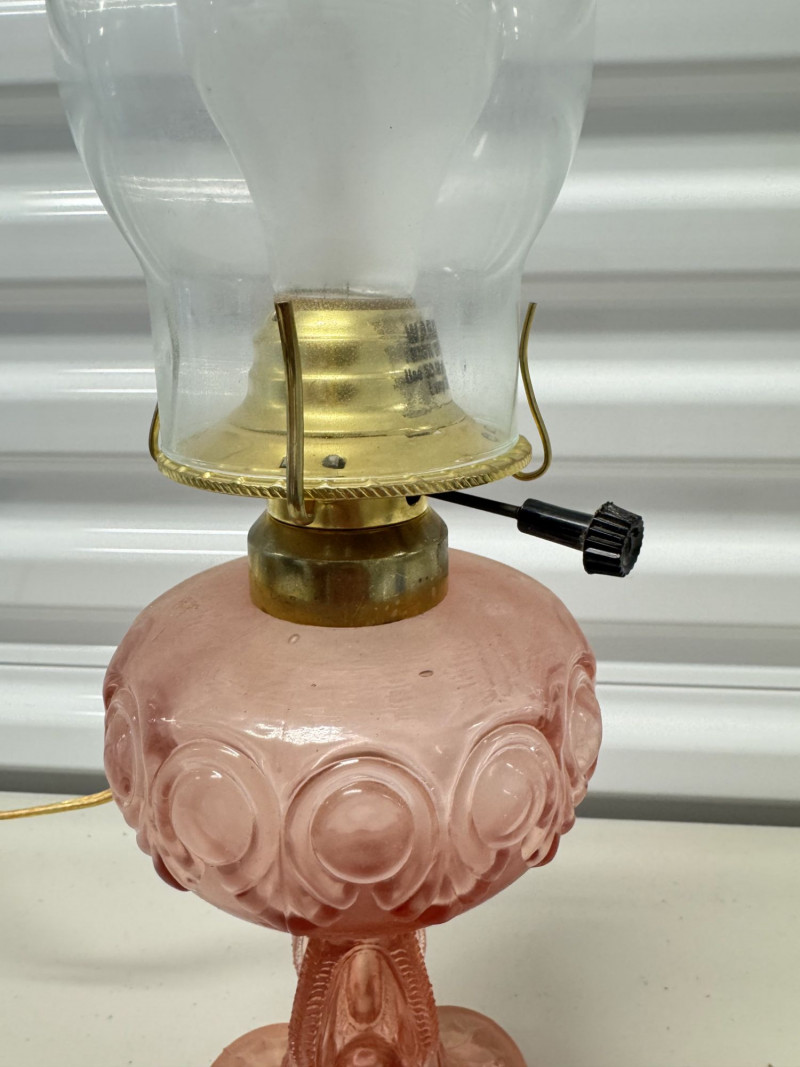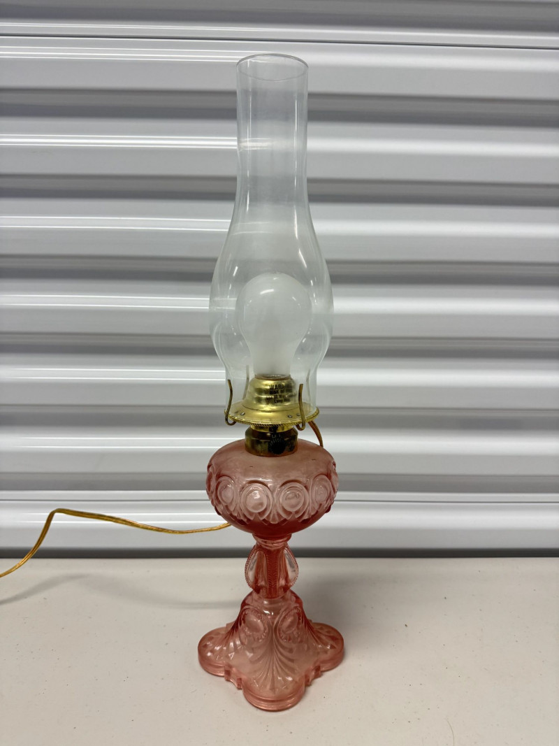 Lot # 185 - Vintage Pink Glass Hurricane Style Lamp w/ Chimney
