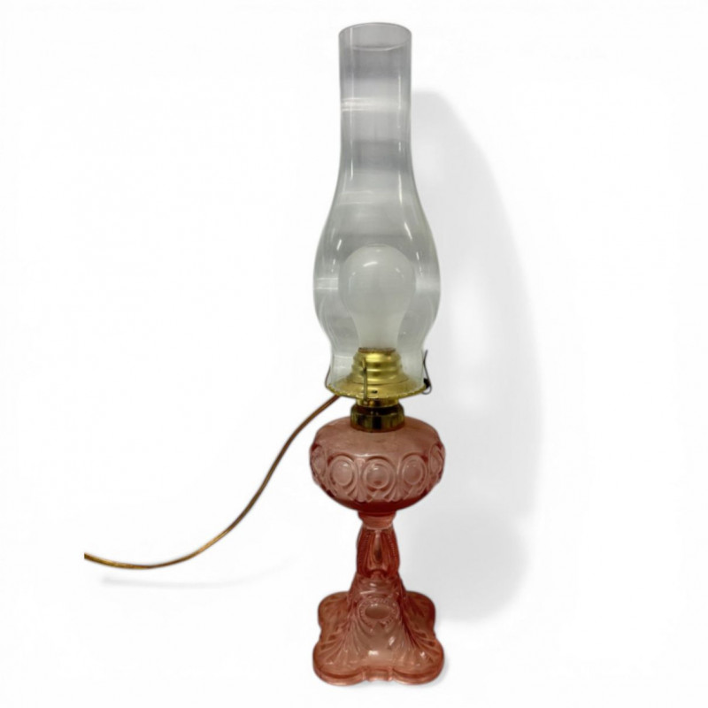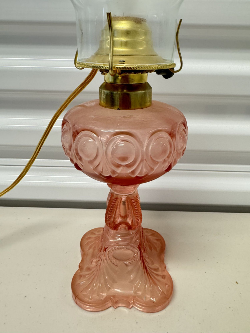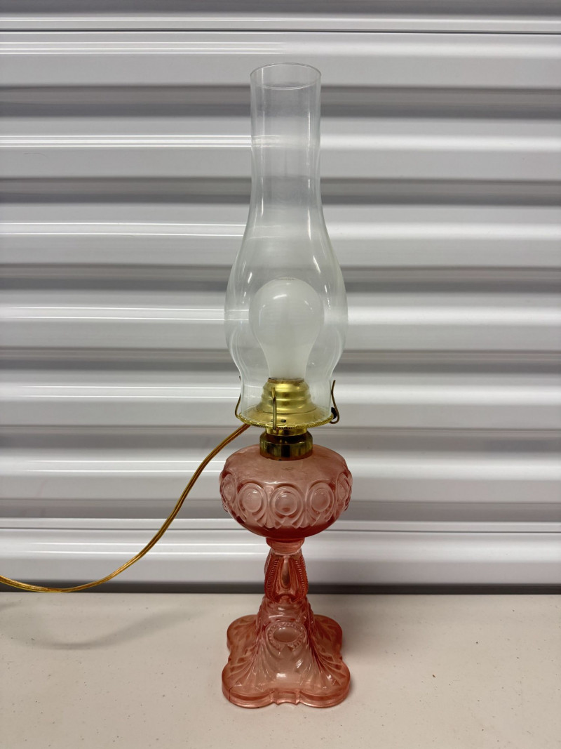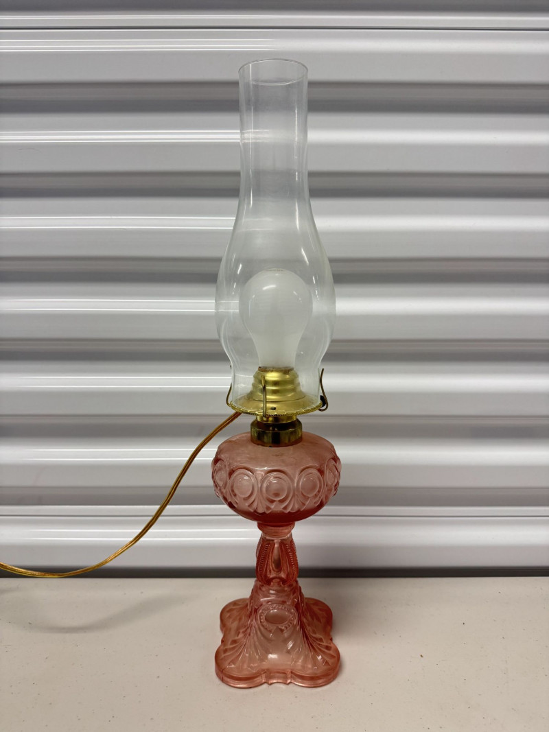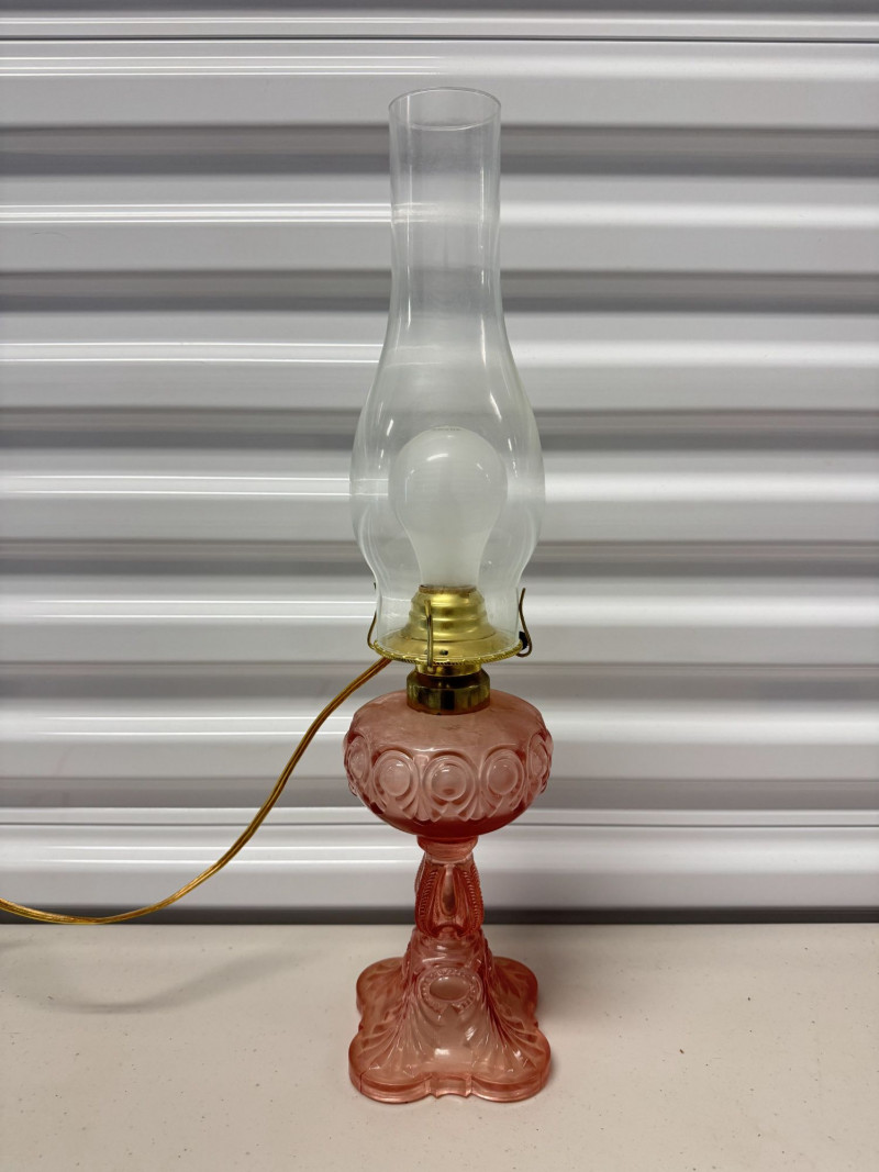 Lot # 185 - Vintage Pink Glass Hurricane Style Lamp w/ Chimney