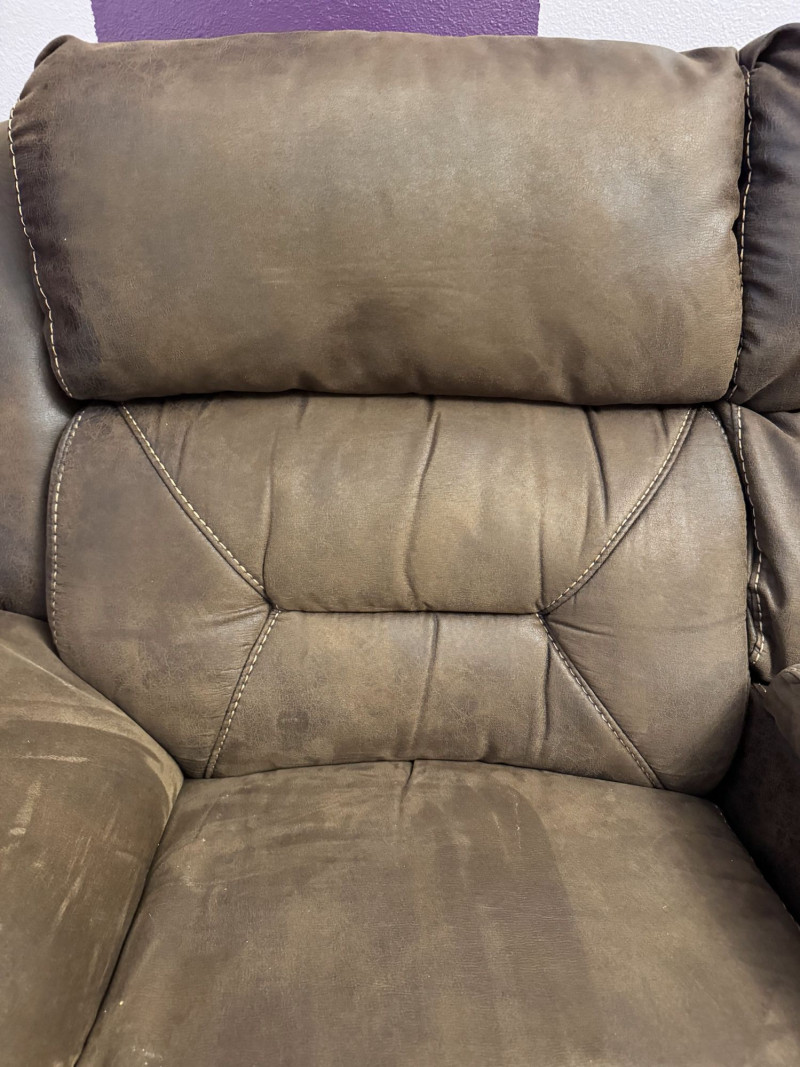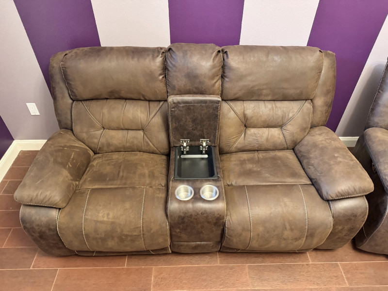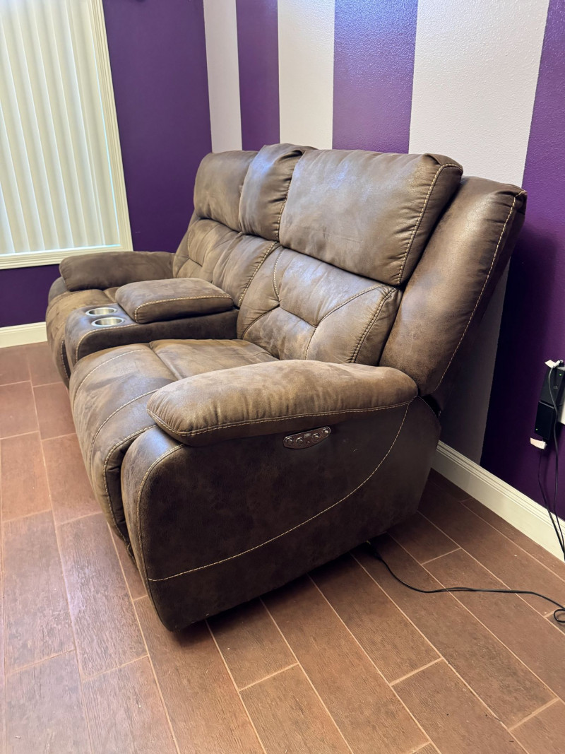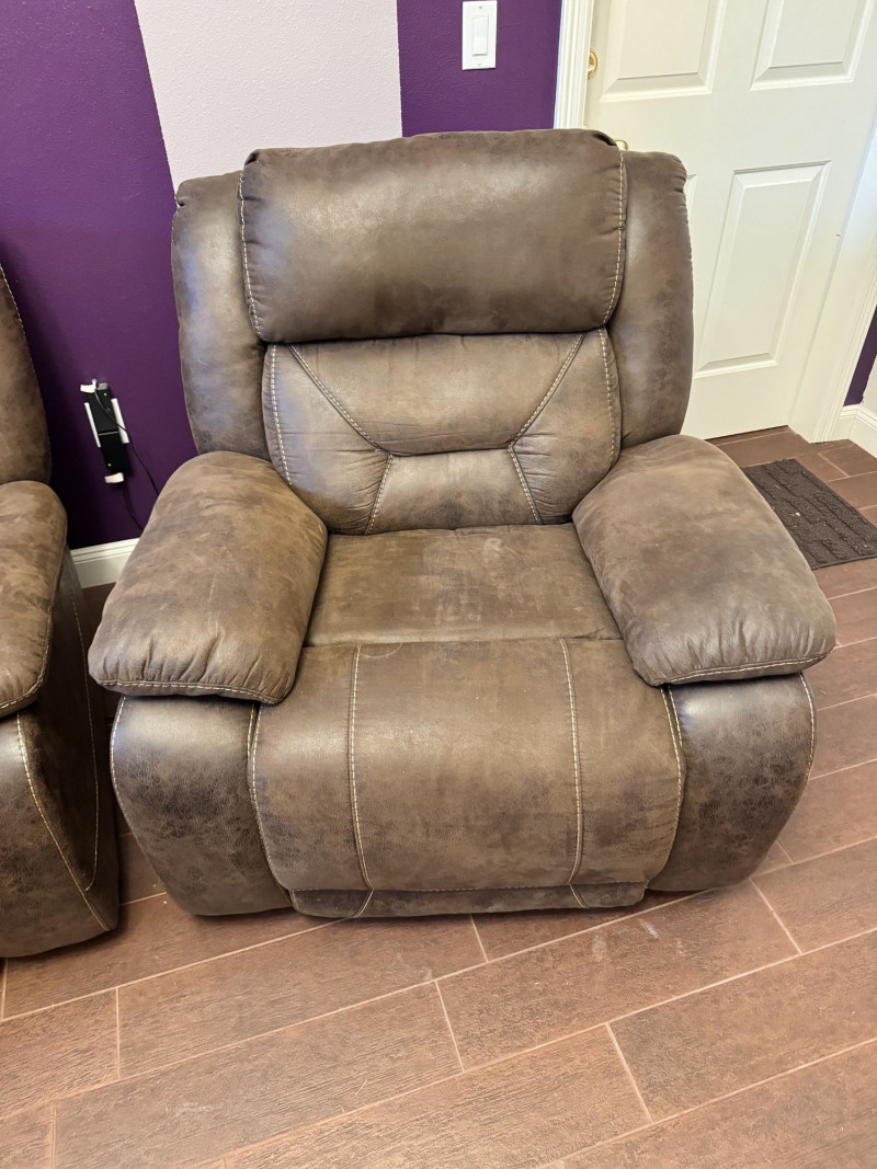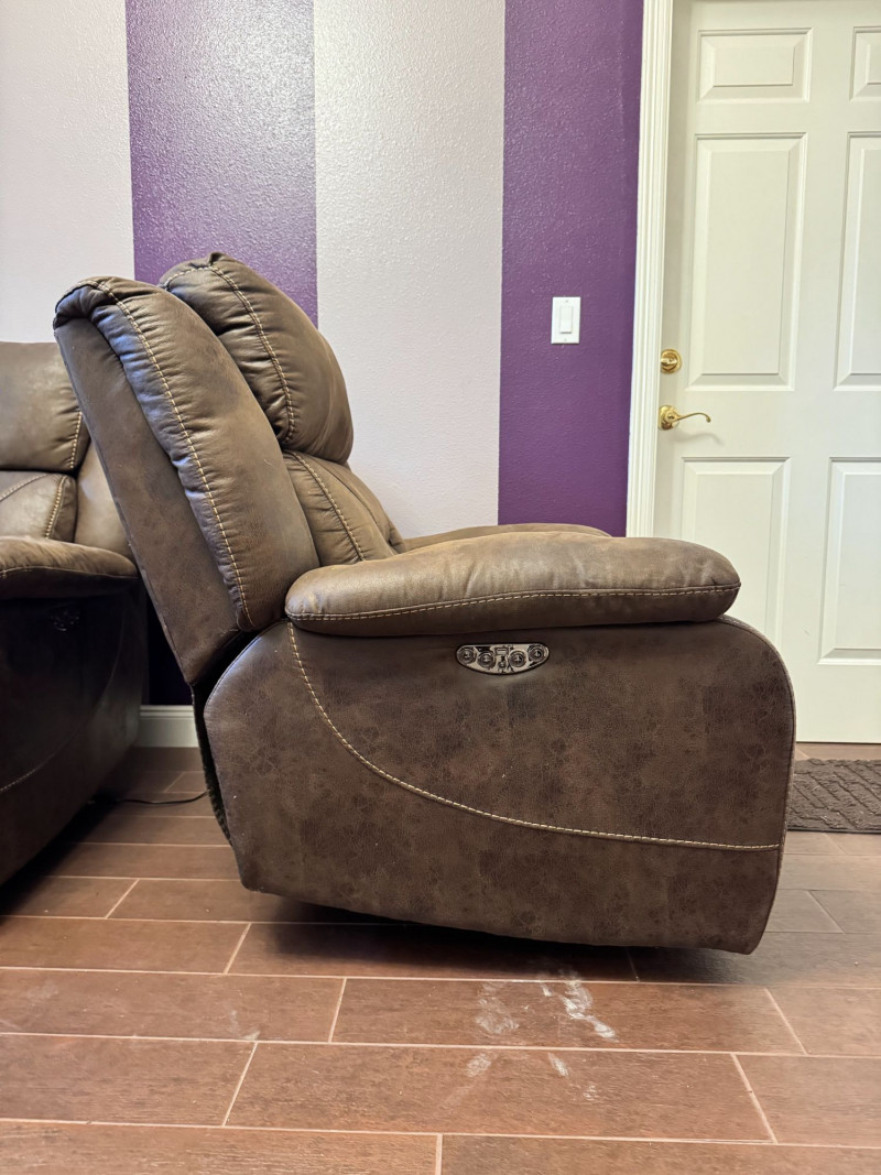Brown Leather Power Reclining Loveseat w/ USB Cupholders + Recliner. Loveseat Dimensions Recliner Dimensions (Single Seat) Condition Shows wear, discoloration, and surface marks on seats and arms Bidding on this lot is an agreement that: (1.) You will have at least 2 capable, able bodied persons to lift and load at a minimum. (2.) You will bring a hand truck and/or any other tools needed to remove this item. If these steps are not followed your item will be forfeit and no refund given.