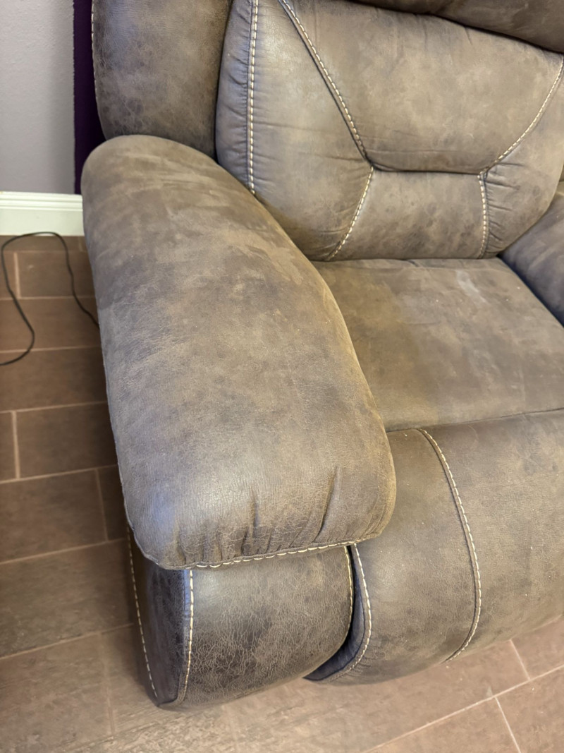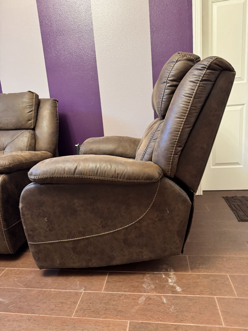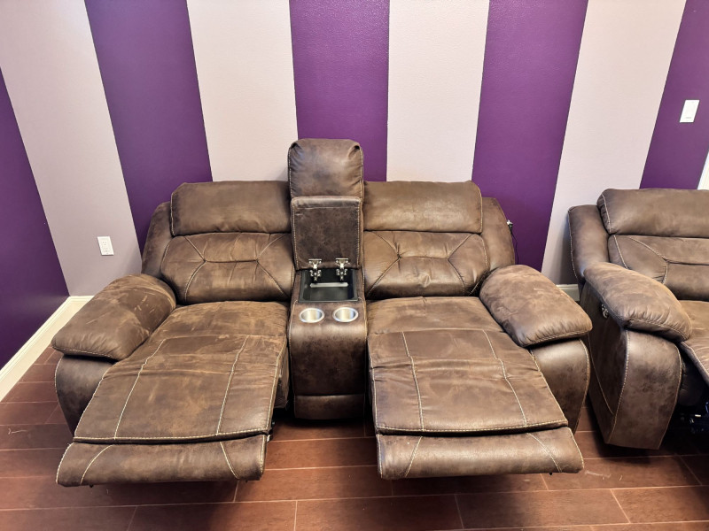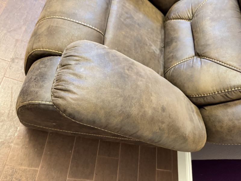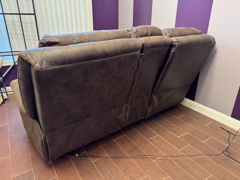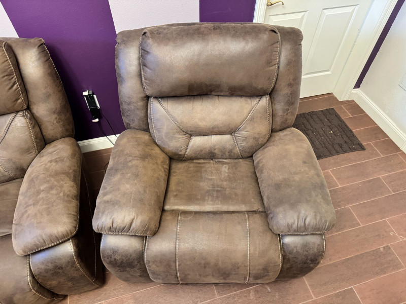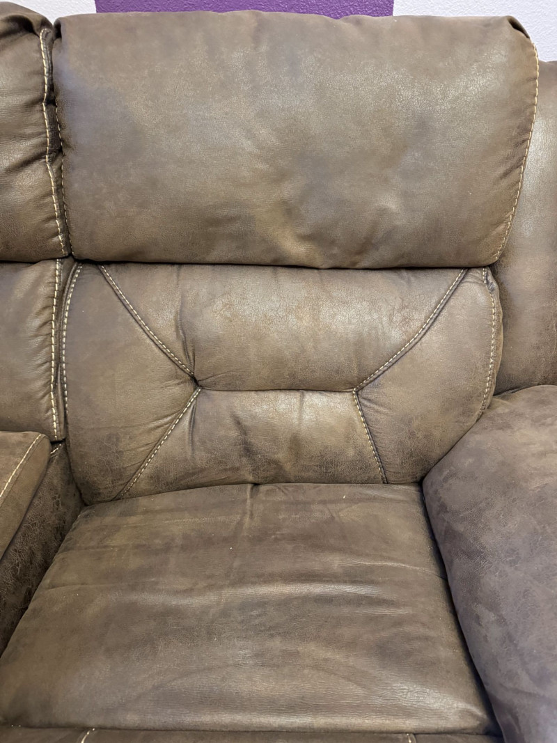 Brown Leather Power Reclining Loveseat w/ USB Cupholders + Recliner. Loveseat Dimensions Recliner Dimensions (Single Seat) Condition Shows wear, discoloration, and surface marks on seats and arms Bidding on this lot is an agreement that: (1.) You will have at least 2 capable, able bodied persons to lift and load at a minimum. (2.) You will bring a hand truck and/or any other tools needed to remove this item. If these steps are not followed your item will be forfeit and no refund given.