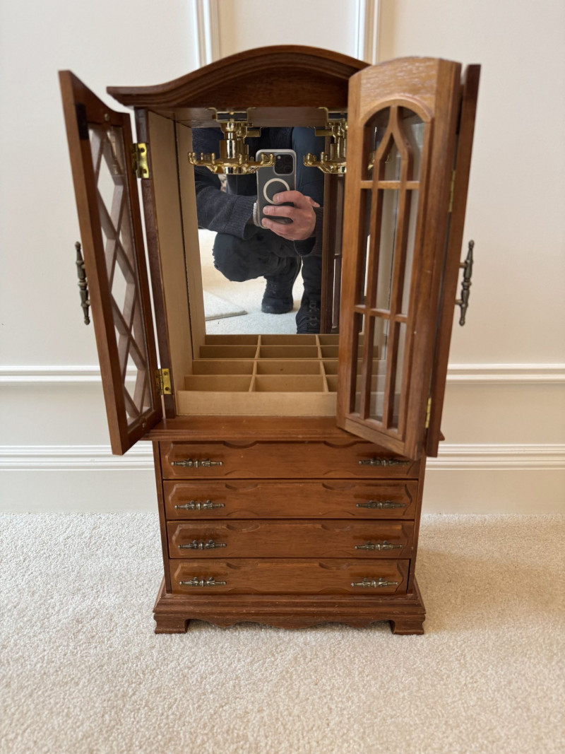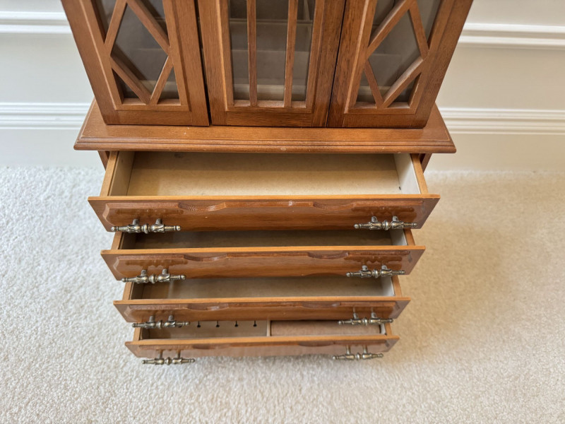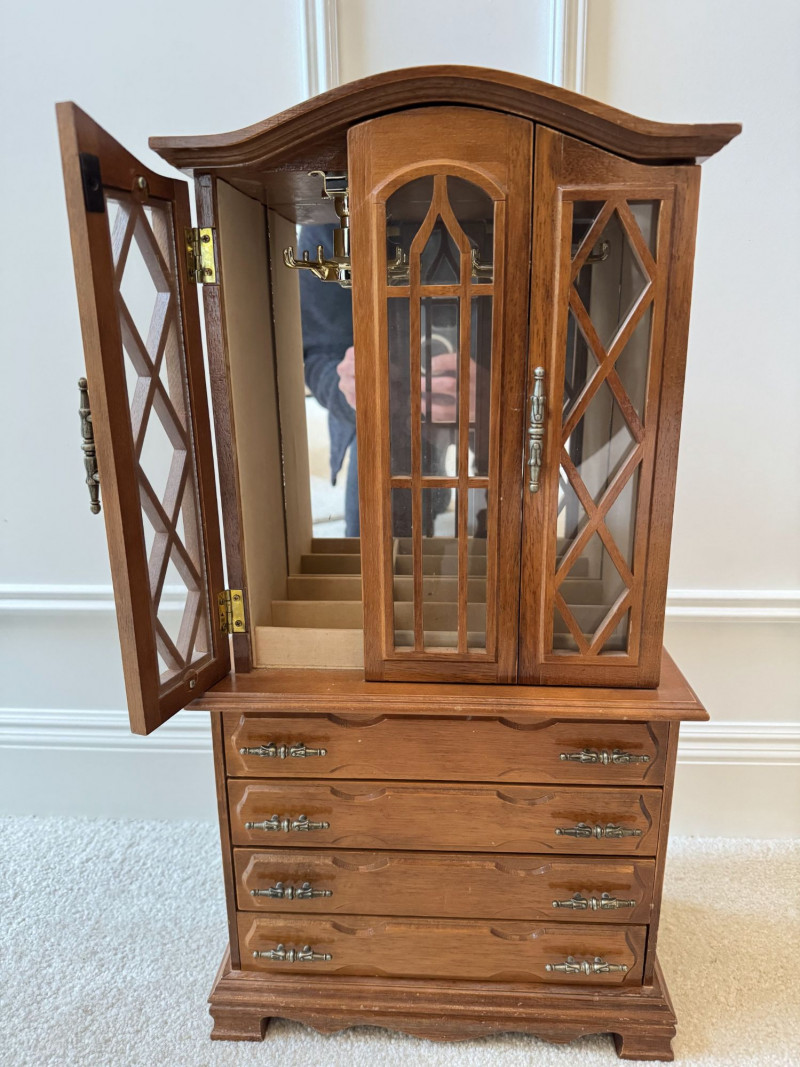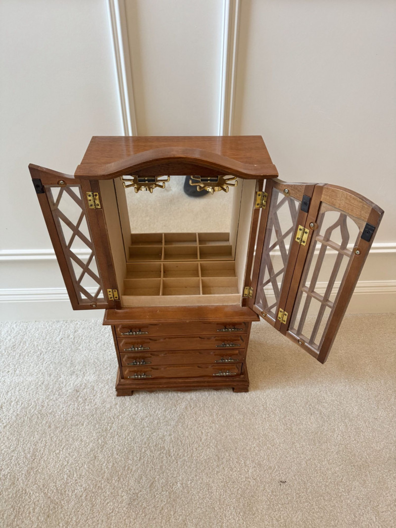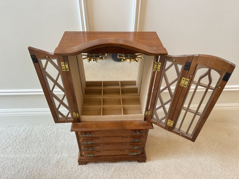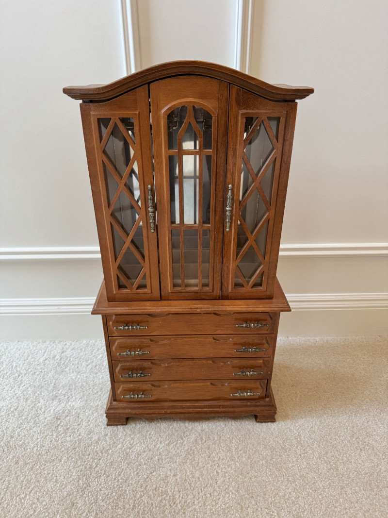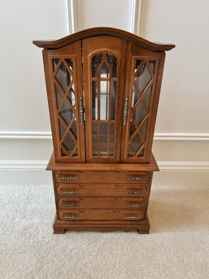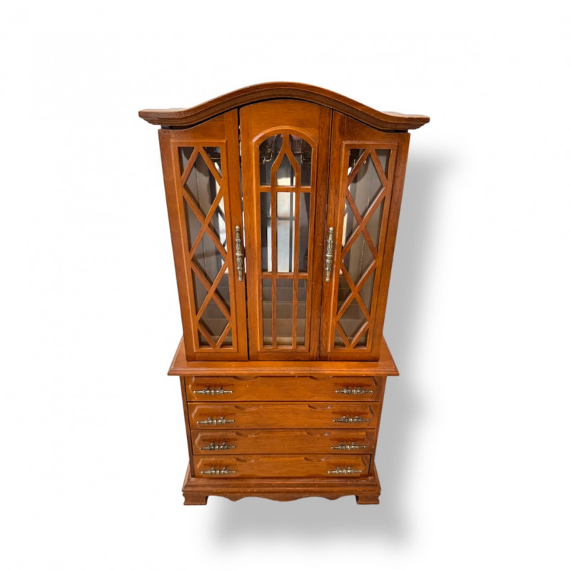 Petite Vintage Style Wood Jewelry Armoire w/ Mirror & Drawers.