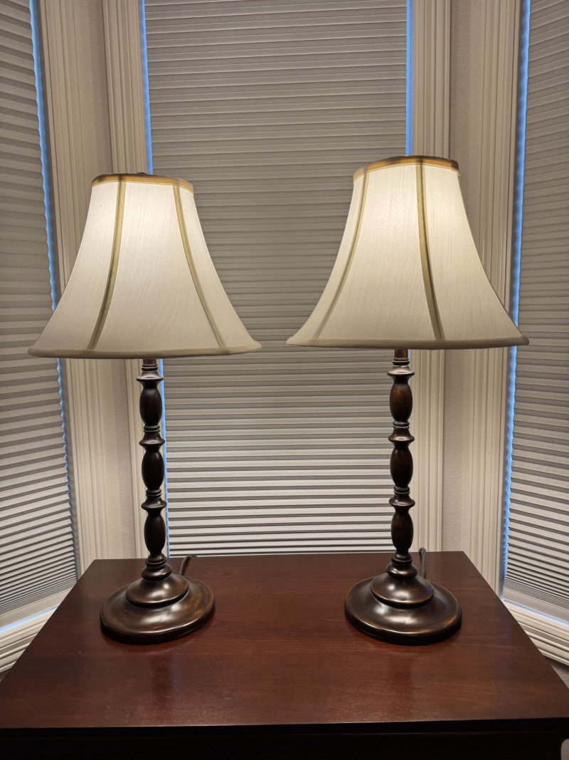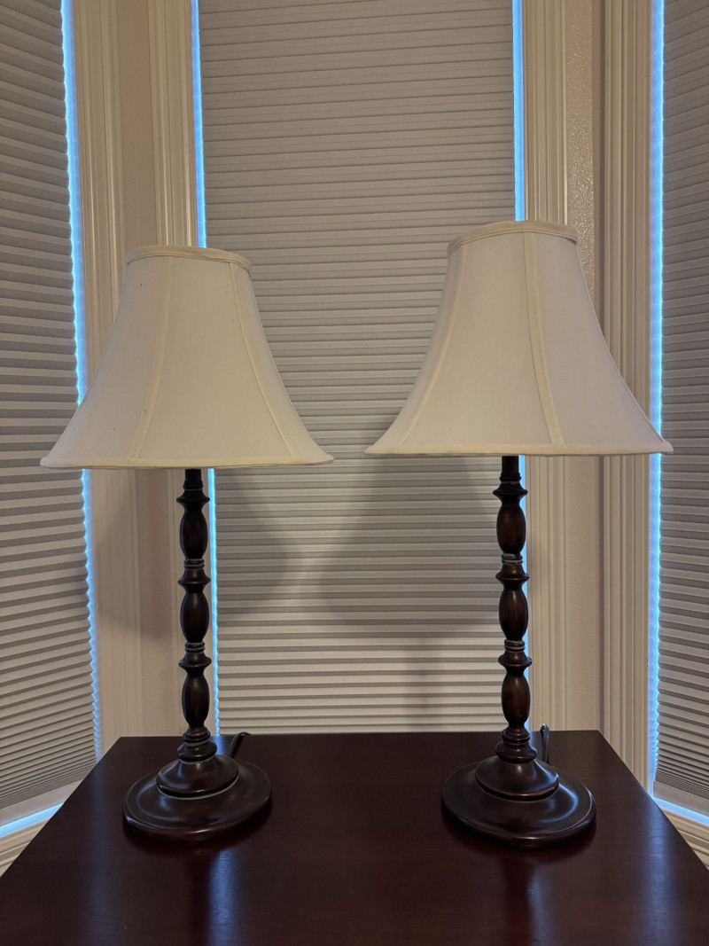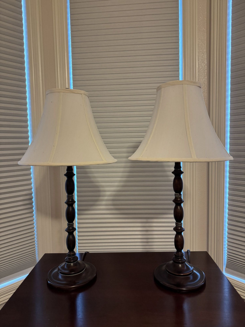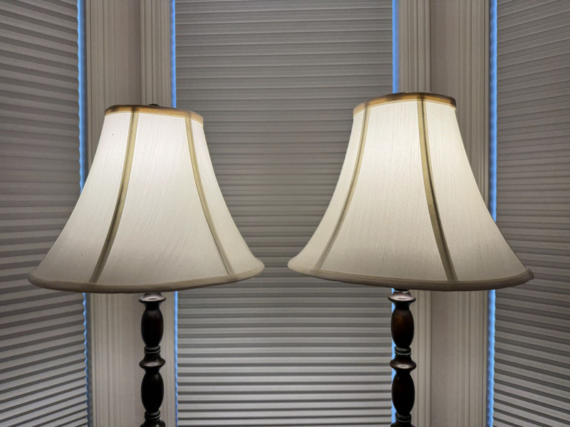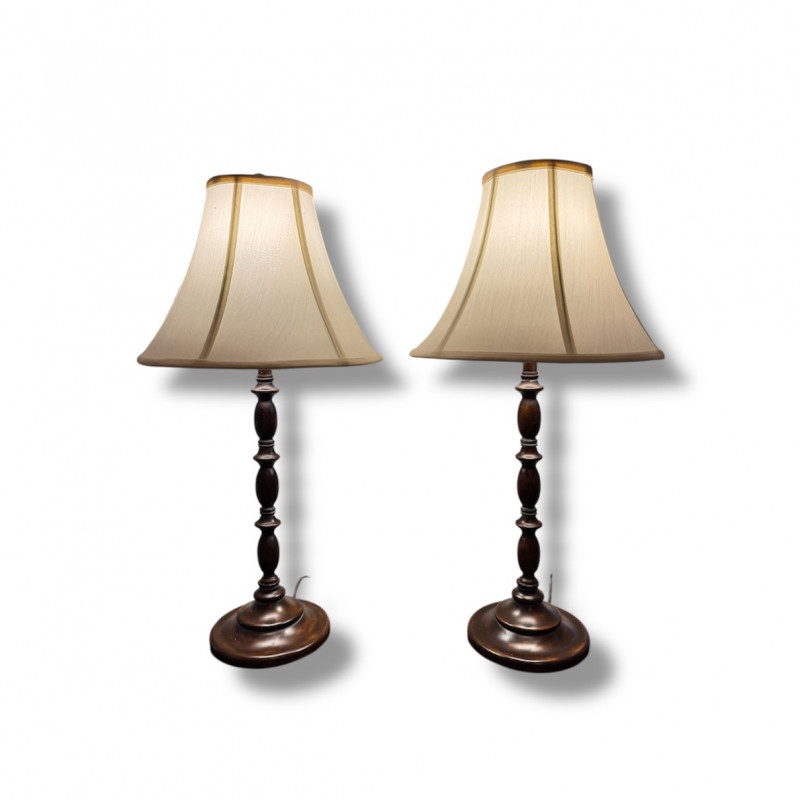 Lot # 15 - Pair Wood-Base Table Lamps w/ Cream Colored Fabric Shades