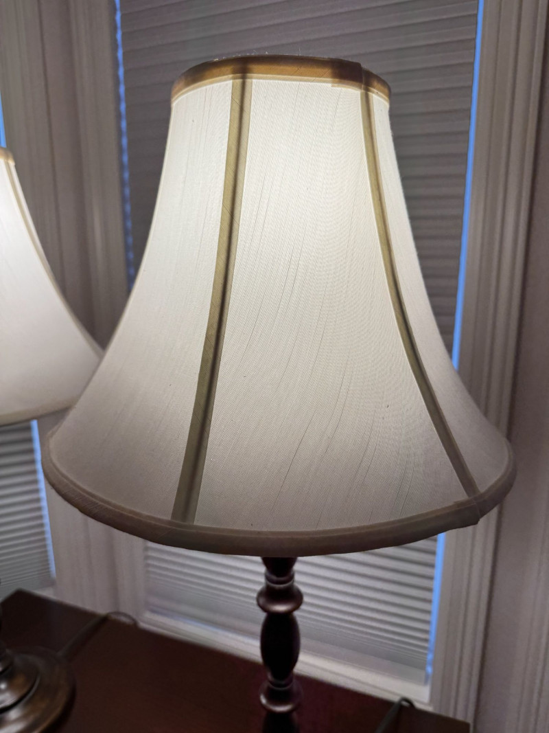 Pair Wood-Base Table Lamps w/ Cream Colored Fabric Shades.