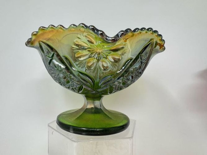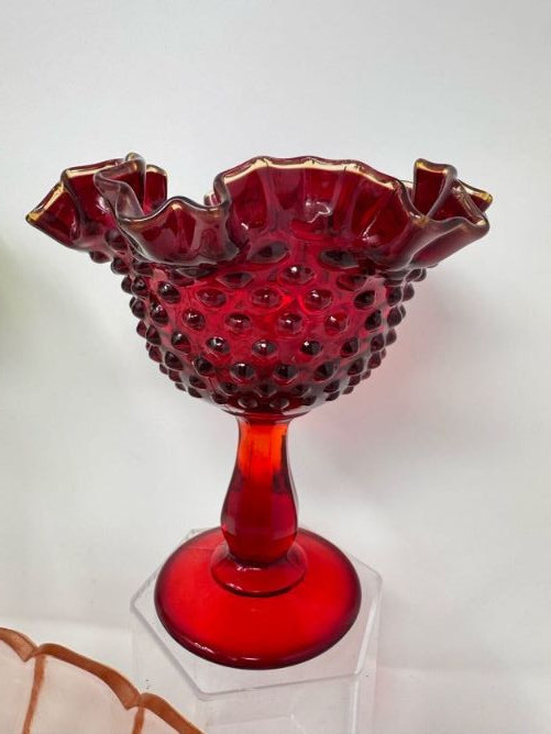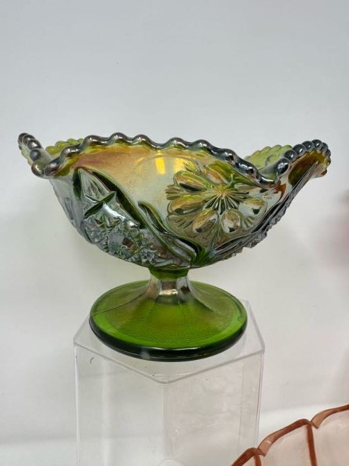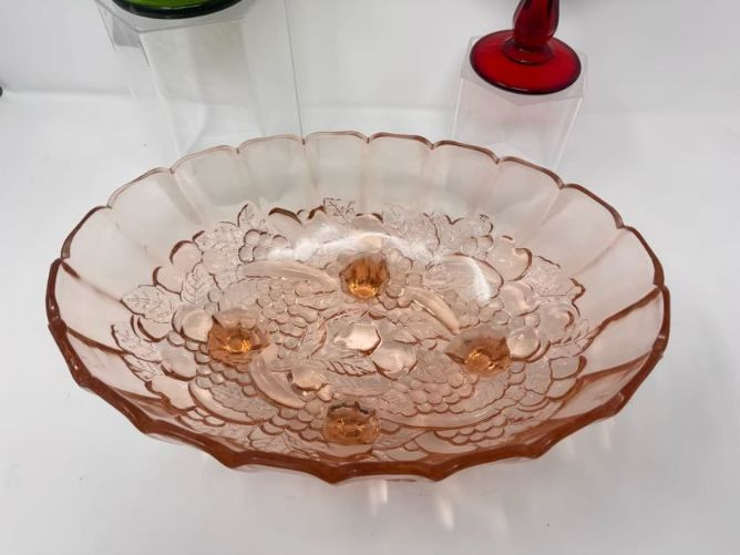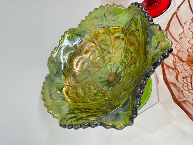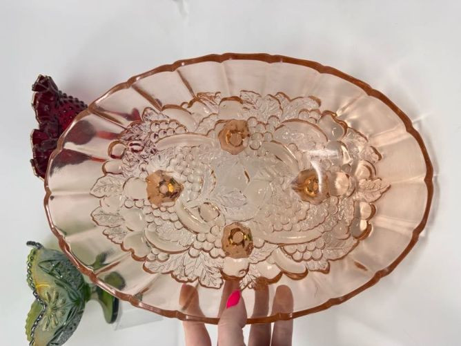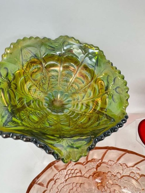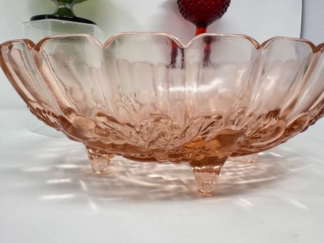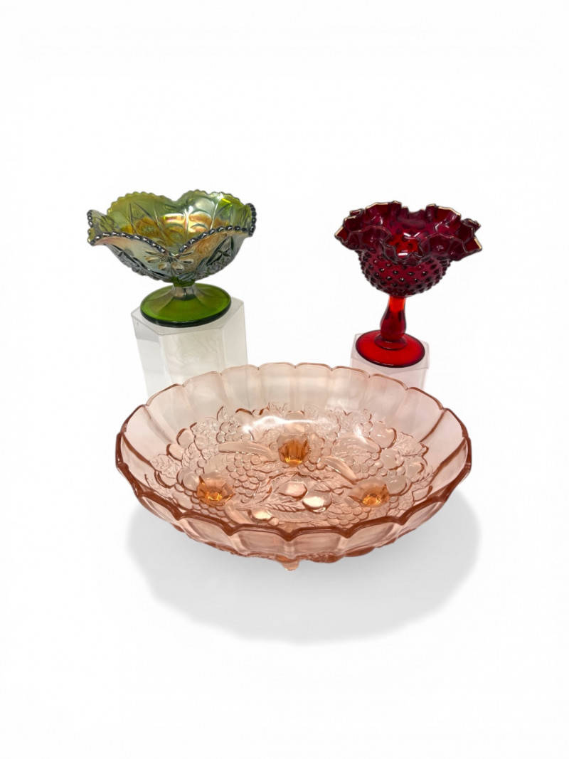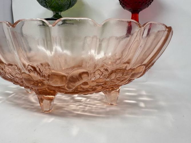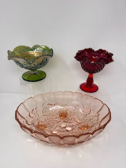 Vintage Glass Pink Grape Bowl, Scalloped & Fenton Style Compotes. Mixed vintage glass lot (3 pieces total) Includes large pink depression glass bowl Approx. 12” long x 4.5” tall Harvest grape pattern with footed base Includes green iridescent carnival glass compote Daisy pattern with scalloped edge Includes red hobnail compote with gold crest Fenton-style design