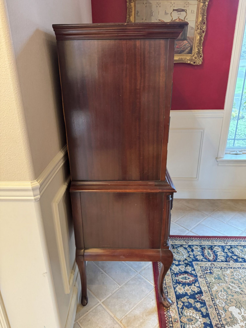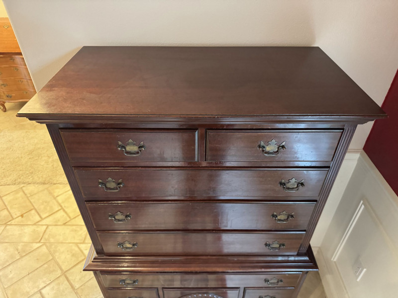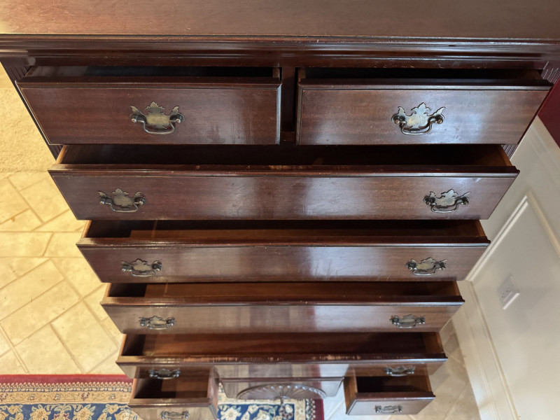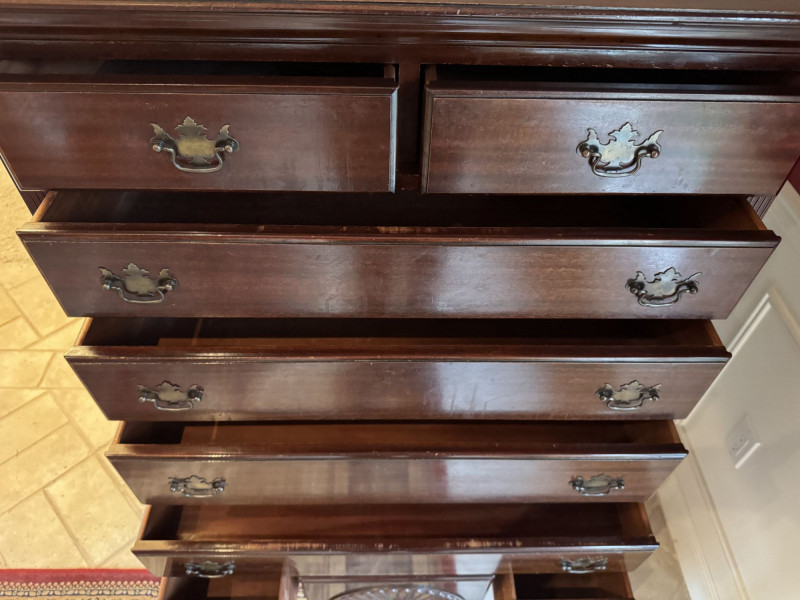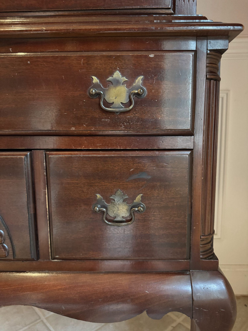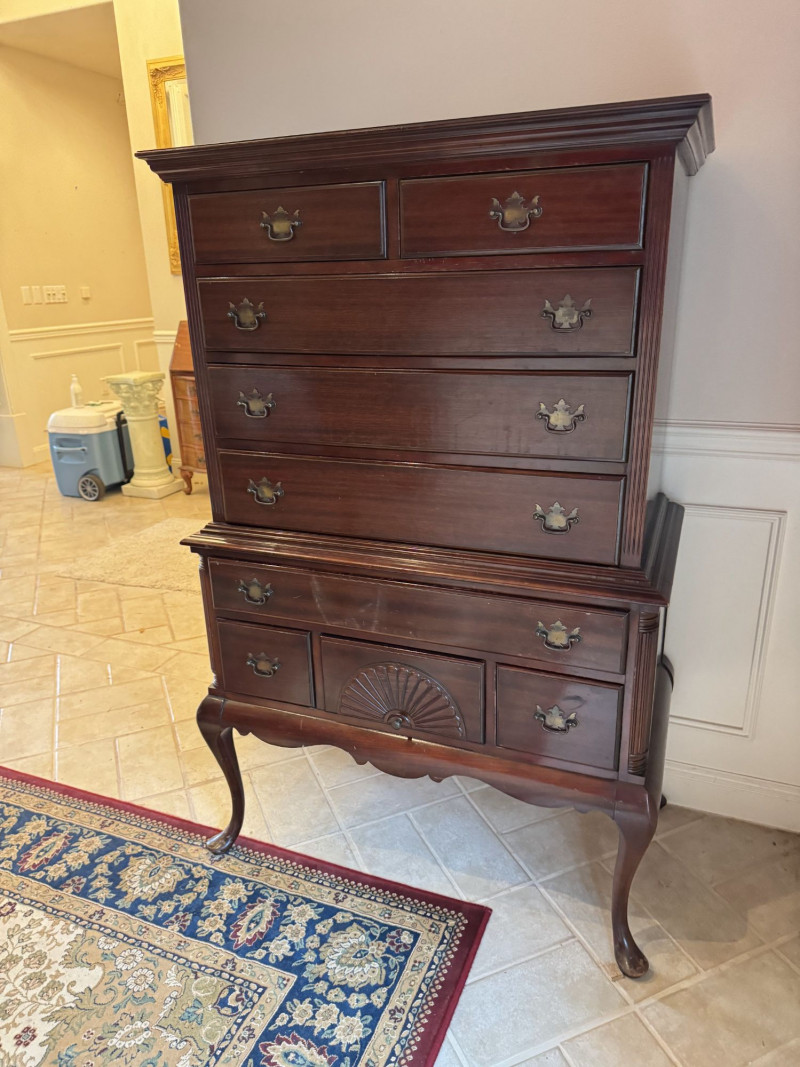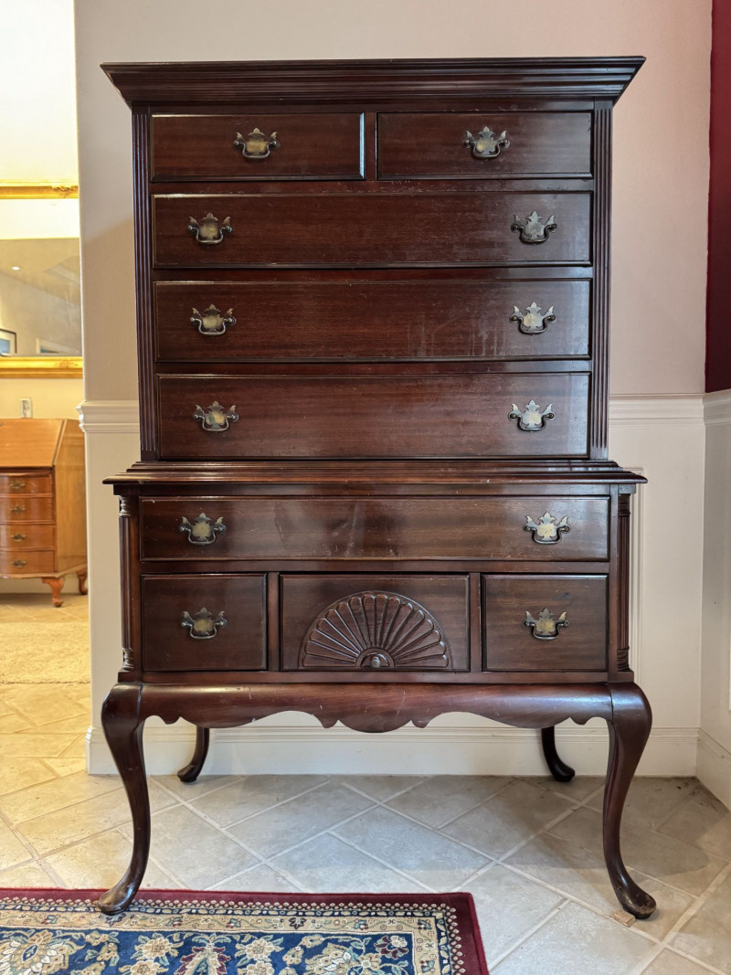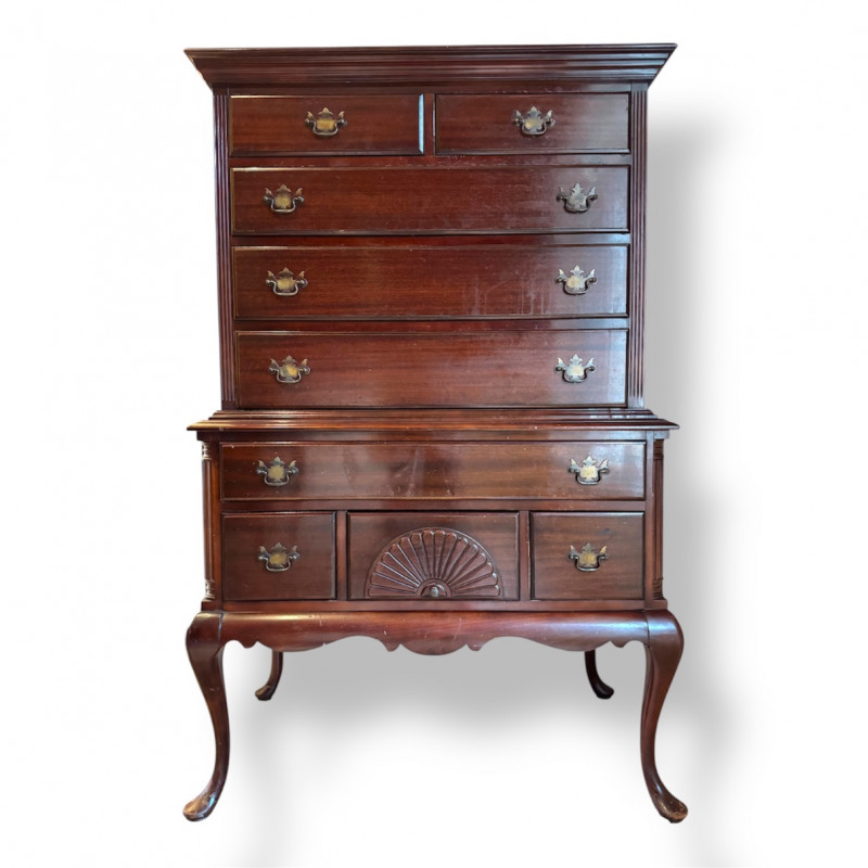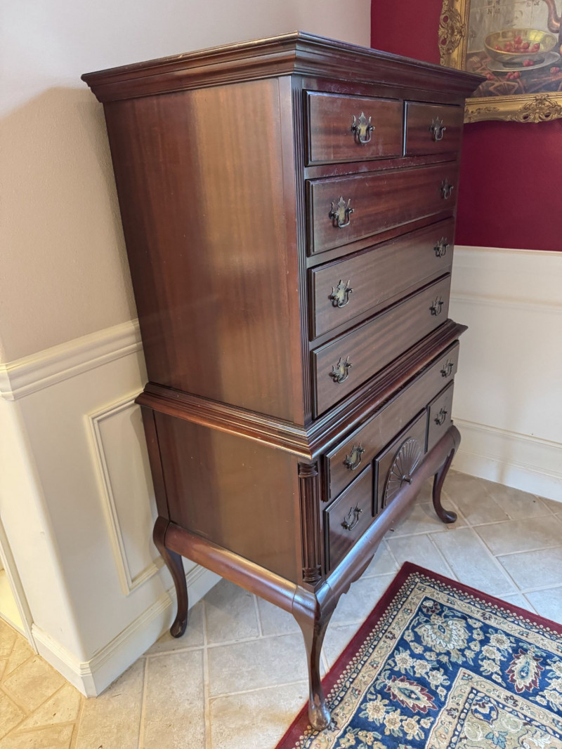 Queen Anne Style Mahogany Highboy Dresser - Heavy. Note: This is a very heavy item. Bidding on this lot is an agreement that: (1.) You will have at least 2 capable, able bodied persons to lift and load at a minimum. (2.) You will bring a hand truck and/or any other tools needed to remove this item. If these steps are not followed your item will be forfeit and no refund given.