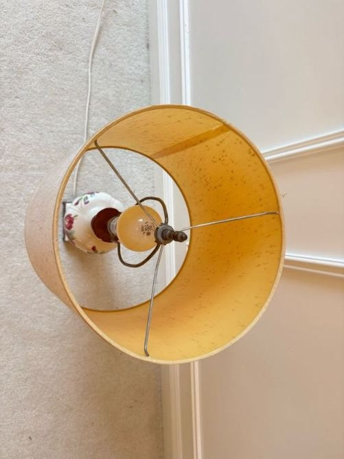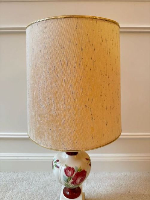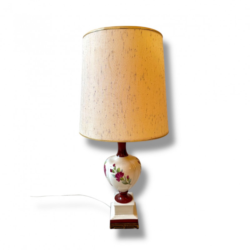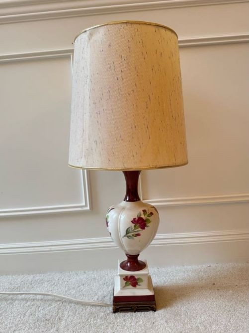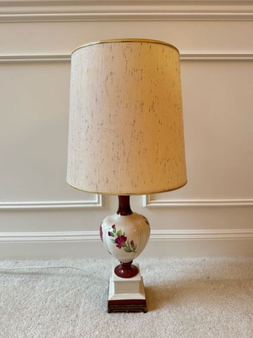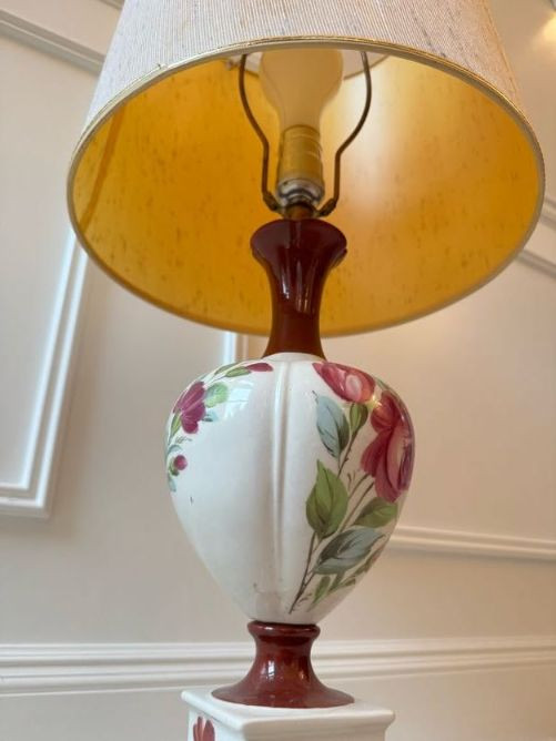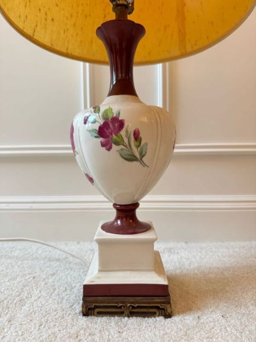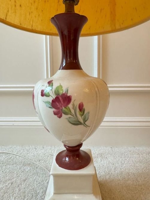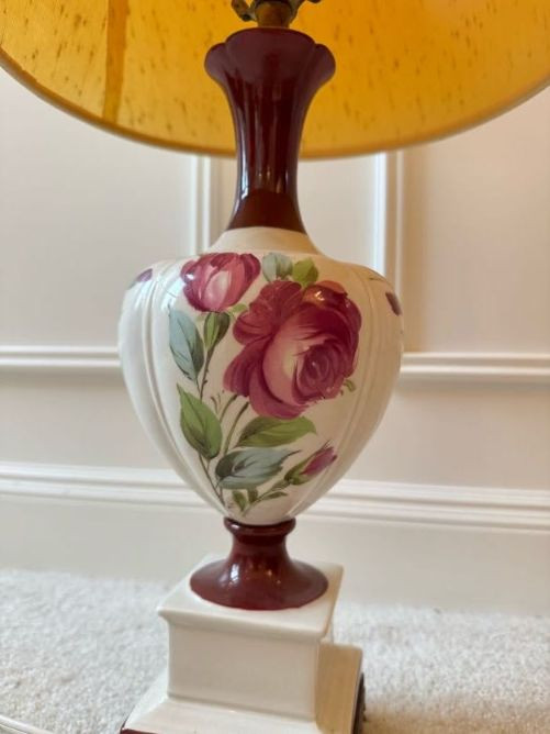 Floral Ceramic Urn Shape Table Lamp w/ Red Trim Base & Yellow Shade.