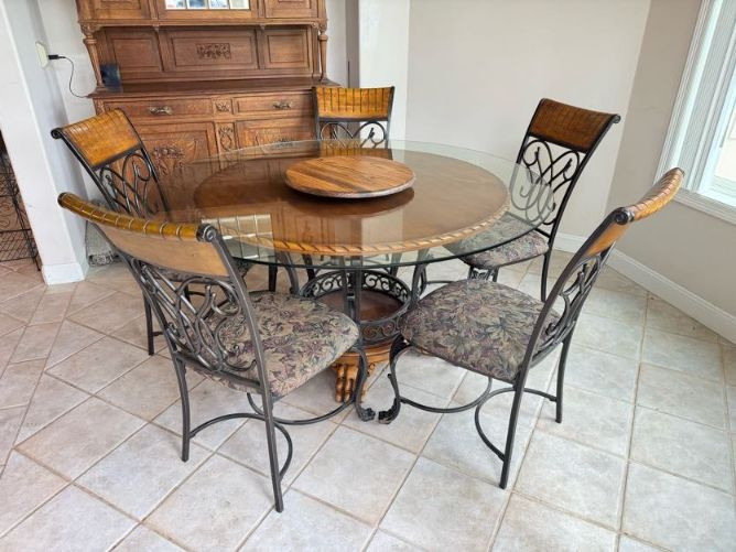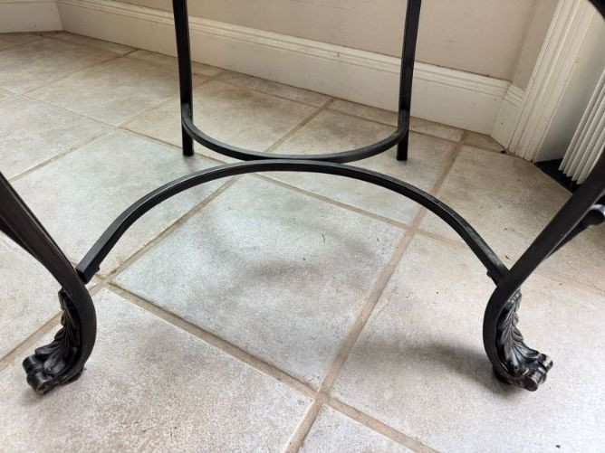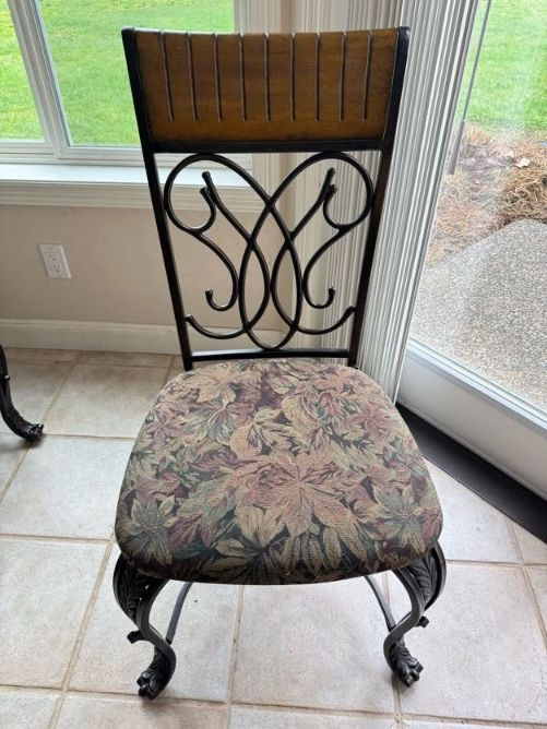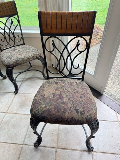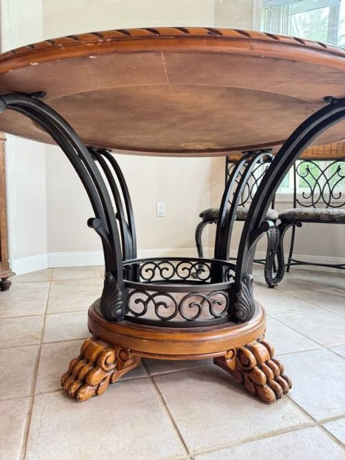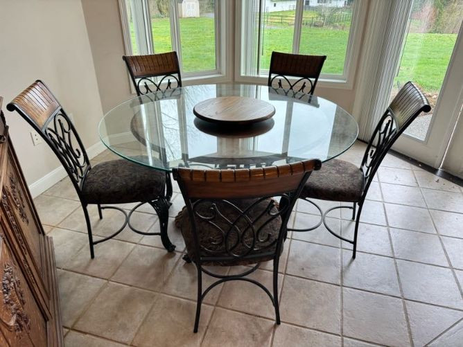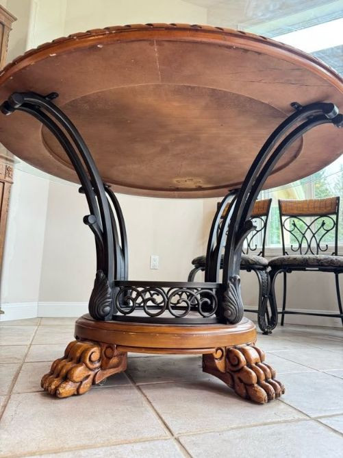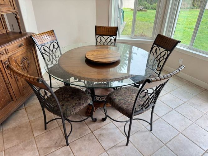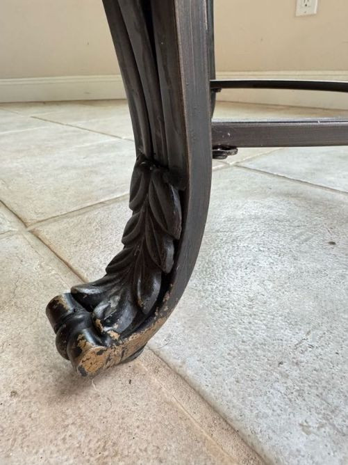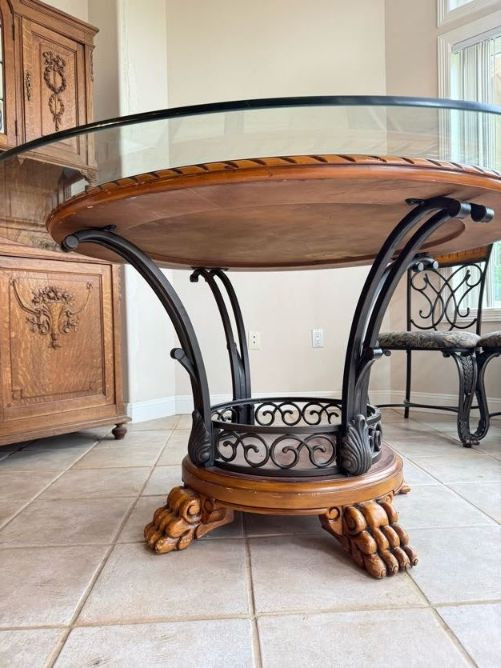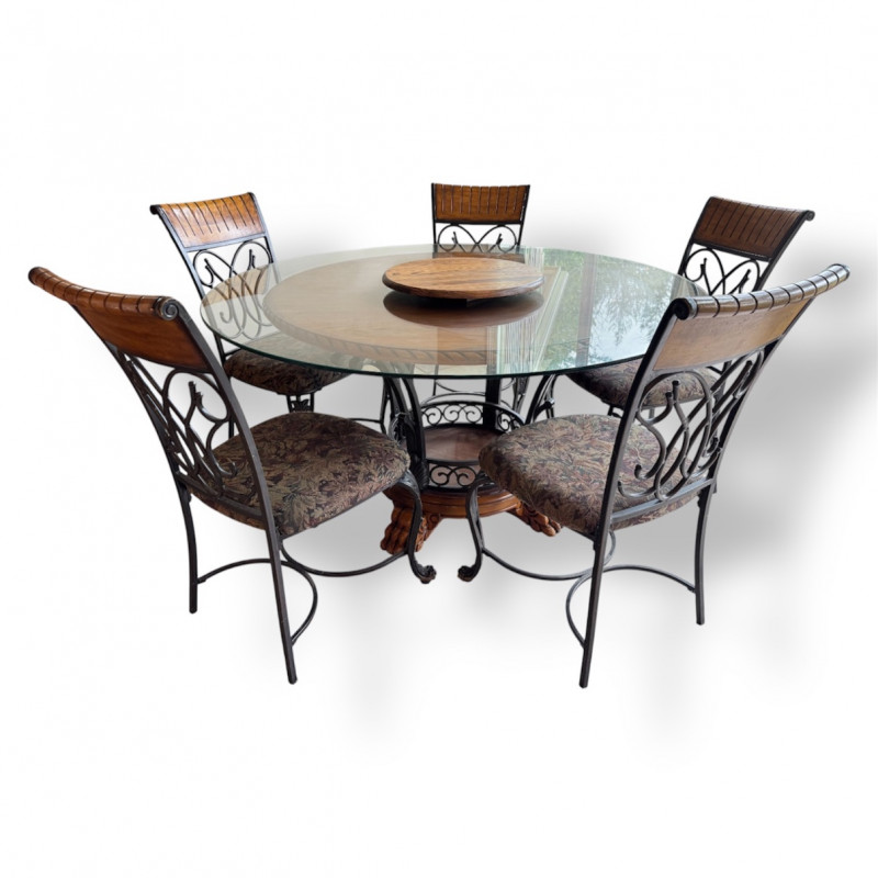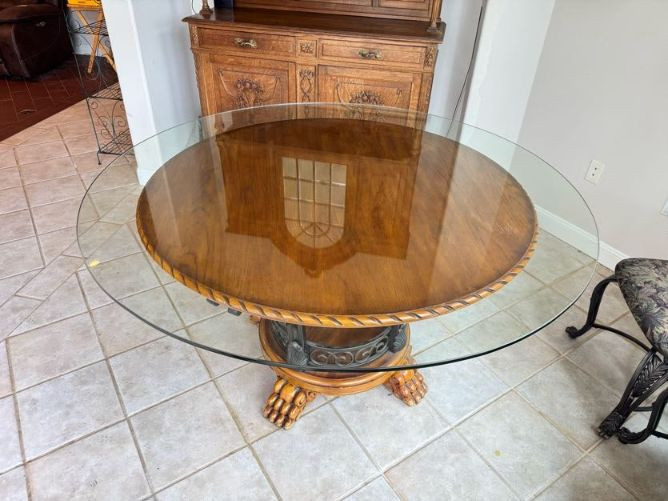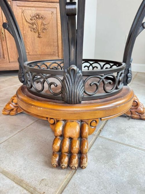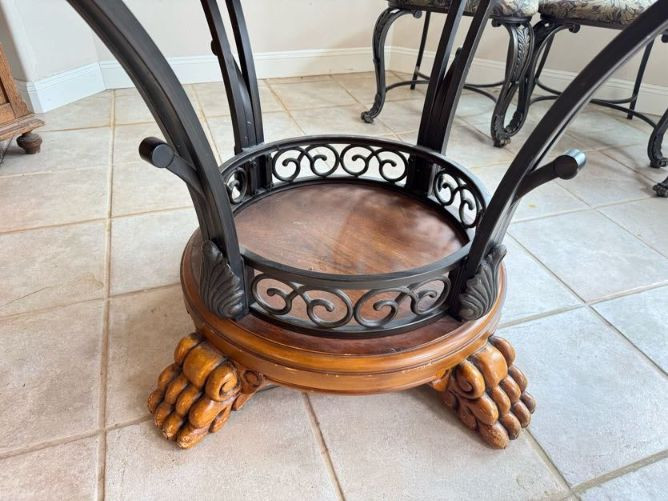 Claw Foot Dining Table w/ Glass Top & Cast Iron Base + 5 Chairs. Bidding on this lot is an agreement that: (1.) You will have at least 2 capable, able bodied persons to lift and load at a minimum. (2.) You will bring a hand truck and/or any other tools needed to remove this item. If these steps are not followed your item will be forfeit and no refund given.