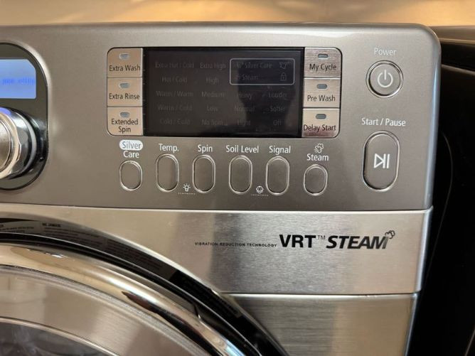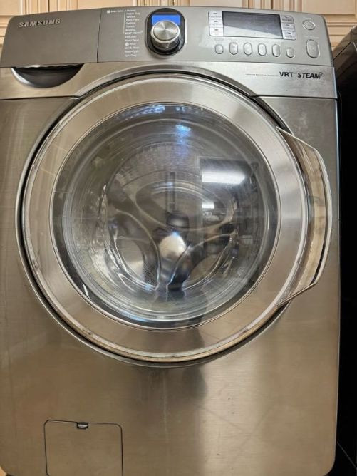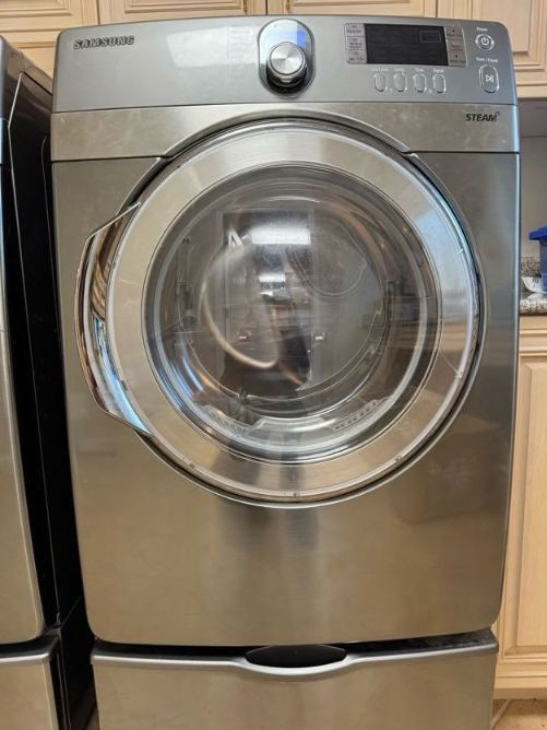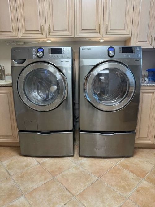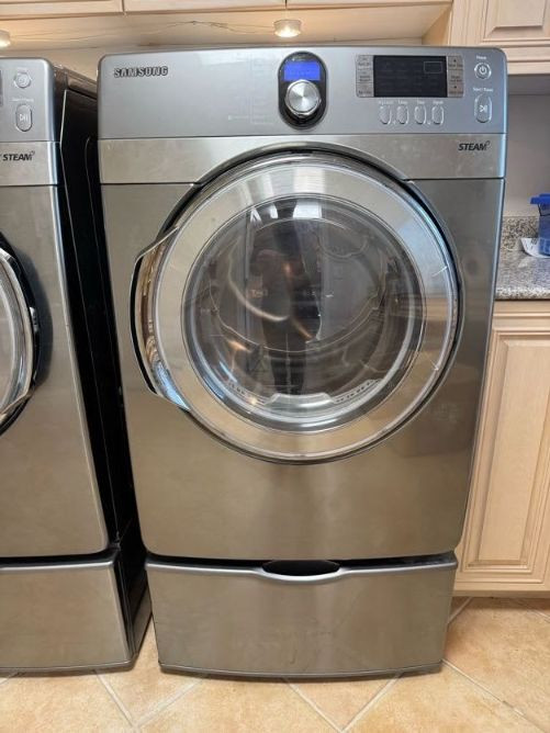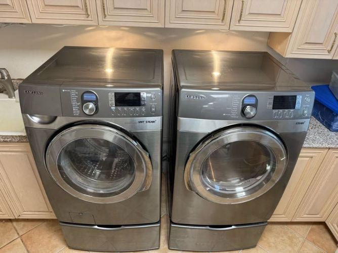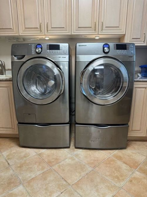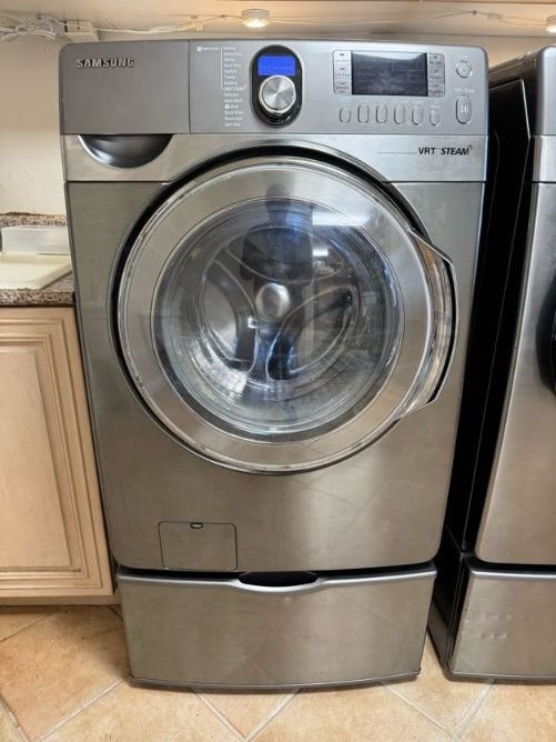 Samsung Front Load Washer/Dryer Set w/ Pedestals VRT Steam. Cosmetic wear present: