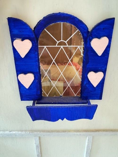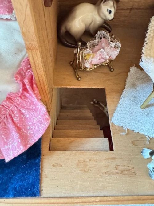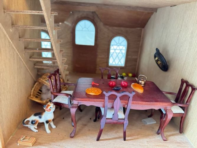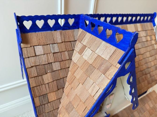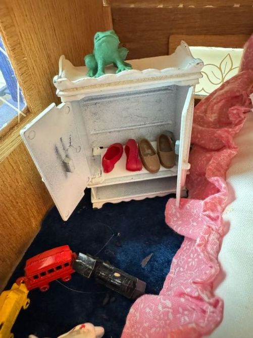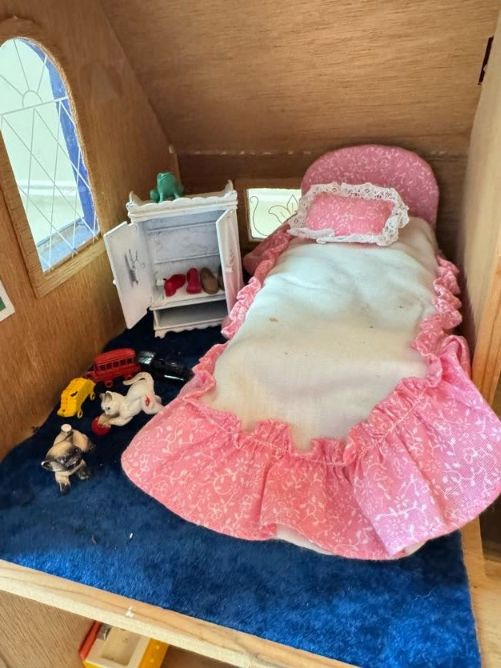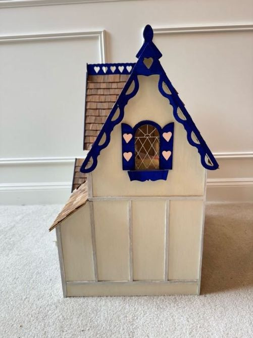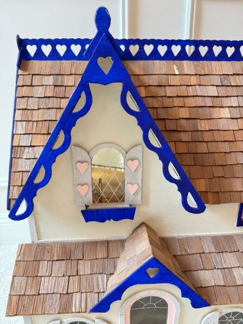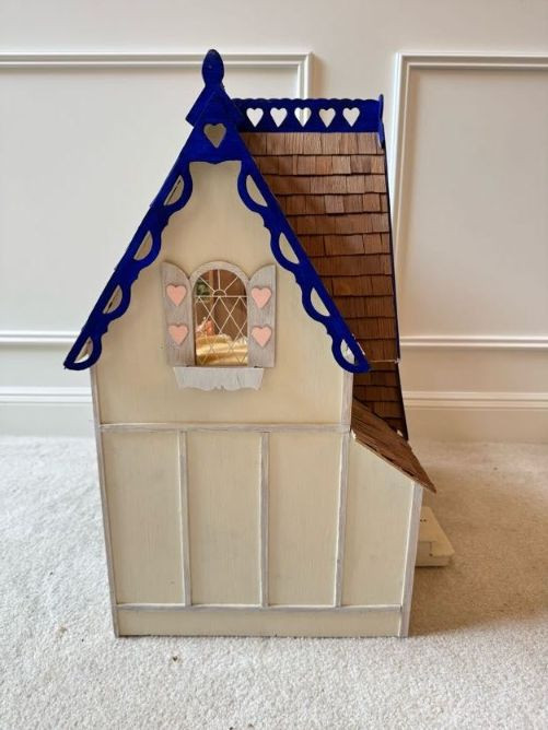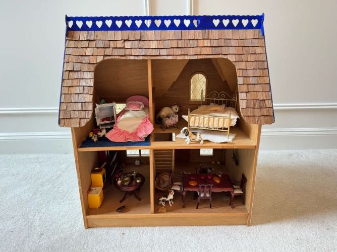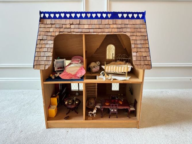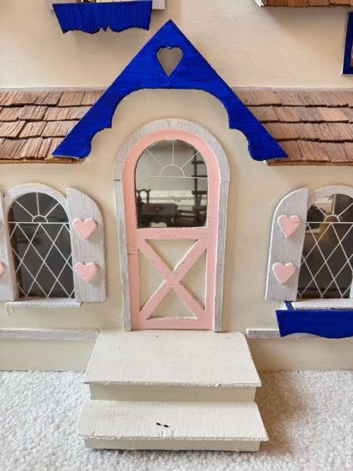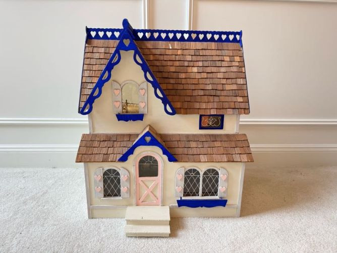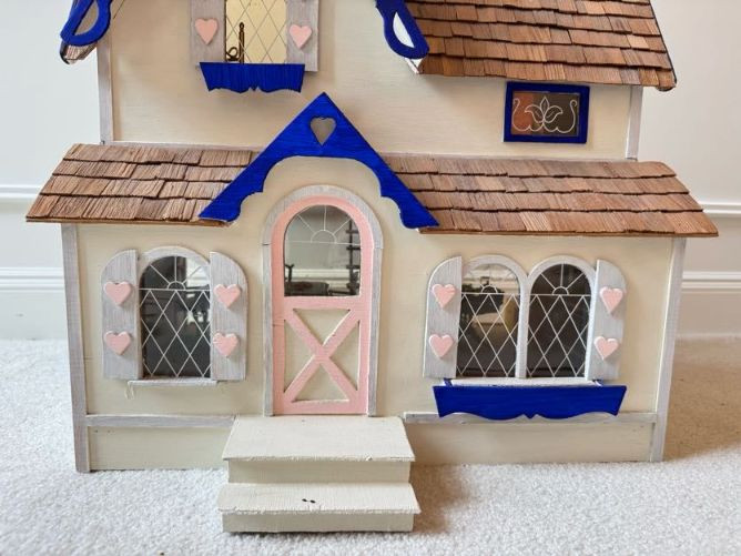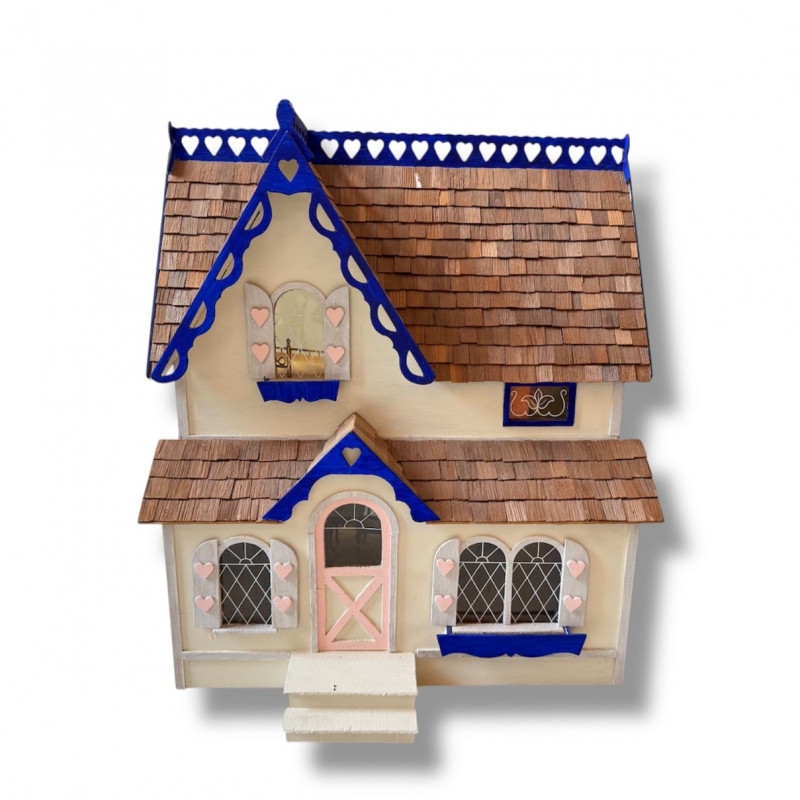 Vintage Wooden Dollhouse w/ Furniture & Accessories, Blue Heart Design.