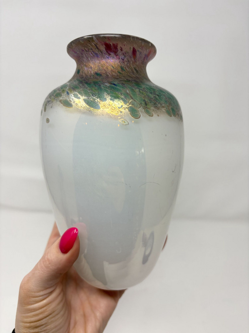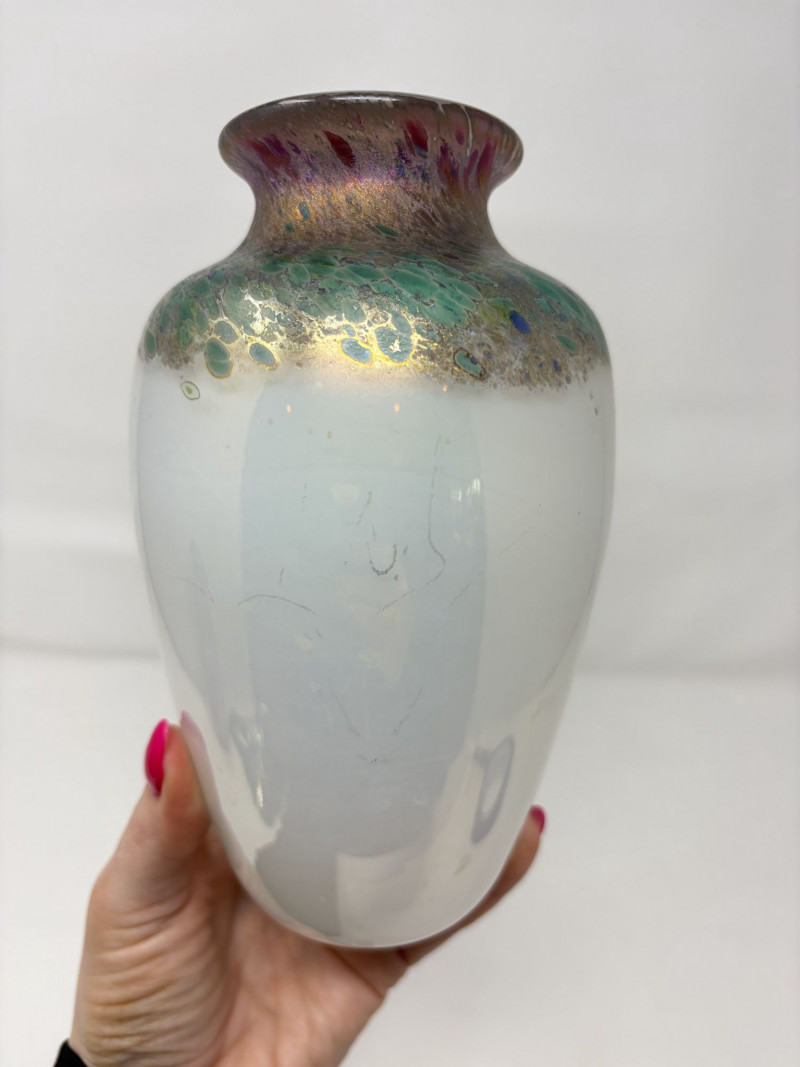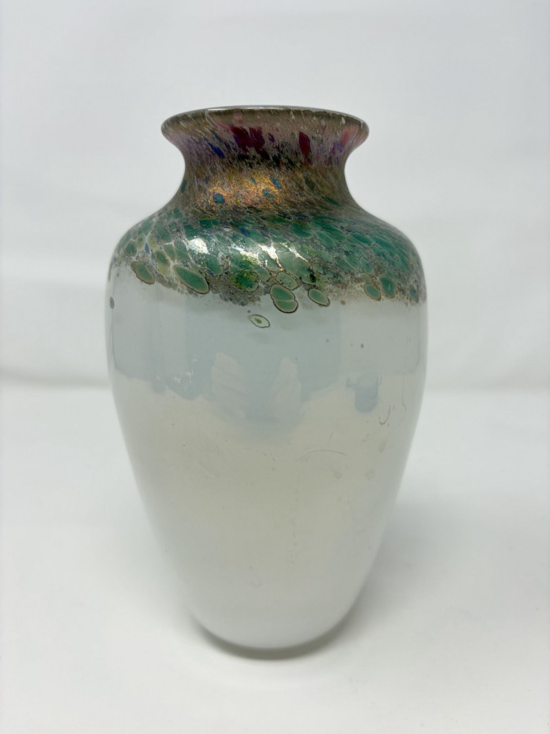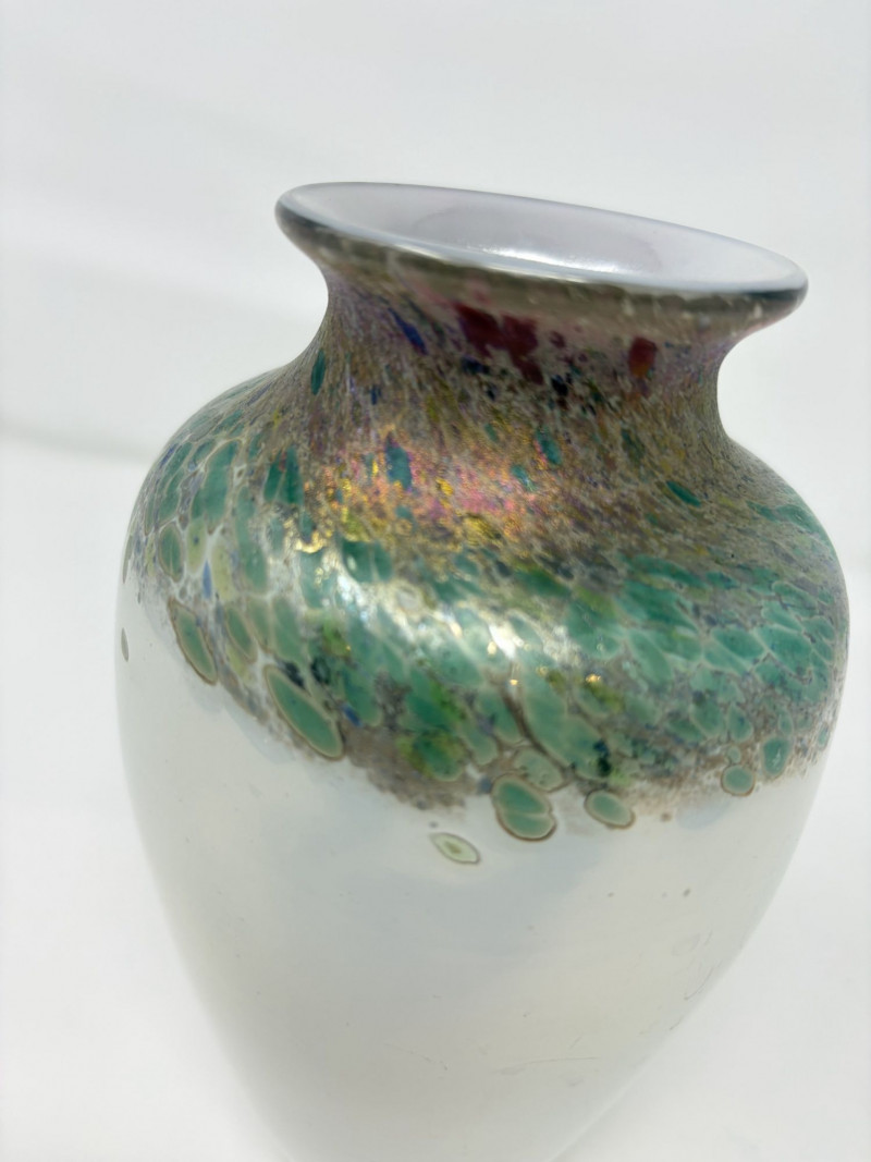 Robert Held Signed White Iridescent Blown Art Glass Vase.