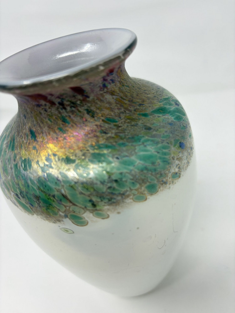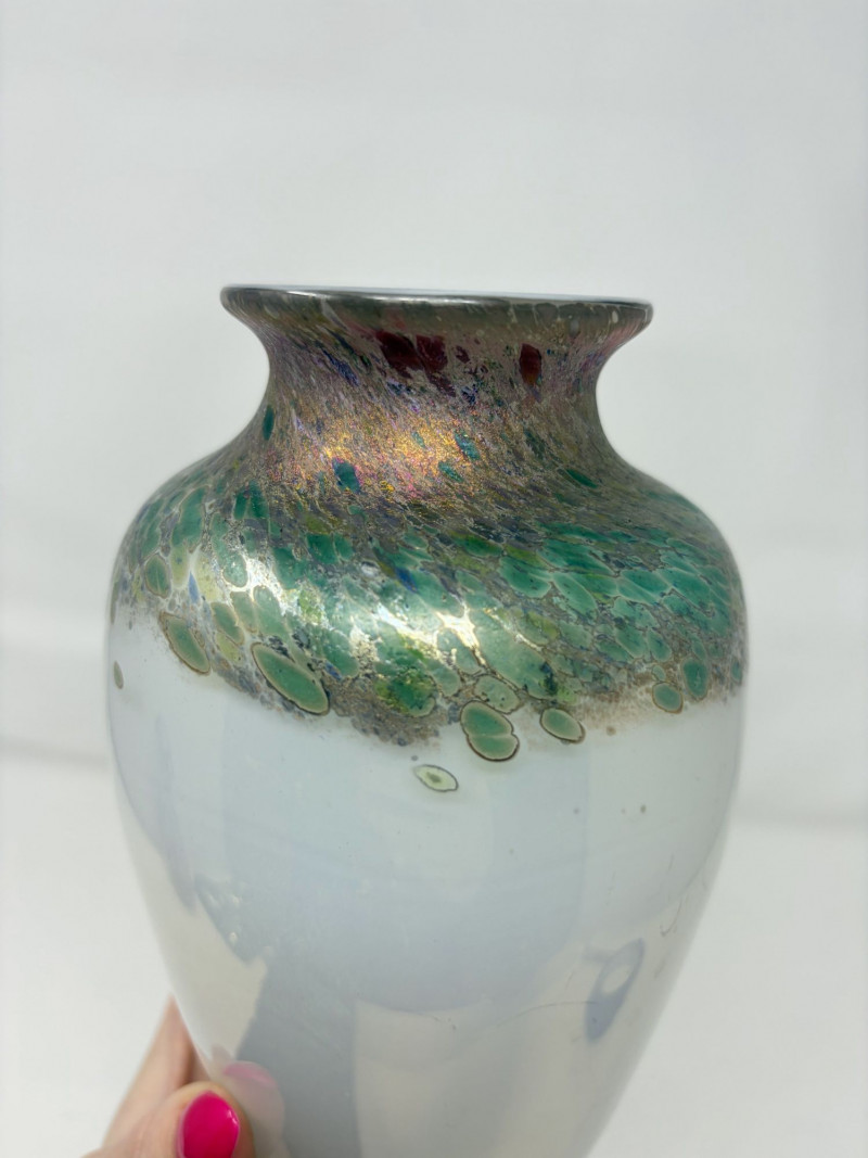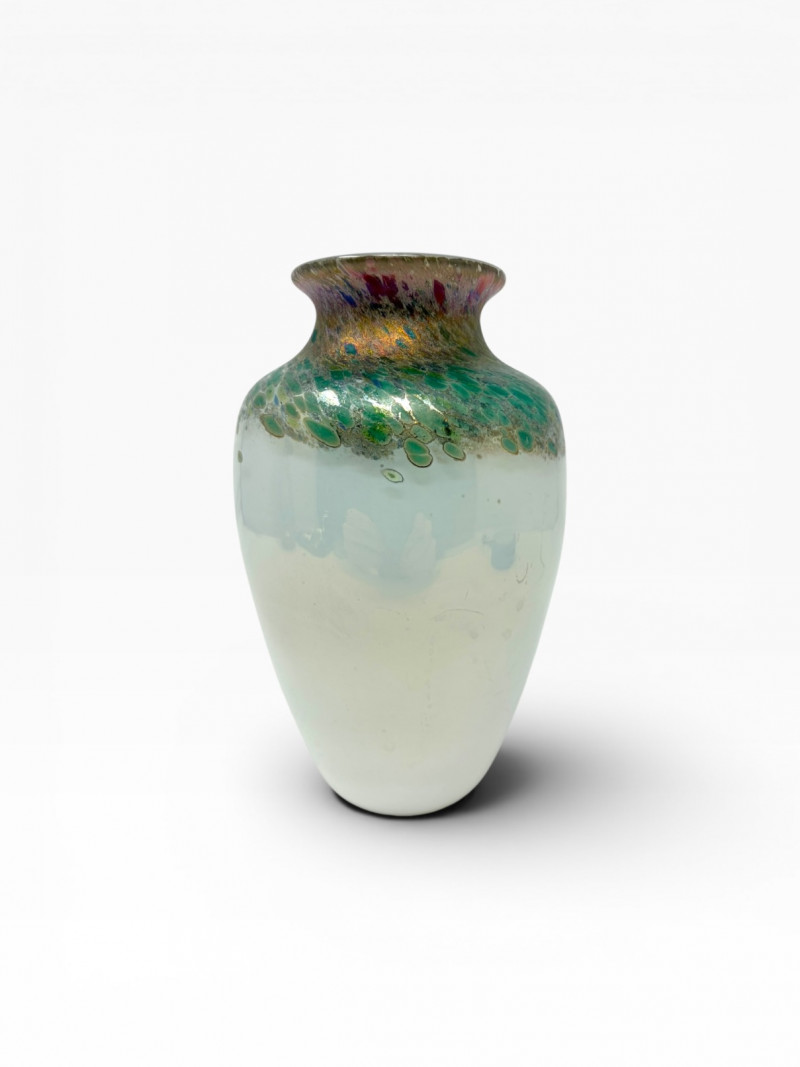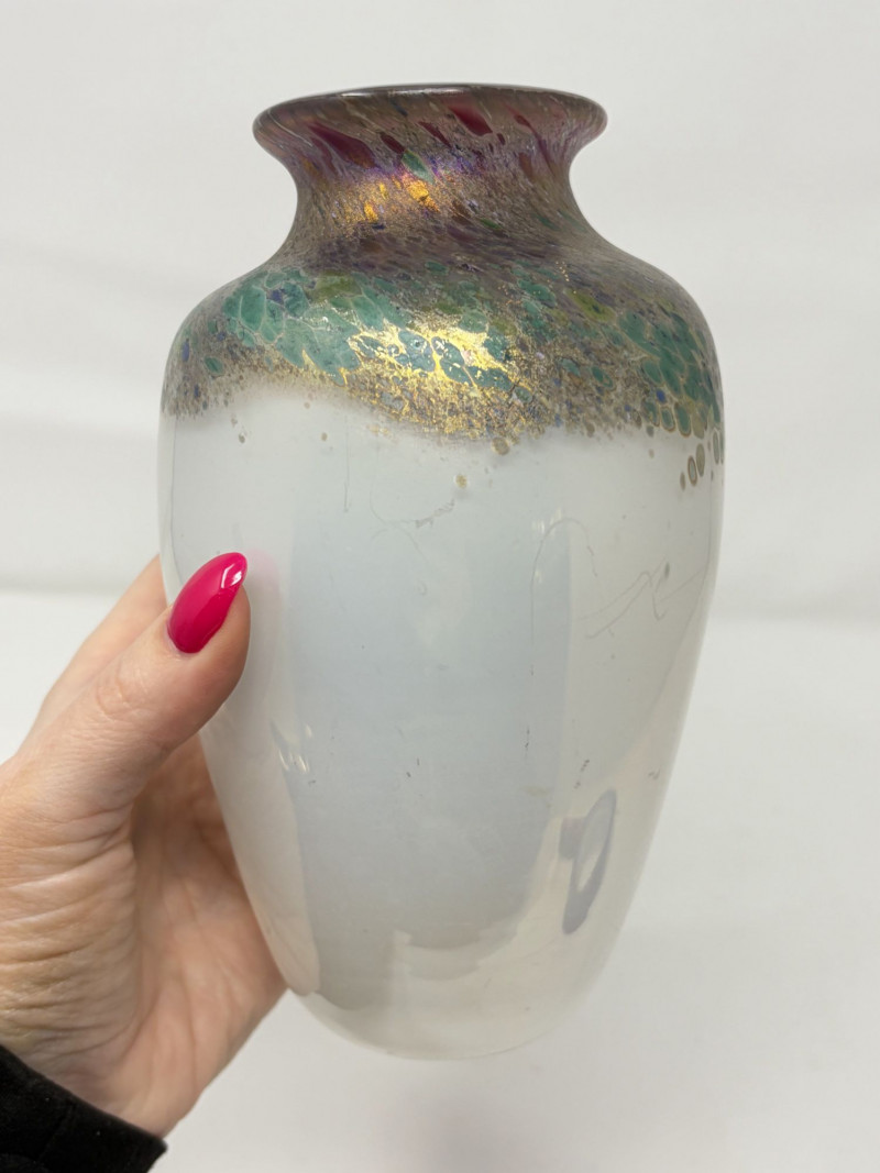 Robert Held Signed White Iridescent Blown Art Glass Vase.