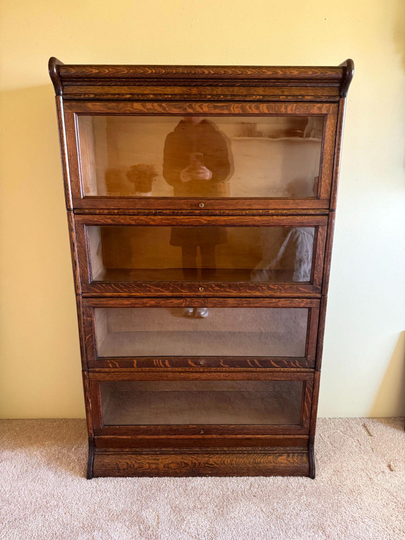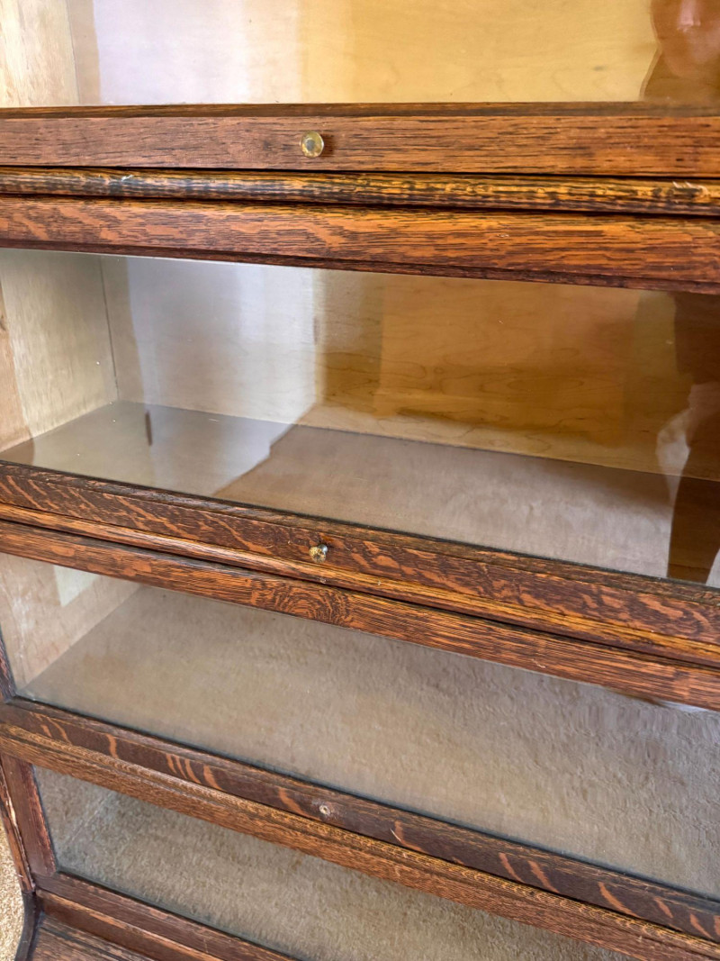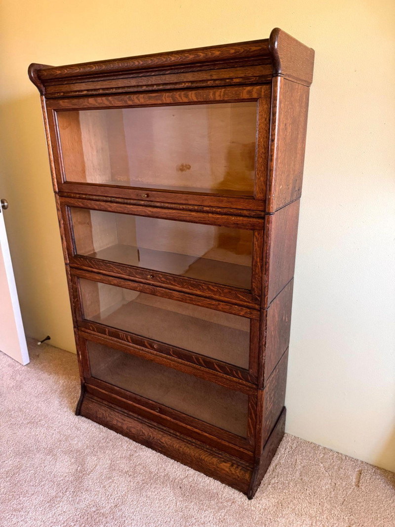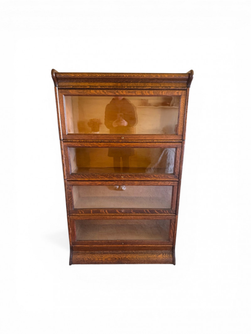 4 Tier Barrister Style Bookcase w/ Glass Front Doors. Bidding on this lot is an agreement that: (1.) You will have at least 2 capable, able bodied persons to lift and load at a minimum. (2.) You will bring a hand truck and/or any other tools needed to remove this item. If these steps are not followed your item will be forfeit and no refund given.