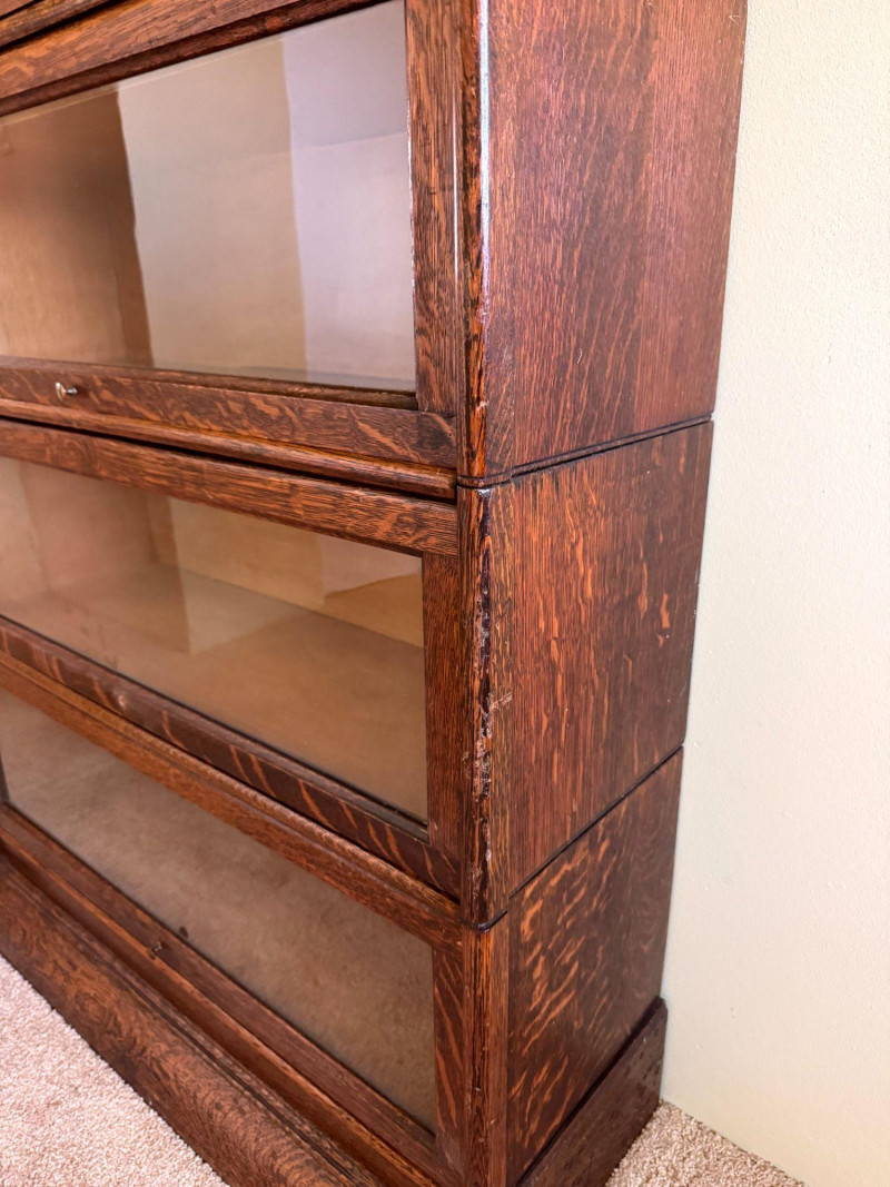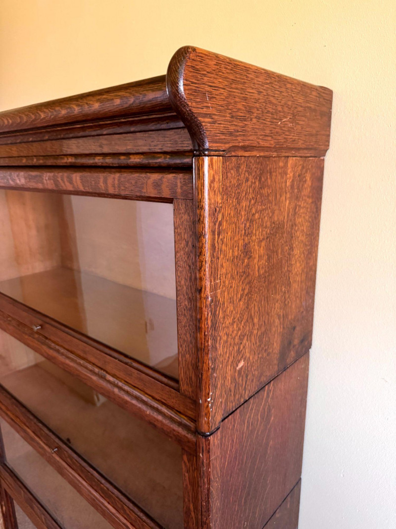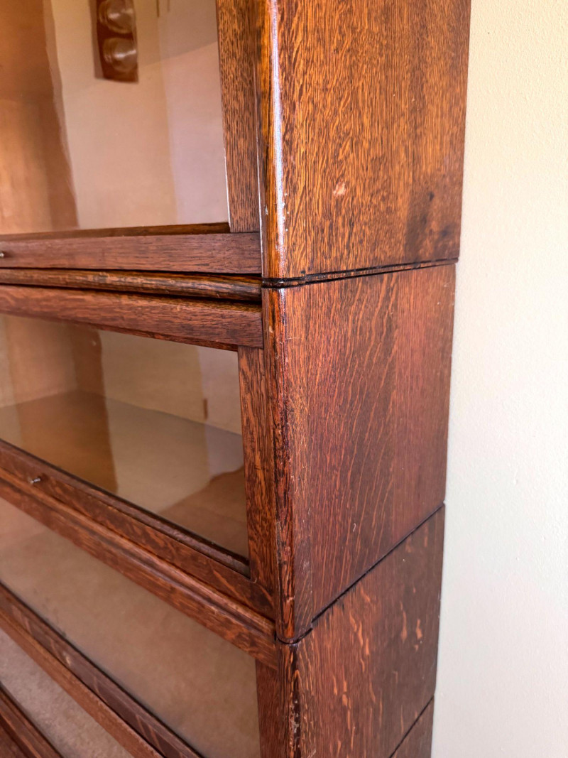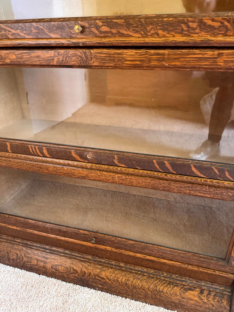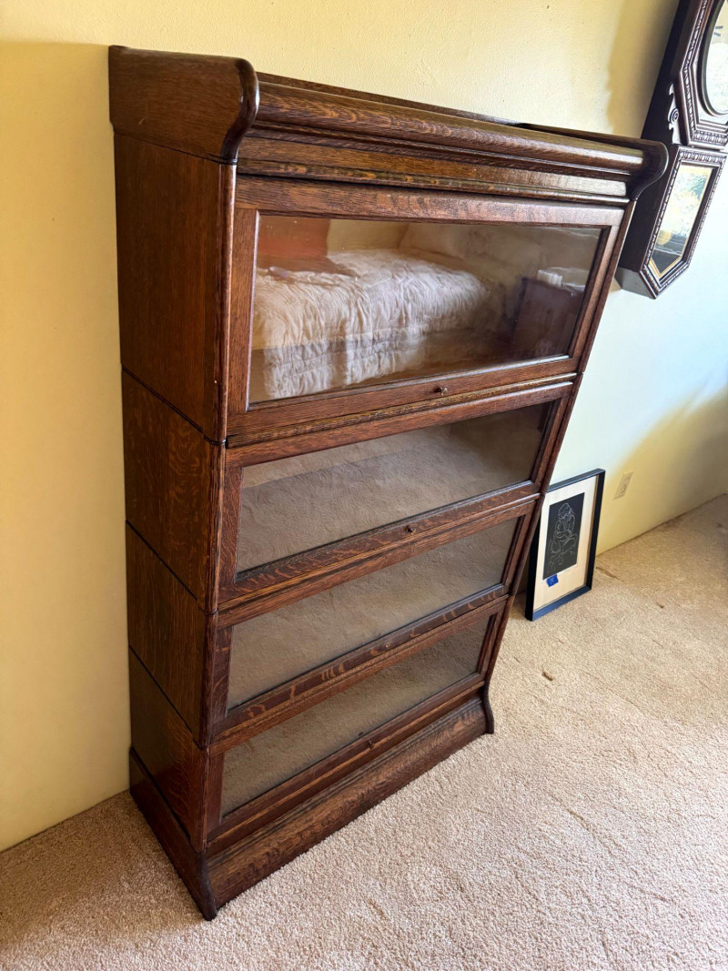 4 Tier Barrister Style Bookcase w/ Glass Front Doors. Bidding on this lot is an agreement that: (1.) You will have at least 2 capable, able bodied persons to lift and load at a minimum. (2.) You will bring a hand truck and/or any other tools needed to remove this item. If these steps are not followed your item will be forfeit and no refund given.