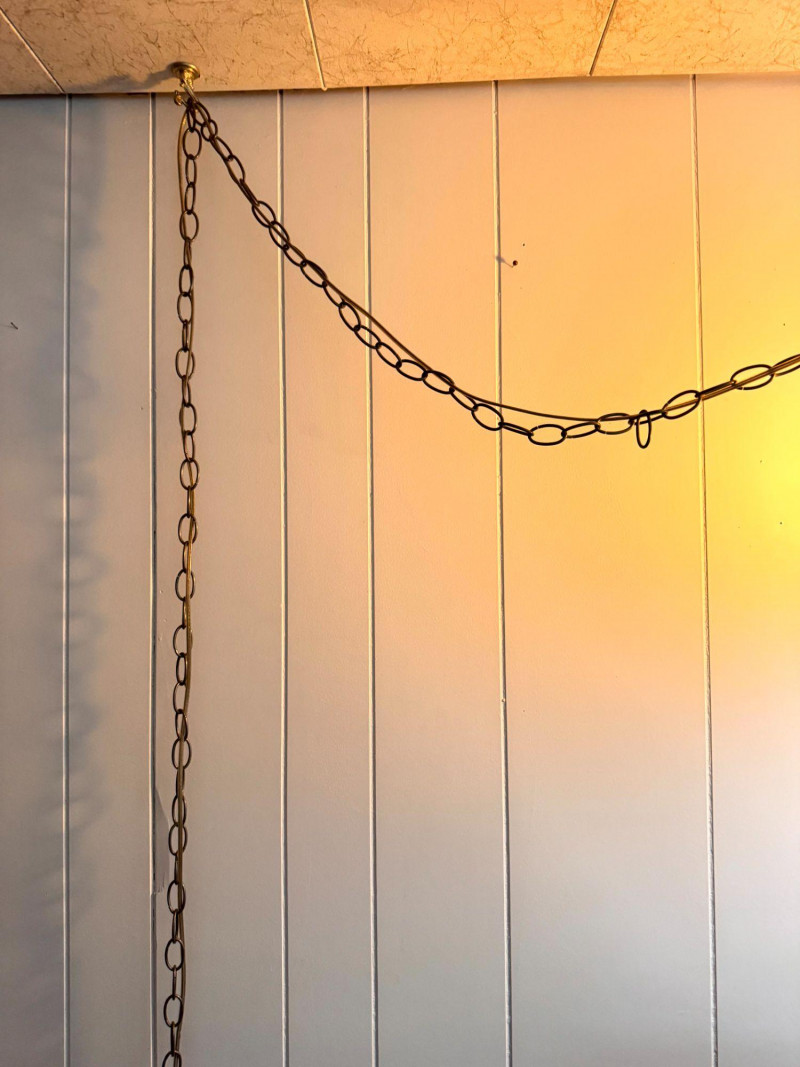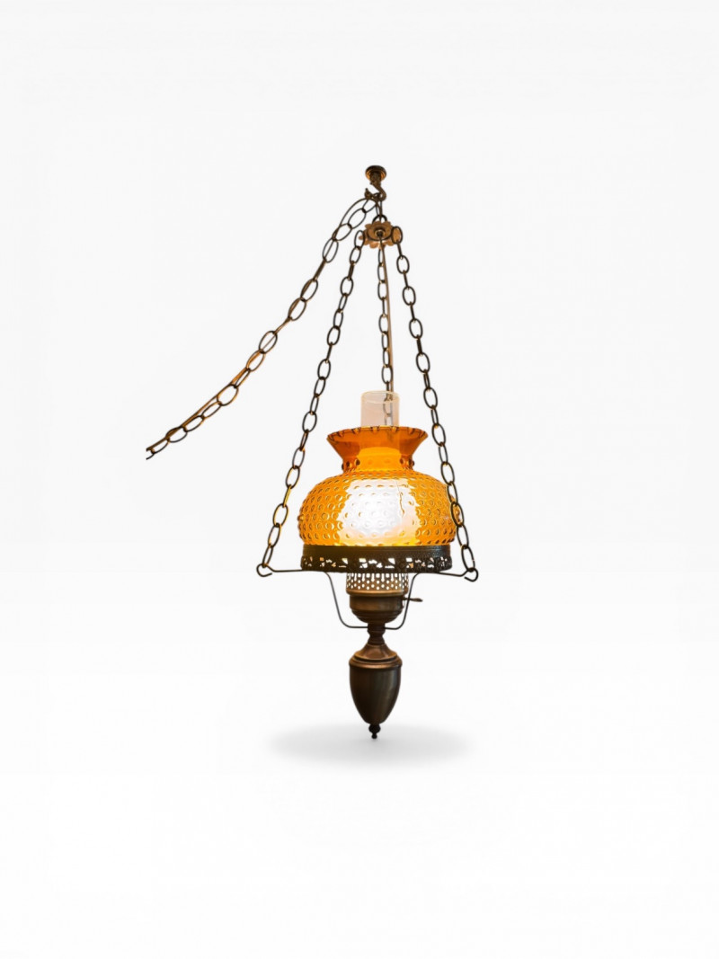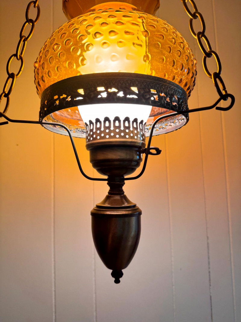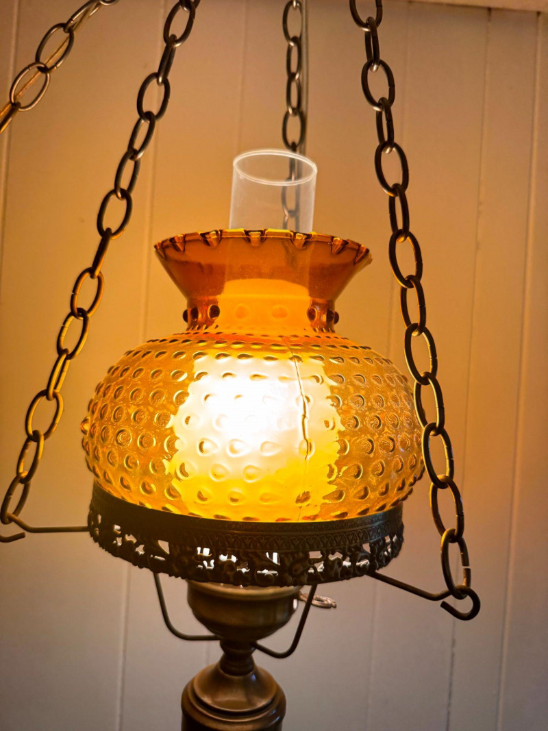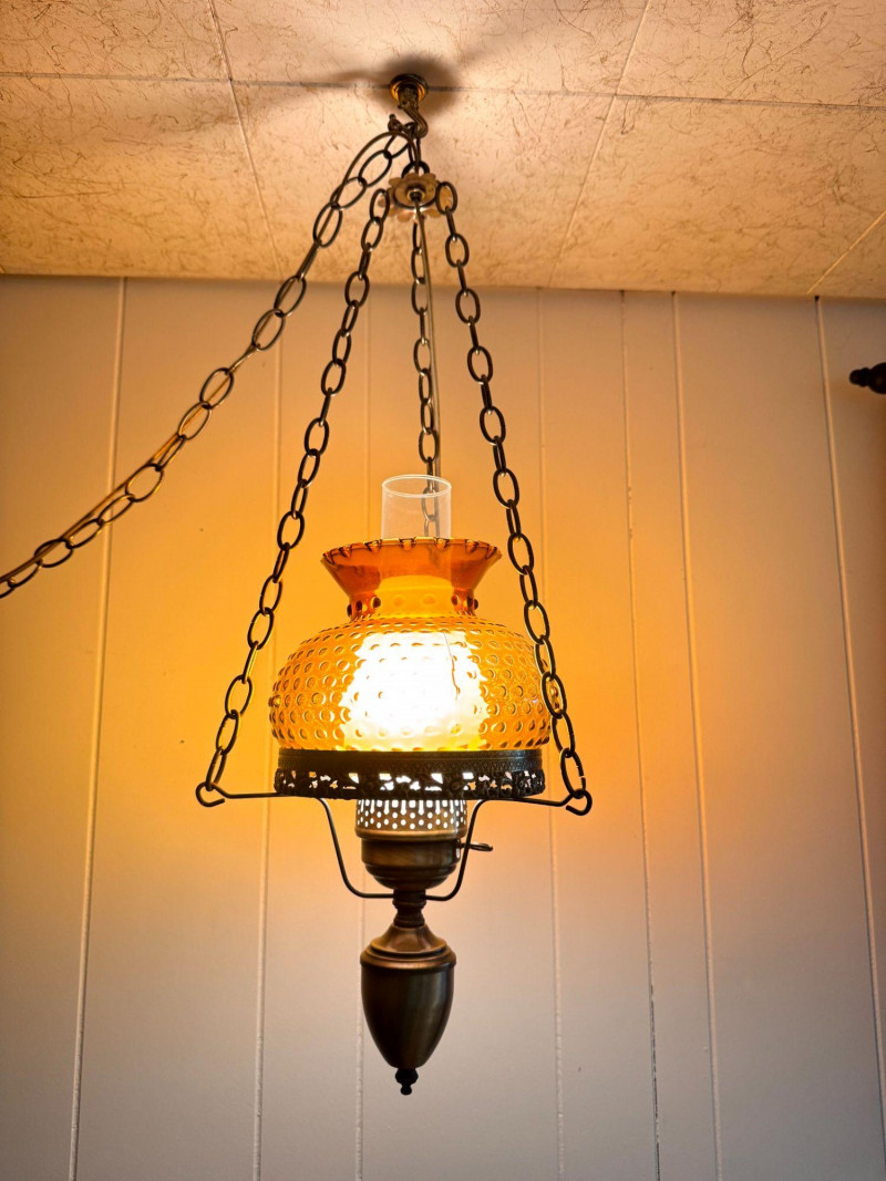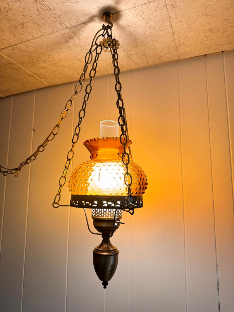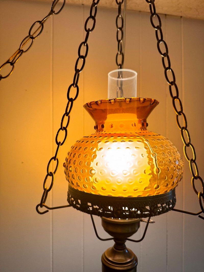 Amber Hanging Hobnail Swag Lamp w/ Hurricane-Style Glass Chimney.