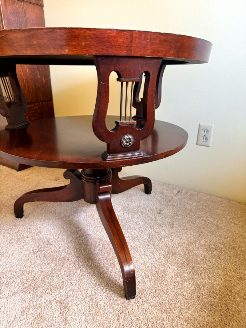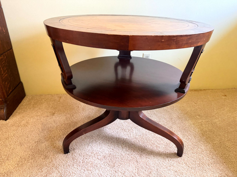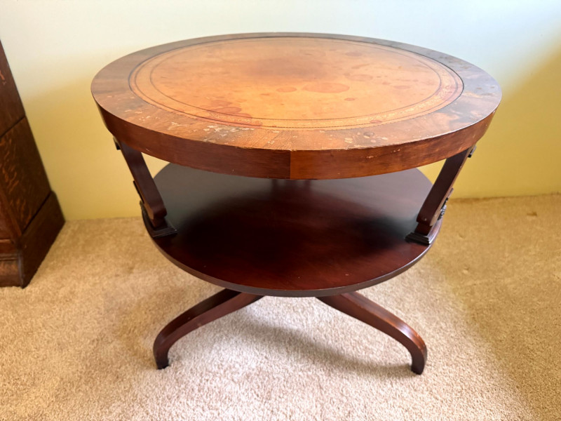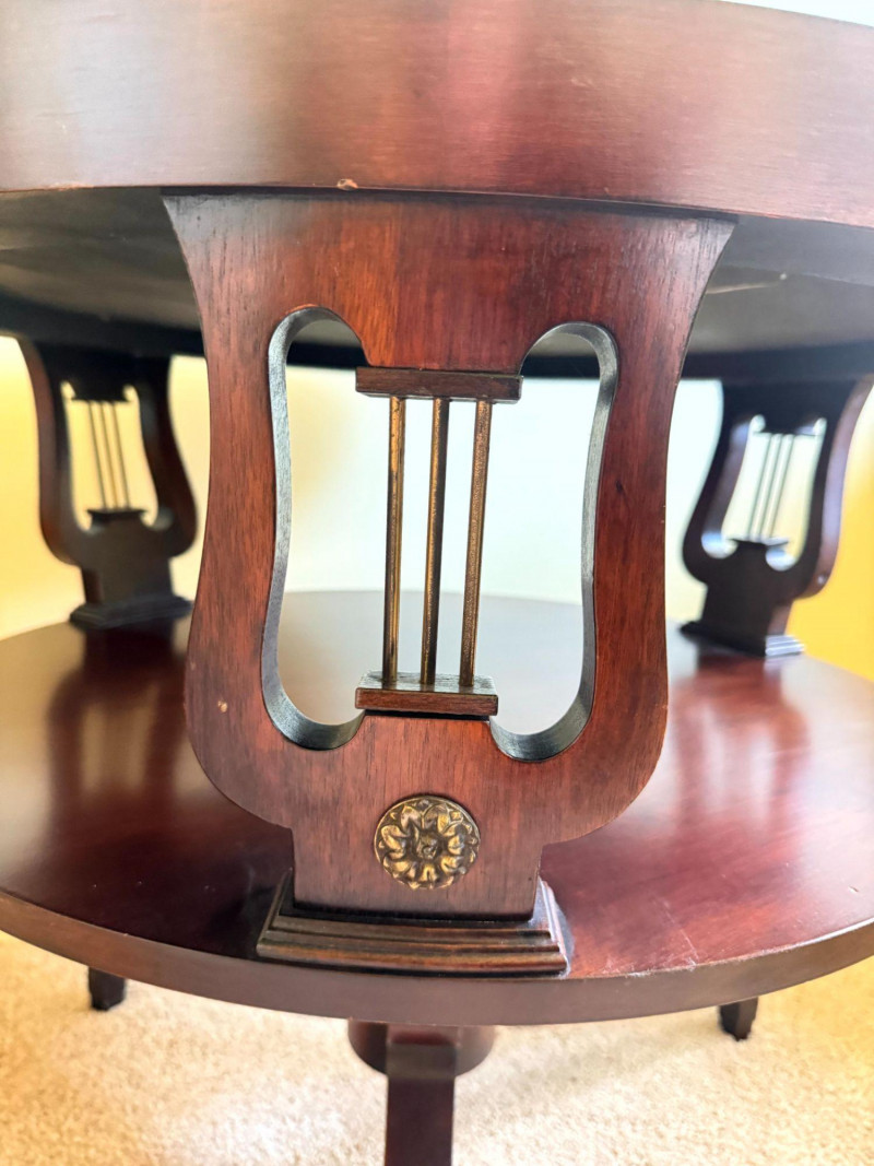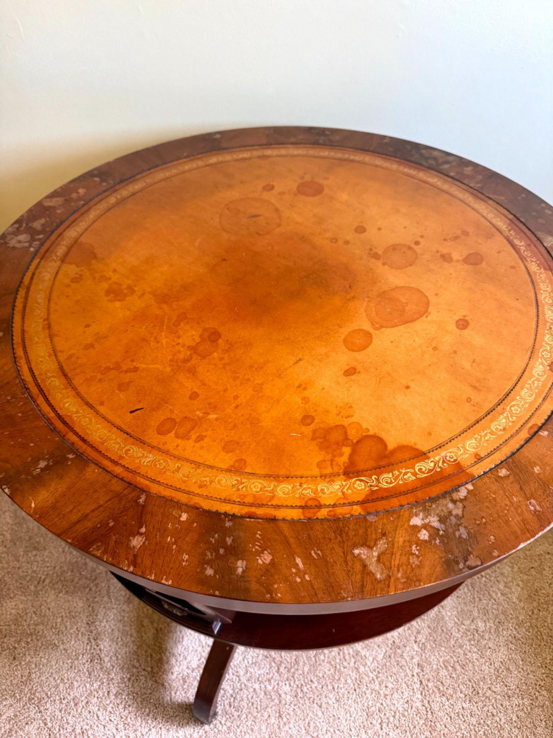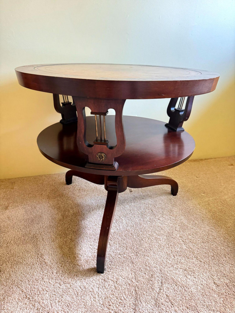 Antique Round Side Table w/ Leather Inlay & Lyre Base.