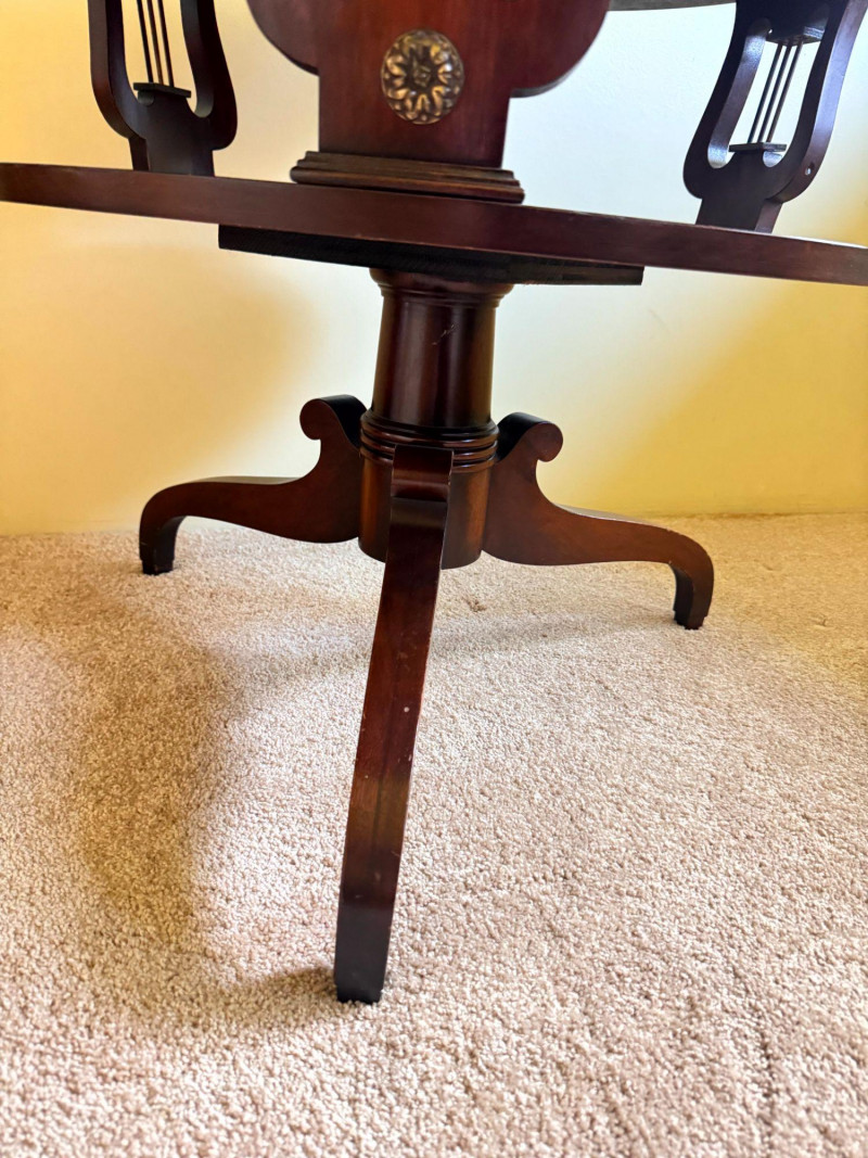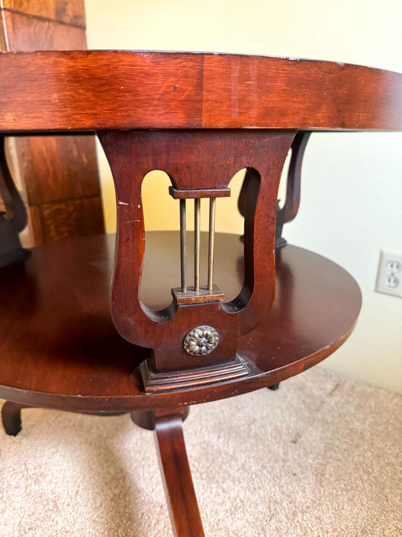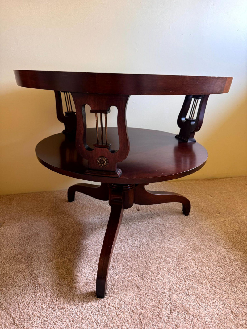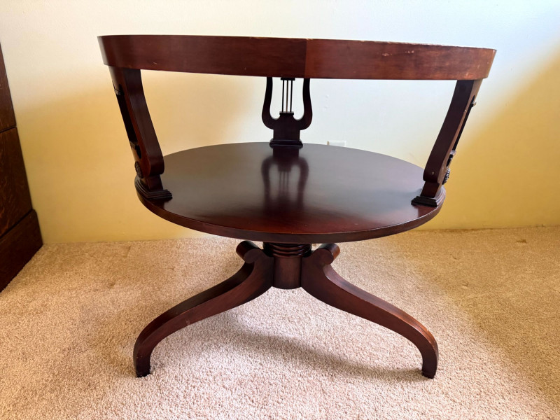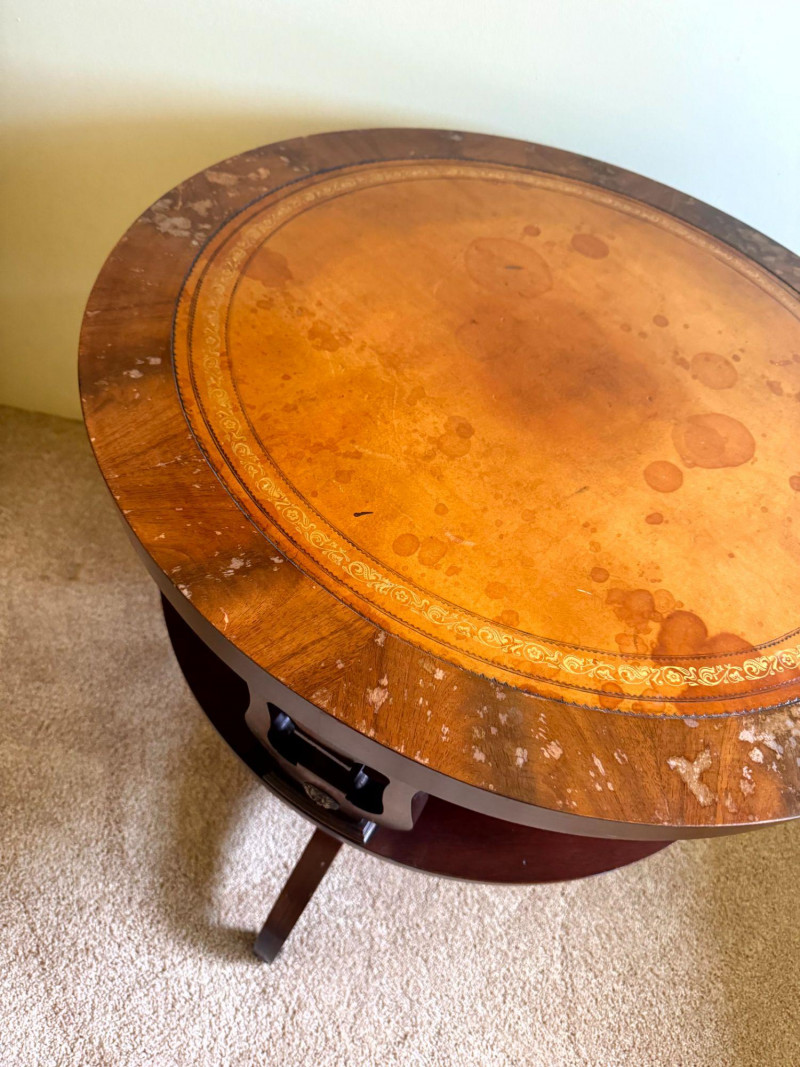Antique Round Side Table w/ Leather Inlay & Lyre Base.