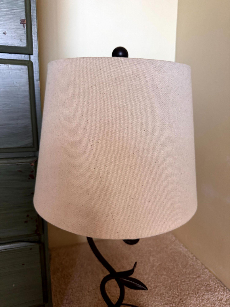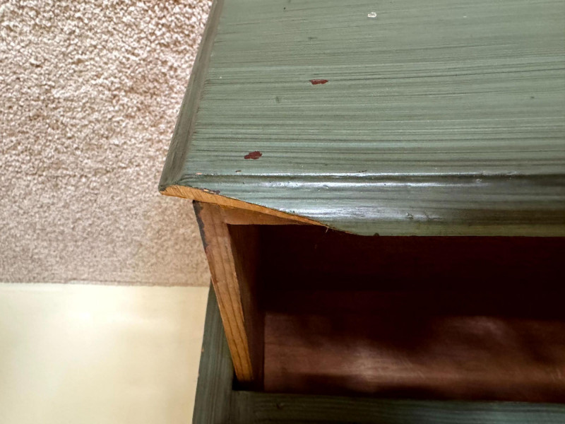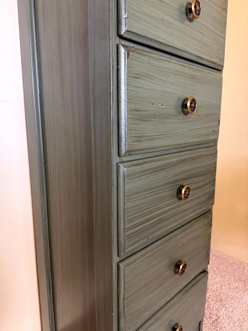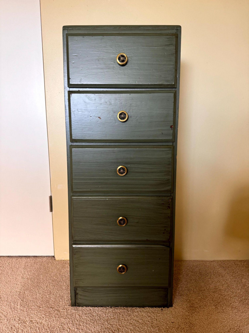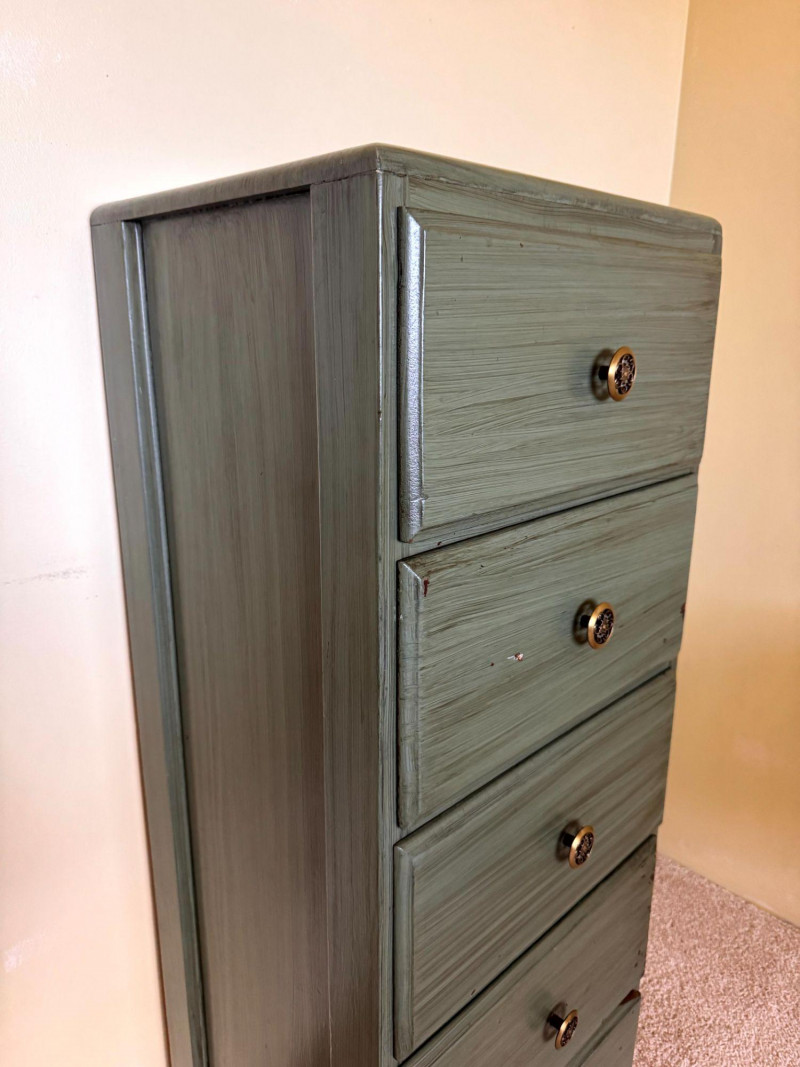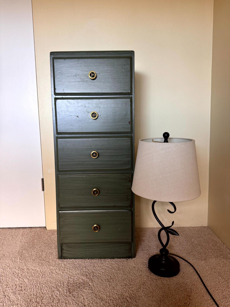 Vintage Green Painted 5 Drawer Dresser w/ Curved Metal Base Table Lamp.