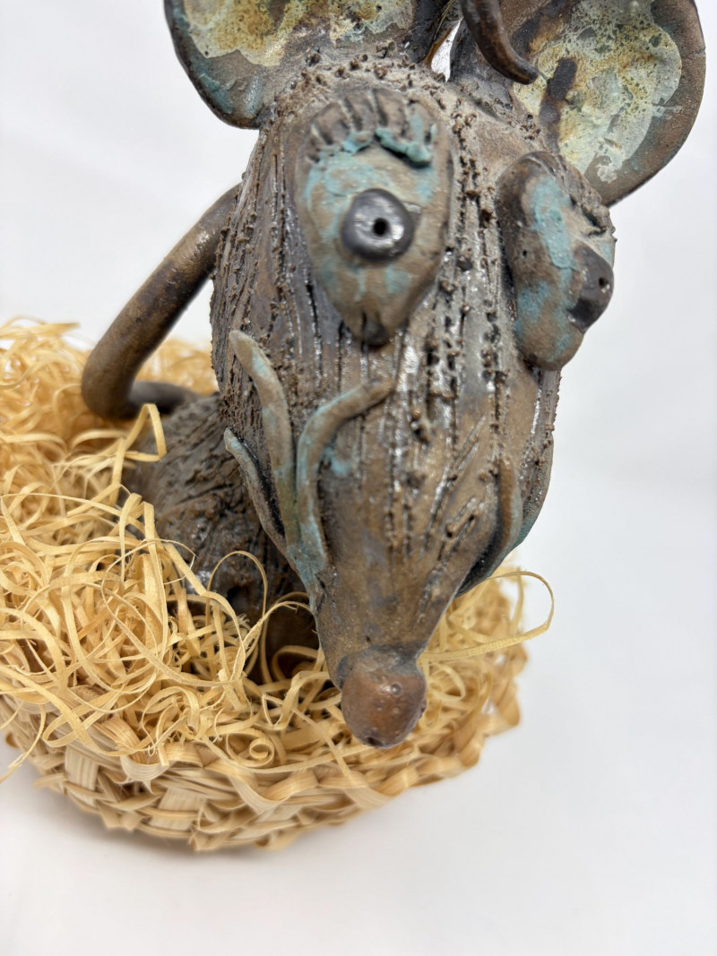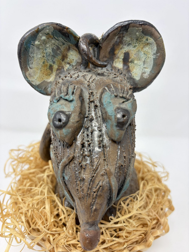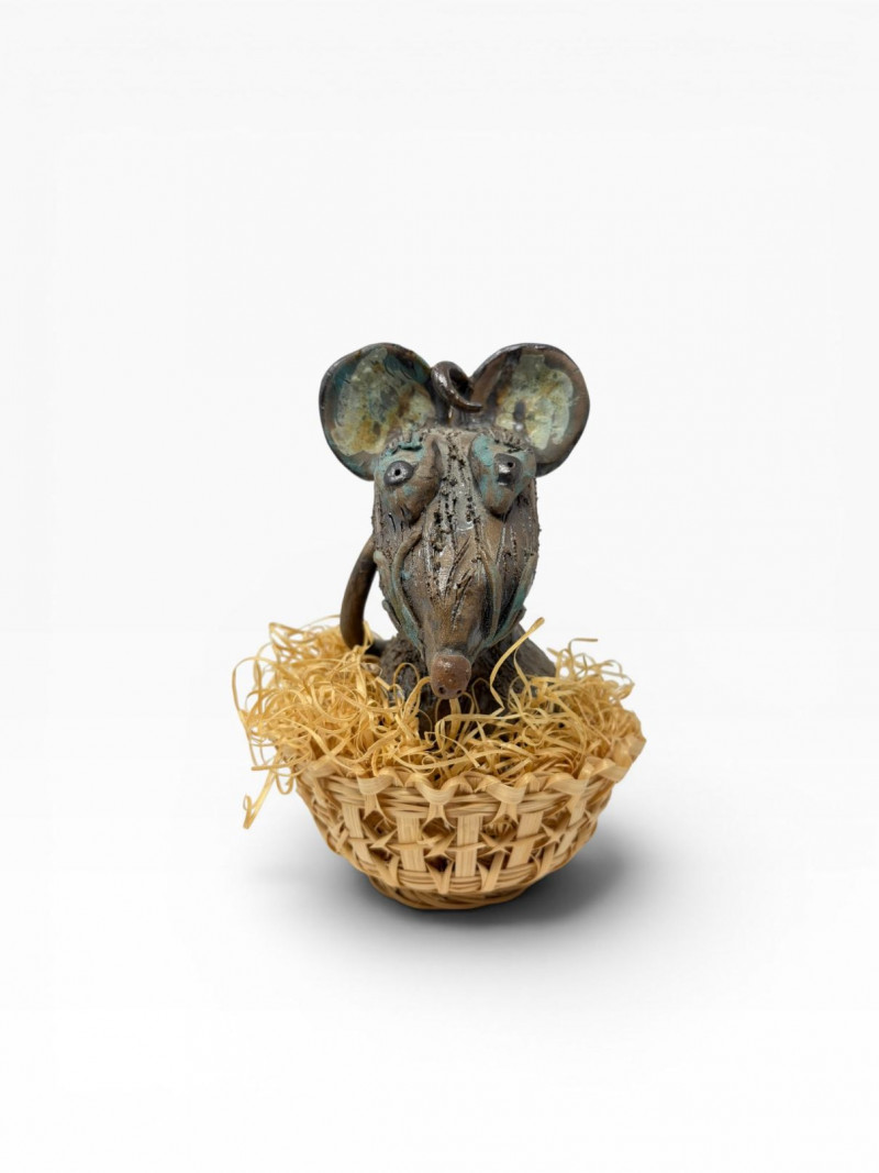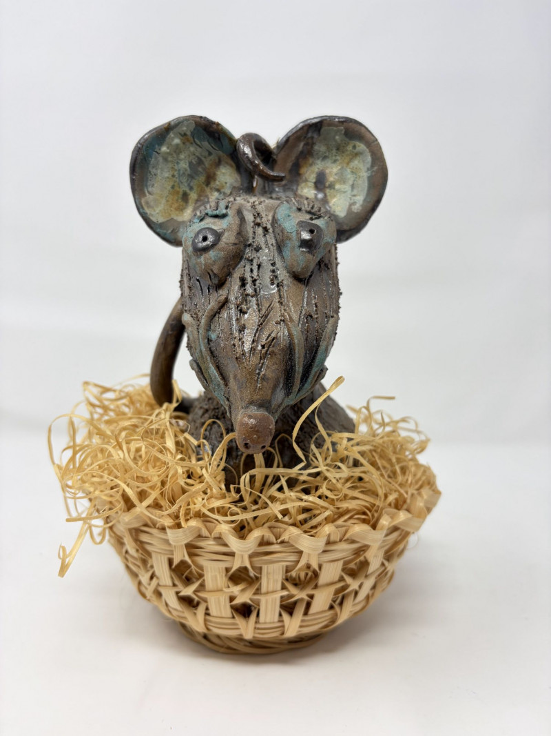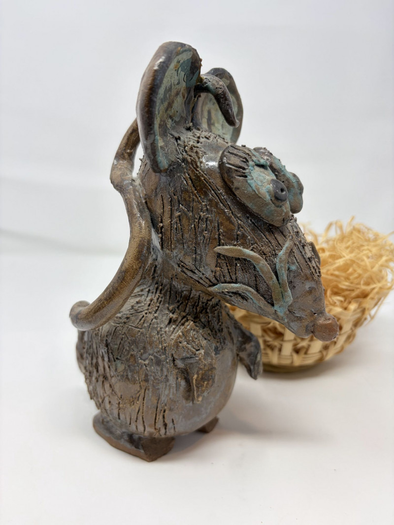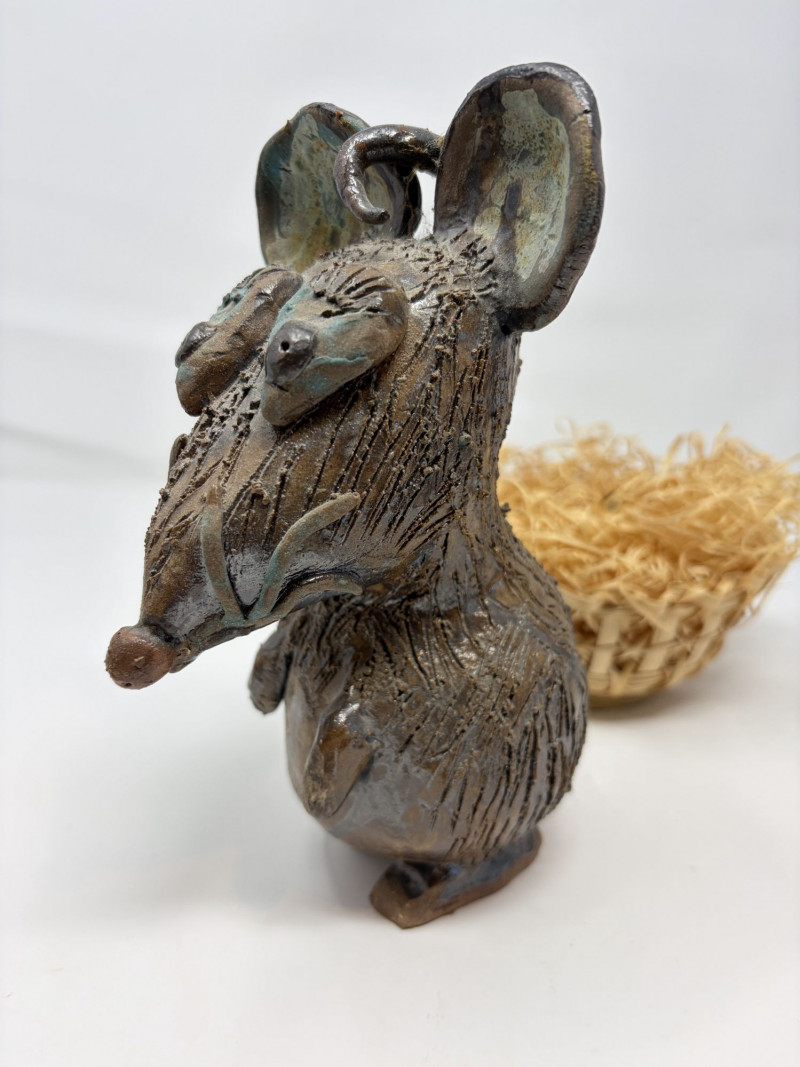 Handcrafted Pottery Mouse Sculpture w/ Basket – Folk Art Style.