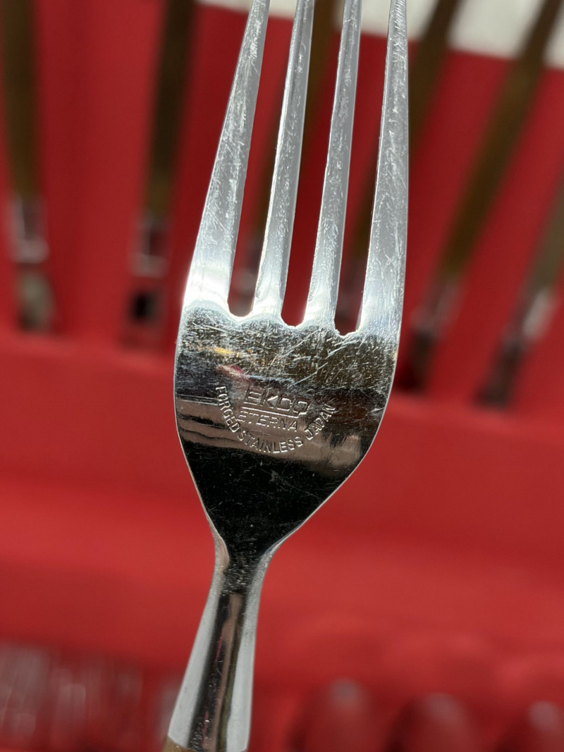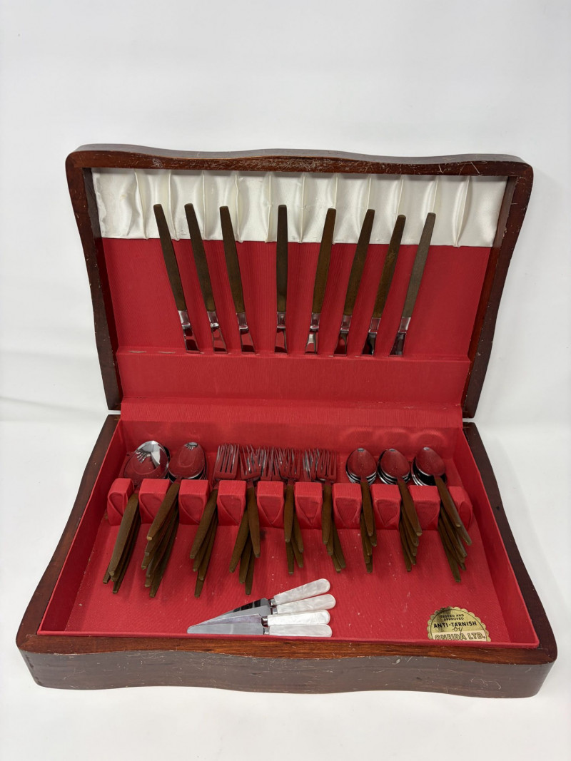 Vintage MCM Flatware Set for 8 w/ Wood Handles & Serving Pieces.