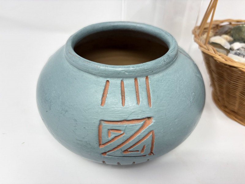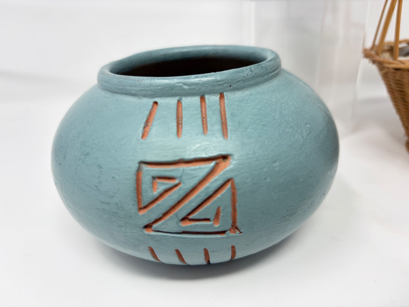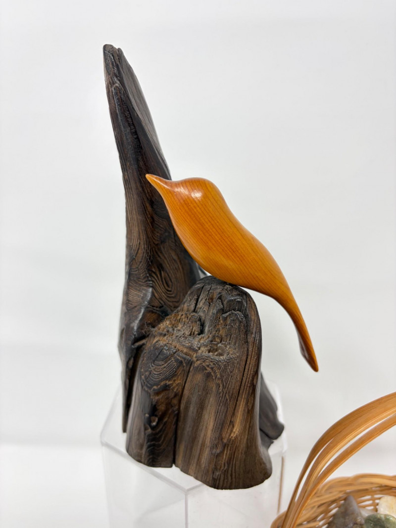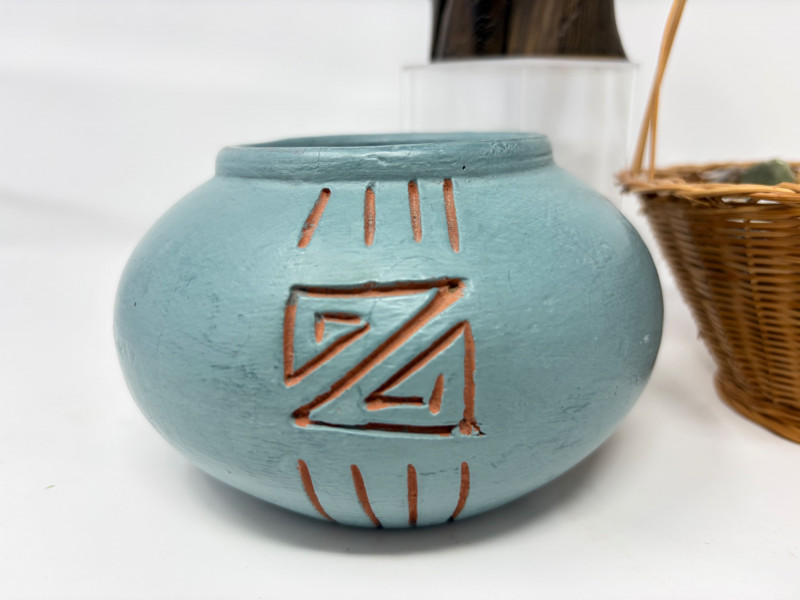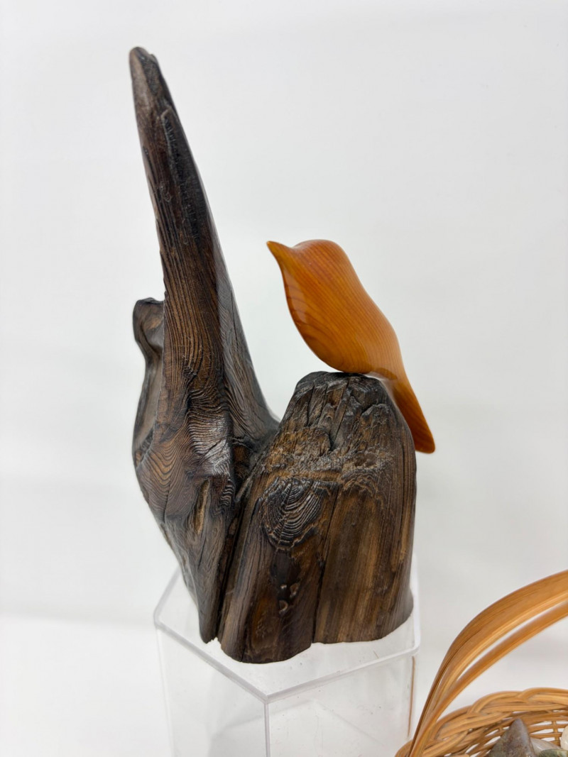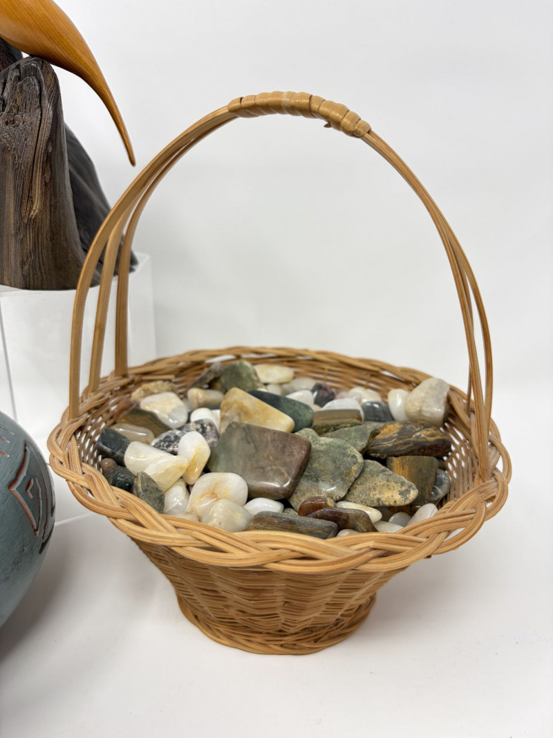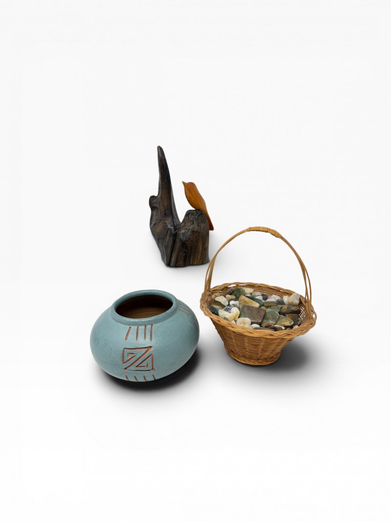 Lot # 70 - Vintage Wood Bird Carving, Teal Pottery Bowl & Stone Basket