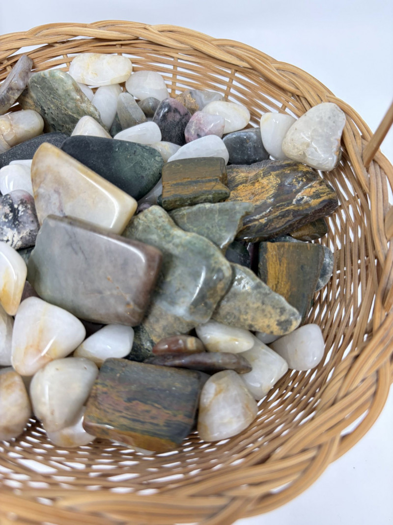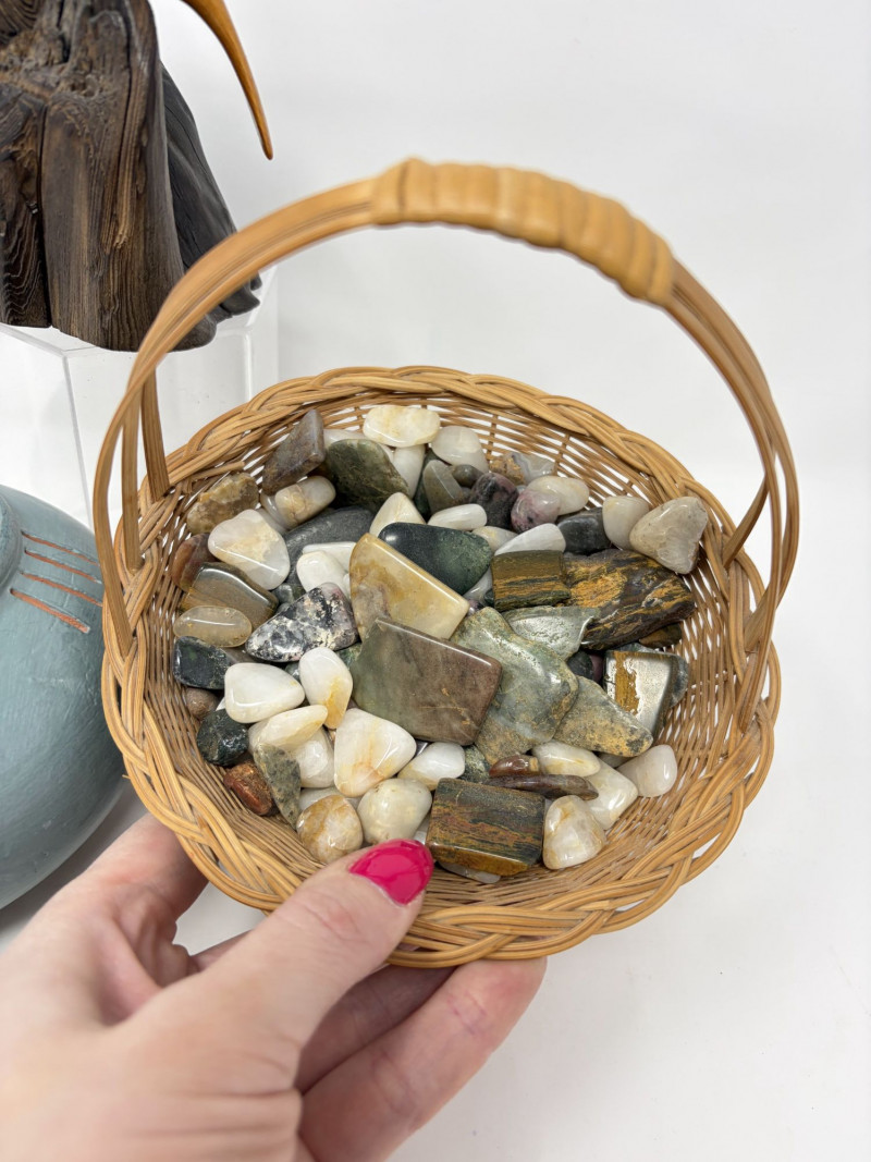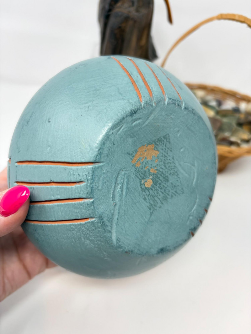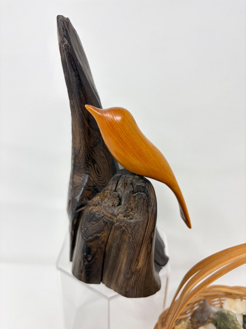 Vintage Wood Bird Carving, Teal Pottery Bowl & Stone Basket.