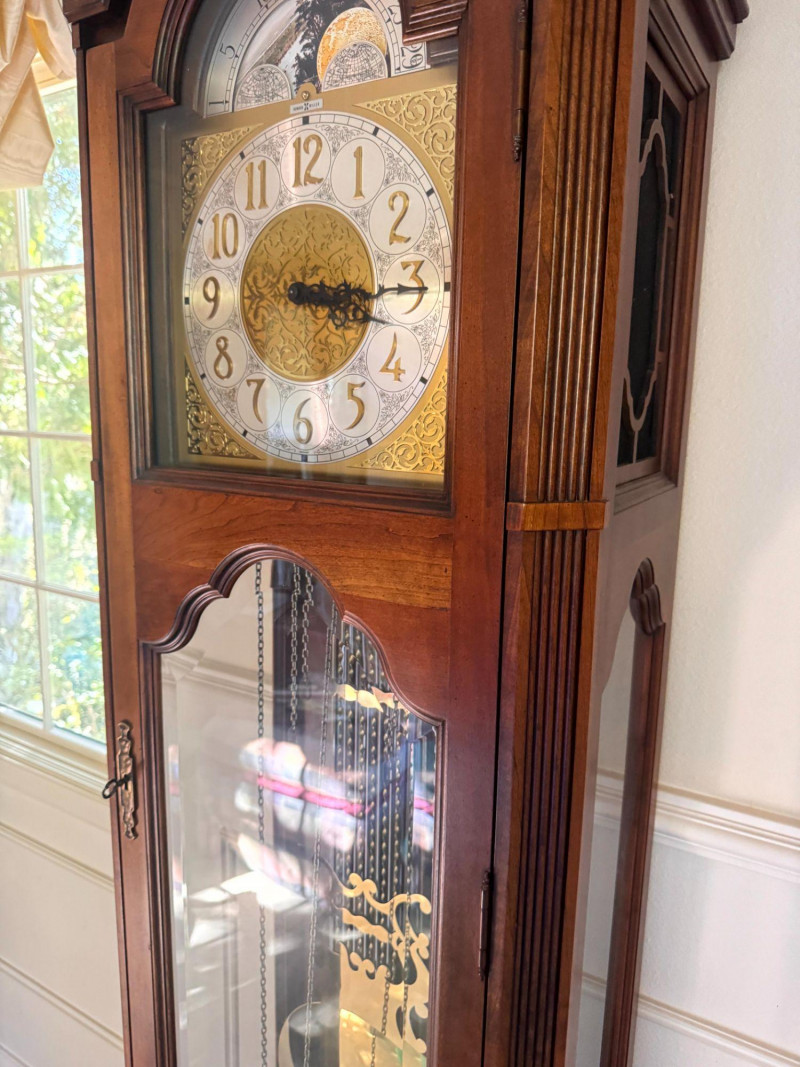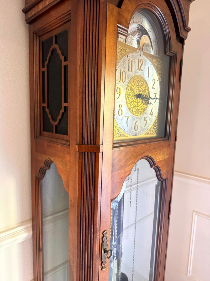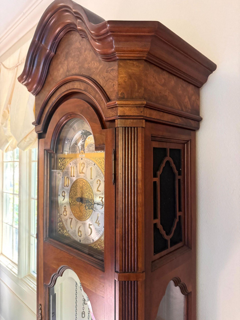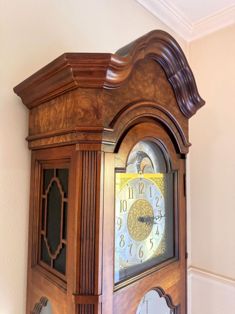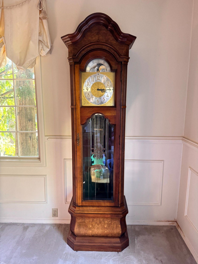 Antique-Style Howard Miller Grandfather Clock w/ Arched Top Design. Bidding on this lot is an agreement that: (1.) You will have at least 2 capable, able bodied persons to lift and load at a minimum. (2.) You will bring a hand truck and/or any other tools needed to remove this item. If these steps are not followed your item will be forfeit and no refund given.