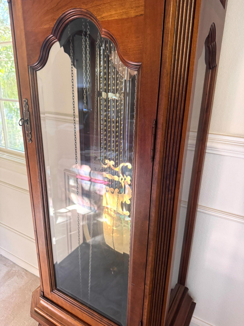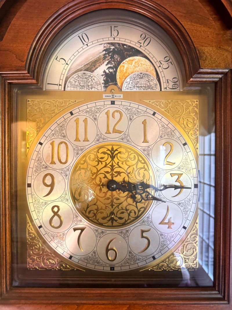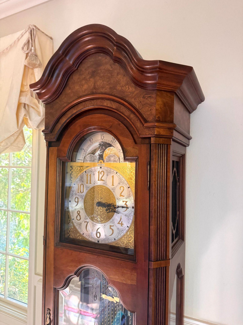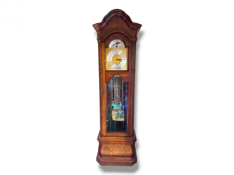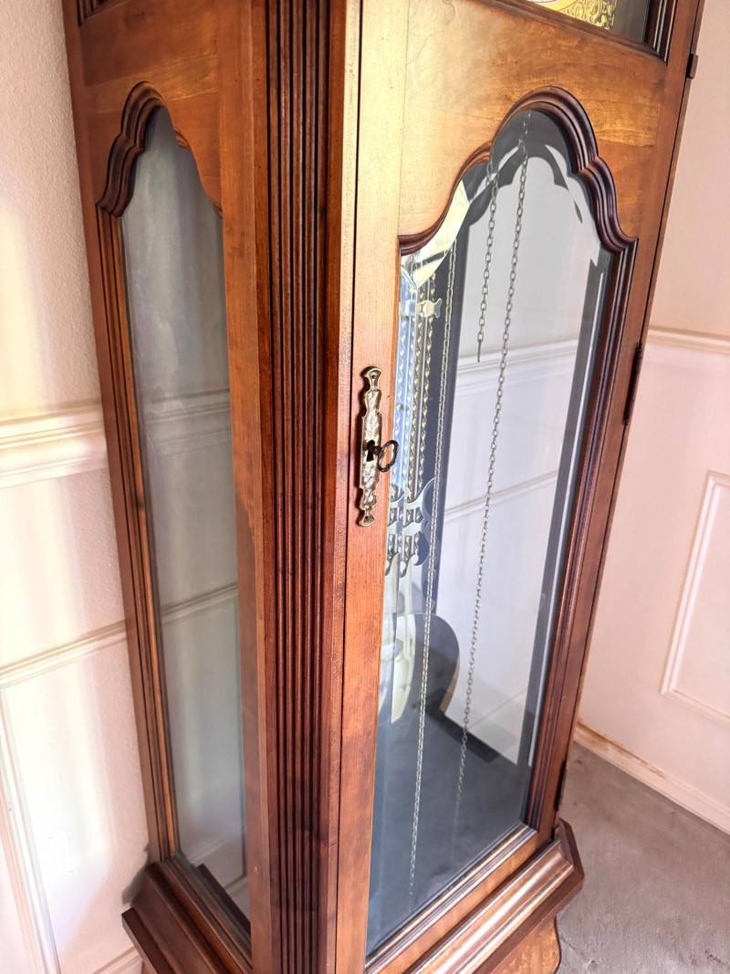 Antique-Style Howard Miller Grandfather Clock w/ Arched Top Design. Bidding on this lot is an agreement that: (1.) You will have at least 2 capable, able bodied persons to lift and load at a minimum. (2.) You will bring a hand truck and/or any other tools needed to remove this item. If these steps are not followed your item will be forfeit and no refund given.