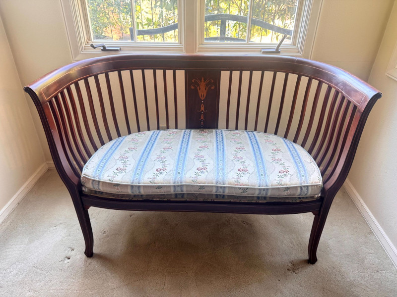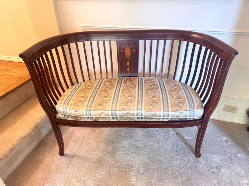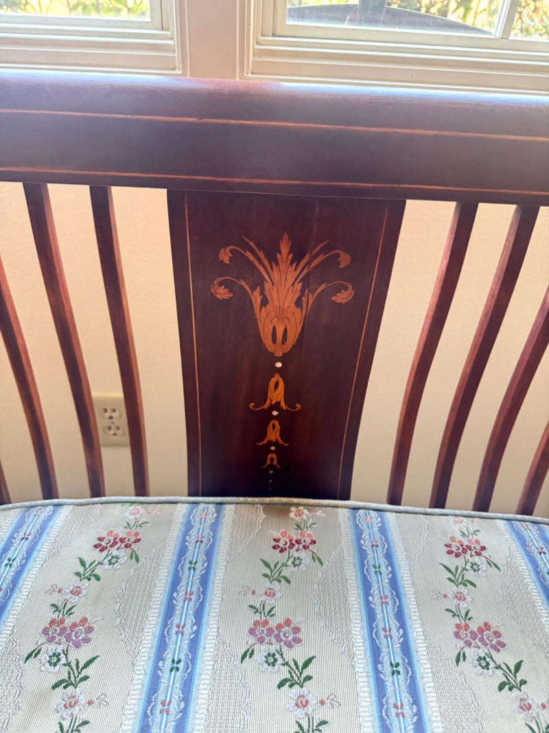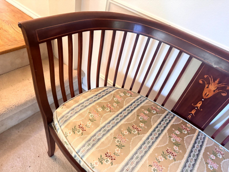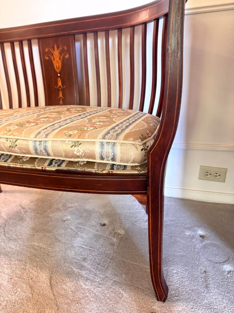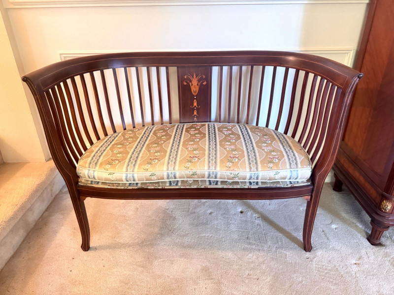 Lot # 19 - Antique Wood Settee Bench w/ Slat Back & Inlay Design, Upholstered