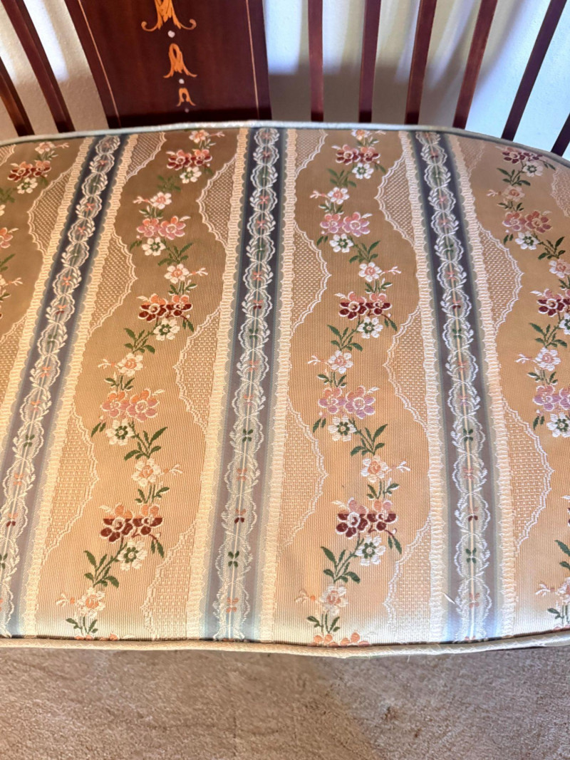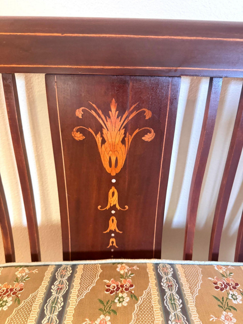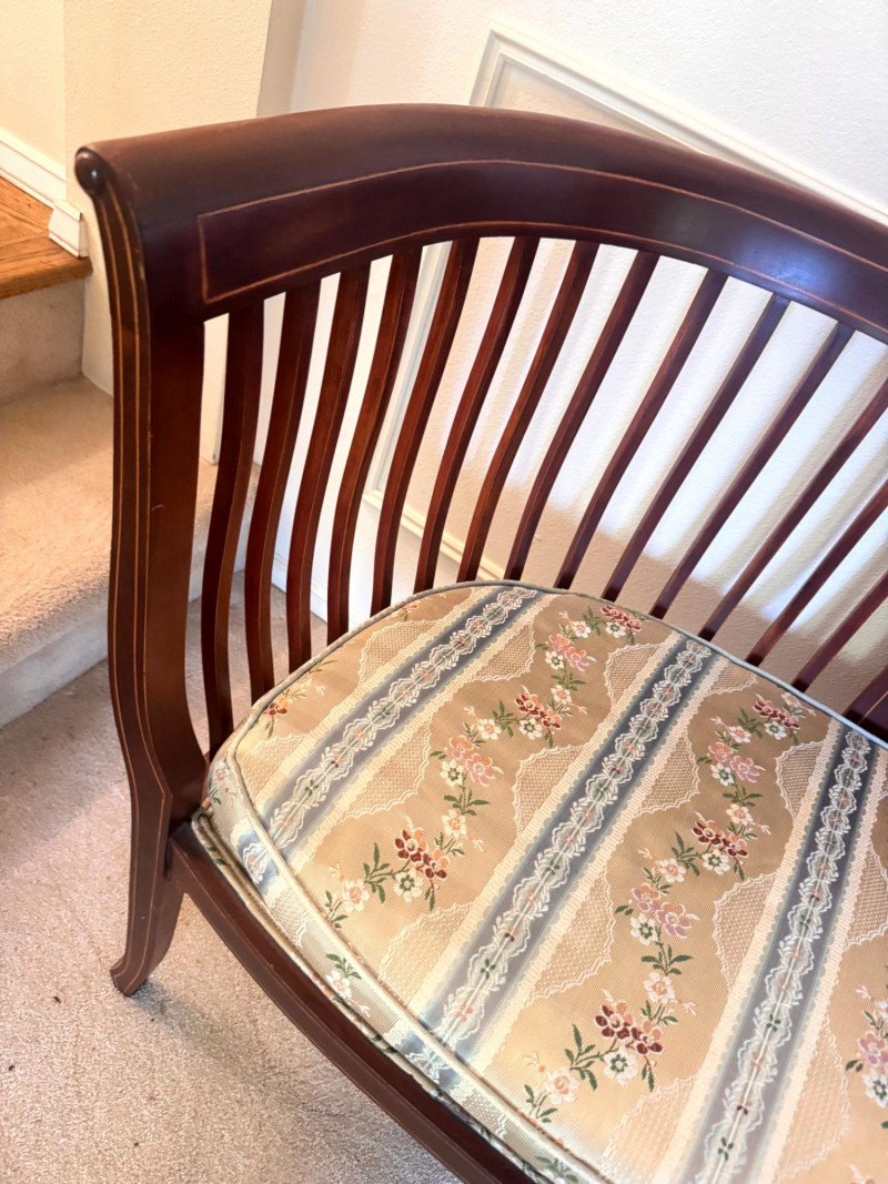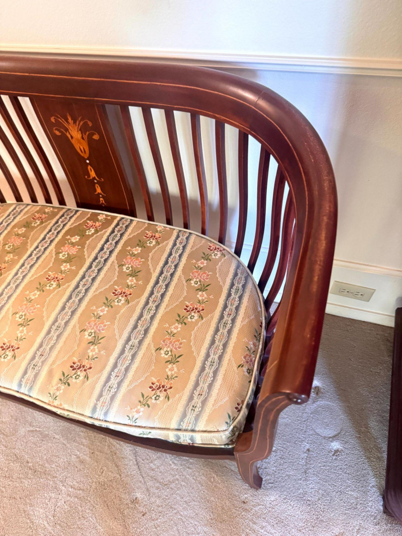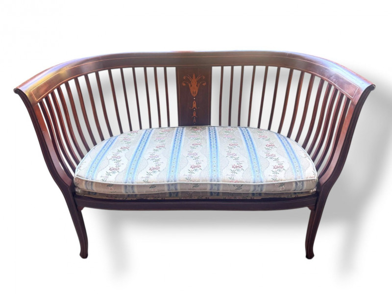 Lot # 19 - Antique Wood Settee Bench w/ Slat Back & Inlay Design, Upholstered