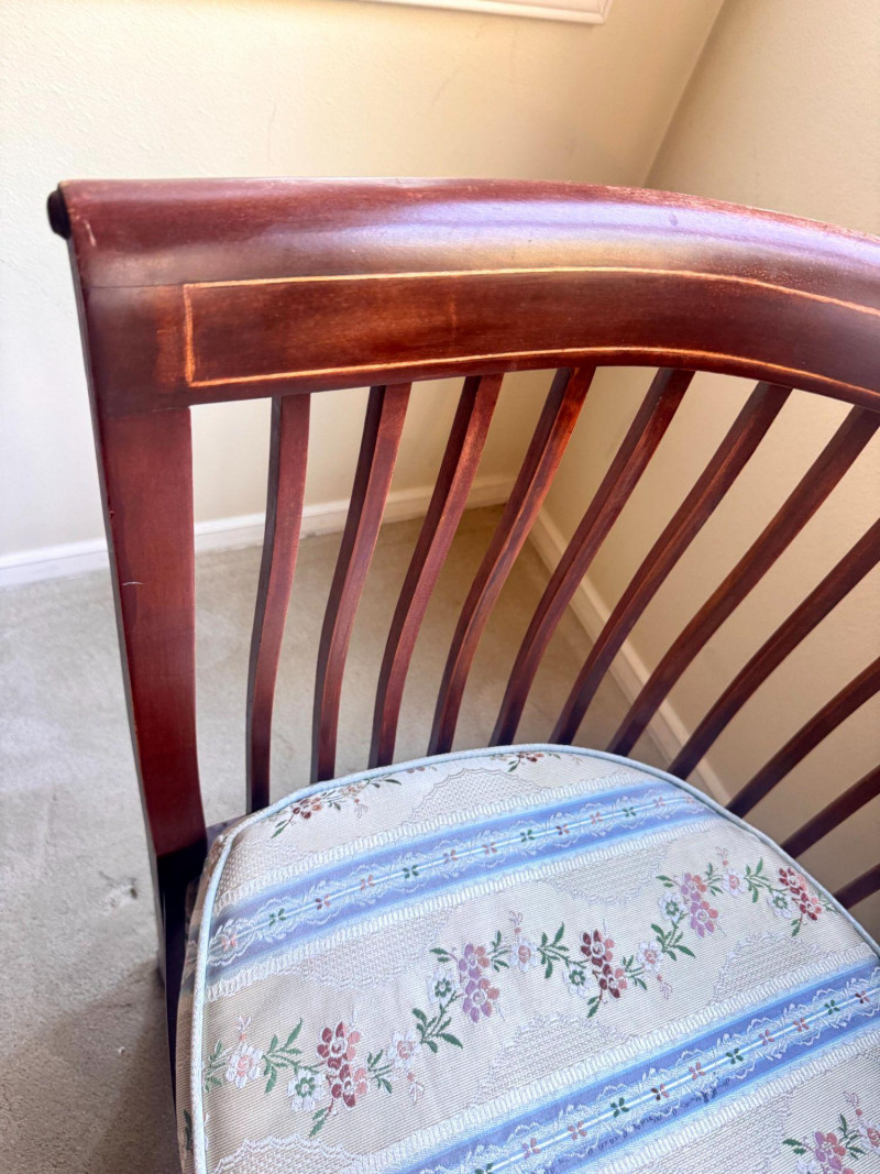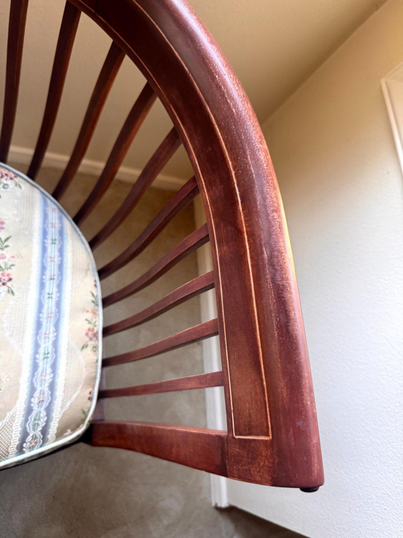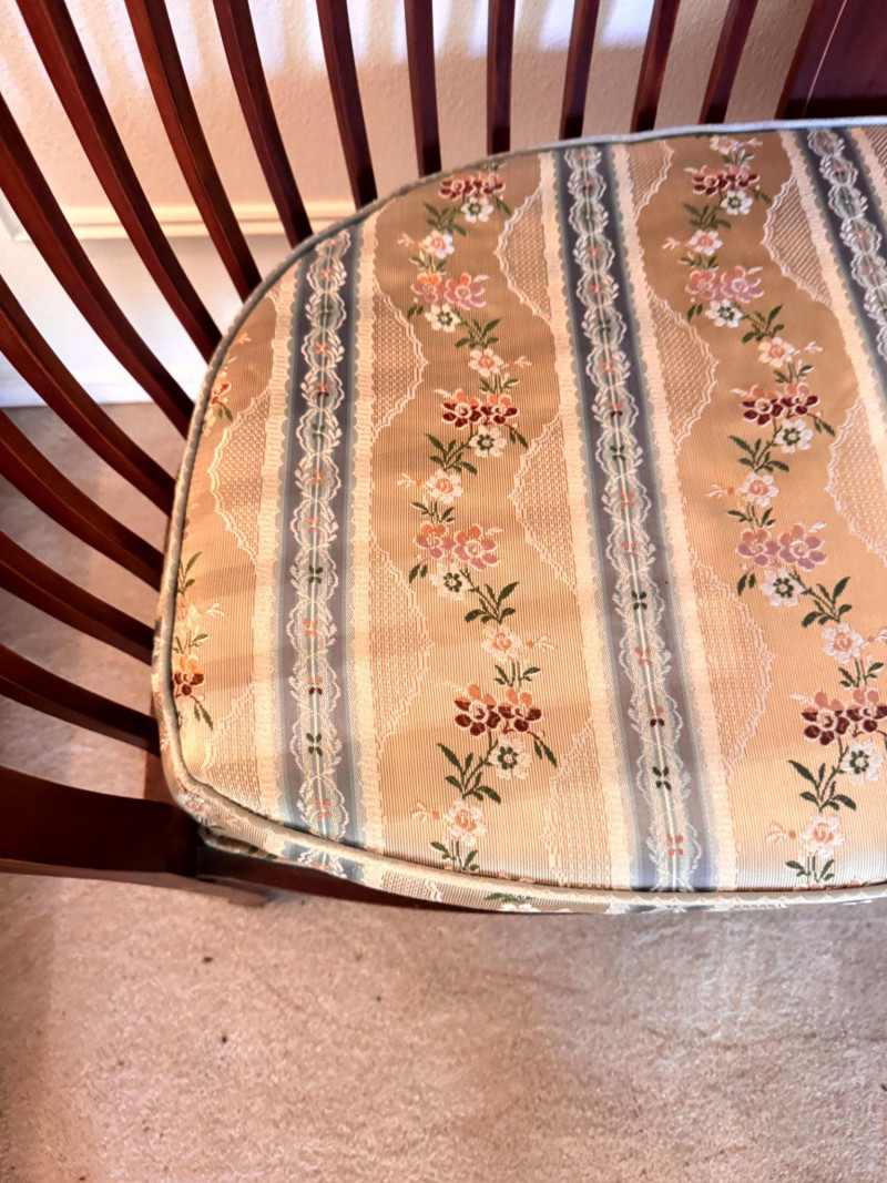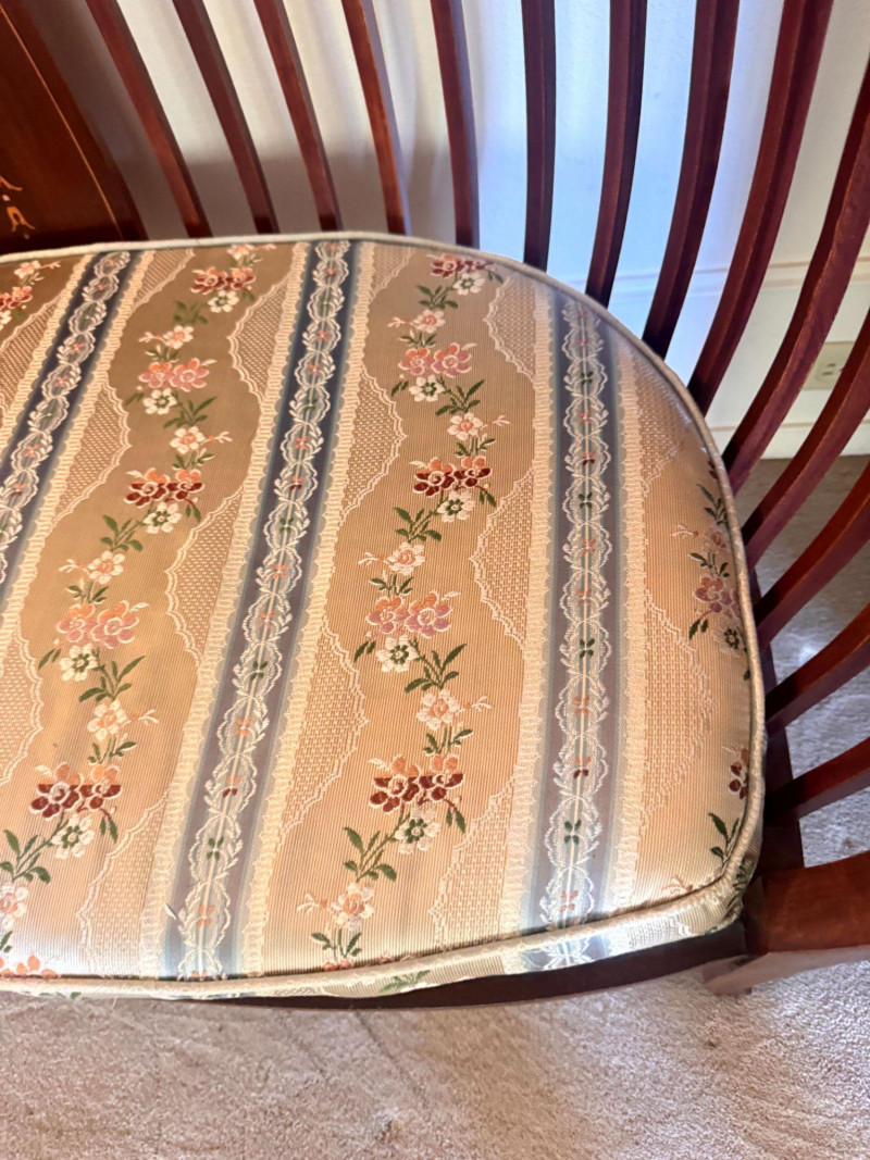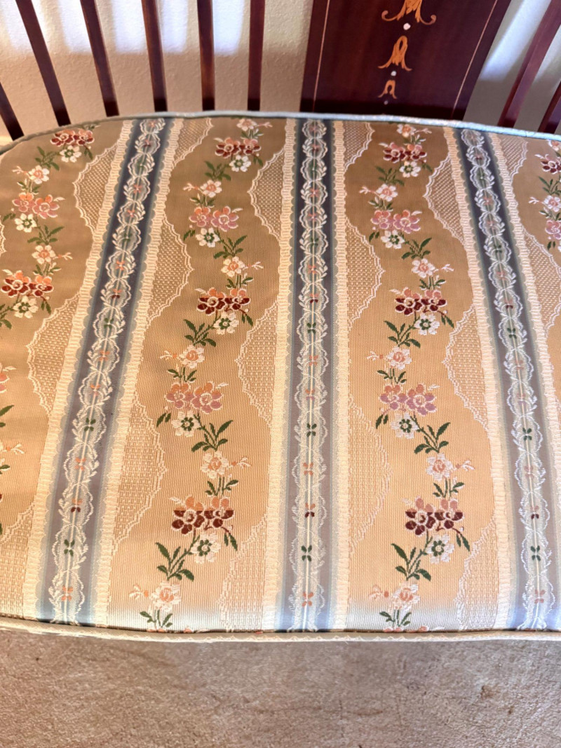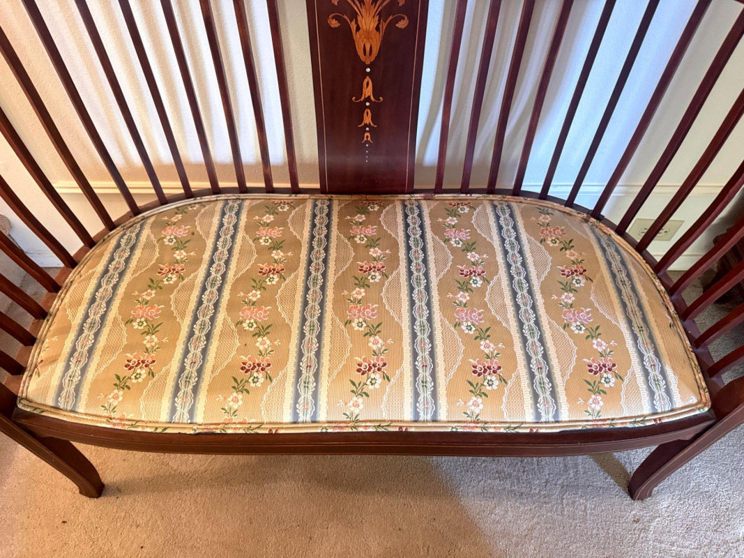 Antique Wood Settee Bench w/ Slat Back & Inlay Design, Upholstered.